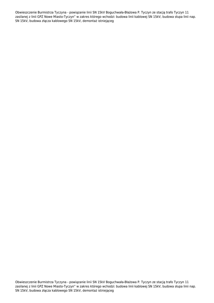 Obwieszczenie Burmistrza Tyczyna - powiązanie linii SN 15kV Boguchwała-Błażowa P. Tyczyn ze stacją trafo Tyczyn 11 zasilanej z linii GPZ Nowe Miasto-Tyczyn” w zakres którego wchodzi: budowa linii kablowej SN 15kV, budowa słupa linii nap. SN 15kV, budowa złącza kablowego SN 15kV, demontaż istniejąceg Obwieszczenie Burmistrza Tyczyna - powiązanie linii SN 15kV Boguchwała-Błażowa P. Tyczyn ze stacją trafo Tyczyn 11 zasilanej z linii GPZ Nowe Miasto-Tyczyn” w zakres którego wchodzi: budowa linii kablowej SN 15kV, budowa słupa linii nap. SN 15kV, budowa złącza kablowego SN 15kV, demontaż istniejąceg