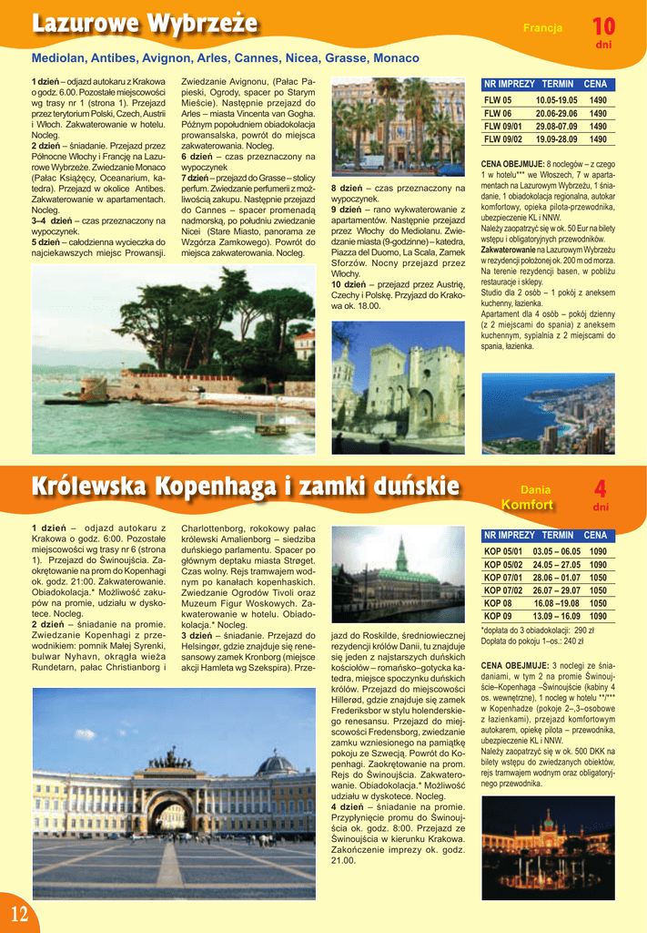 Lazurowe Wybrzeże Francja Mediolan, Antibes, Avignon, Arles, Cannes, Nicea, Grasse, Monaco 1 dzień – odjazd autokaru z Krakowa o godz. 6.00. Pozostałe miejscowości wg trasy nr 1 (strona 1). Przejazd przez terytorium Polski, Czech, Austrii i Włoch. Zakwaterowanie w hotelu. Nocleg. 2 dzień – śniadanie. Przejazd przez Północne Włochy i Francję na Lazurowe Wybrzeże. Zwiedzanie Monaco (Pałac Książęcy, Oceanarium, katedra). Przejazd w okolice Antibes. Zakwaterowanie w apartamentach. Nocleg. 3–4 dzień – czas przeznaczony na wypoczynek. 5 dzień – całodzienna wycieczka do najciekawszych miejsc Prowansji. Zwiedzanie Avignonu, (Pałac Papieski, Ogrody, spacer po Starym Mieście). Następnie przejazd do Arles – miasta Vincenta van Gogha. Późnym popołudniem obiadokolacja prowansalska, powrót do miejsca zakwaterowania. Nocleg. 6 dzień – czas przeznaczony na wypoczynek 7 dzień – przejazd do Grasse – stolicy perfum. Zwiedzanie perfumerii z możliwością zakupu. Następnie przejazd do Cannes – spacer promenadą nadmorską, po południu zwiedzanie Nicei (Stare Miasto, panorama ze Wzgórza Zamkowego). Powrót do miejsca zakwaterowania. Nocleg. NR IMPREZY TERMIN CENA FLW 05 FLW 06 FLW 09/01 FLW 09/02 8 dzień – czas przeznaczony na wypoczynek. 9 dzień – rano wykwaterowanie z apartamentów. Następnie przejazd przez Włochy do Mediolanu. Zwiedzanie miasta (9-godzinne) – katedra, Piazza del Duomo, La Scala, Zamek Sforzów. Nocny przejazd przez Włochy. 10 dzień – przejazd przez Austrię, Czechy i Polskę. Przyjazd do Krakowa ok. 18.00. Królewska Kopenhaga i zamki duńskie 1 dzień – odjazd autokaru z Krakowa o godz. 6:00. Pozostałe miejscowości wg trasy nr 6 (strona 1). Przejazd do Świnoujścia. Zaokrętowanie na prom do Kopenhagi ok. godz. 21:00. Zakwaterowanie. Obiadokolacja.* Możliwość zakupów na promie, udziału w dyskotece. Nocleg. 2 dzień – śniadanie na promie. Zwiedzanie Kopenhagi z przewodnikiem: pomnik Małej Syrenki, bulwar Nyhavn, okrągła wieża Rundetarn, pałac Christianborg i 12 Charlottenborg, rokokowy pałac królewski Amalienborg – siedziba duńskiego parlamentu. Spacer po głównym deptaku miasta Strøget. Czas wolny. Rejs tramwajem wodnym po kanałach kopenhaskich. Zwiedzanie Ogrodów Tivoli oraz Muzeum Figur Woskowych. Zakwaterowanie w hotelu. Obiadokolacja.* Nocleg. 3 dzień – śniadanie. Przejazd do Helsingør, gdzie znajduje się renesansowy zamek Kronborg (miejsce akcji Hamleta wg Szekspira). Prze- 10 dni 10.05-19.05 20.06-29.06 29.08-07.09 19.09-28.09 1490 1490 1490 1490 CENA OBEJMUJE: 8 noclegów – z czego 1 w hotelu*** we Włoszech, 7 w apartamentach na Lazurowym Wybrzeżu, 1 śniadanie, 1 obiadokolacja regionalna, autokar komfortowy, opieka pilota-przewodnika, ubezpieczenie KL i NNW. Należy zaopatrzyć się w ok. 50 Eur na bilety wstępu i obligatoryjnych przewodników. Zakwaterowanie na Lazurowym Wybrzeżu w rezydencji położonej ok. 200 m od morza. Na terenie rezydencji basen, w pobliżu restauracje i sklepy. Studio dla 2 osób – 1 pokój z aneksem kuchenny, łazienka. Apartament dla 4 osób – pokój dzienny (z 2 miejscami do spania) z aneksem kuchennym, sypialnia z 2 miejscami do spania, łazienka. Dania Komfort 4 dni NR IMPREZY TERMIN CENA KOP 05/01 KOP 05/02 KOP 07/01 KOP 07/02 KOP 08 KOP 09 jazd do Roskilde, średniowiecznej rezydencji królów Danii, tu znajduje się jeden z najstarszych duńskich kościołów – romańsko–gotycka katedra, miejsce spoczynku duńskich królów. Przejazd do miejscowości Hillerød, gdzie znajduje się zamek Frederiksbor w stylu holenderskiego renesansu. Przejazd do miejscowości Fredensborg, zwiedzanie zamku wzniesionego na pamiątkę pokoju ze Szwecją. Powrót do Kopenhagi. Zaokrętowanie na prom. Rejs do Świnoujścia. Zakwaterowanie. Obiadokolacja.* Możliwość udziału w dyskotece. Nocleg. 4 dzień – śniadanie na promie. Przypłynięcie promu do Świnoujścia ok. godz. 8:00. Przejazd ze Świnoujścia w kierunku Krakowa. Zakończenie imprezy ok. godz. 21.00. 03.05 – 06.05 24.05 – 27.05 28.06 – 01.07 26.07 – 29.07 16.08 –19.08 13.09 – 16.09 1090 1090 1050 1050 1050 1090 *dopłata do 3 obiadokolacji: 290 zł Dopłata do pokoju 1–os.: 240 zł CENA OBEJMUJE: 3 noclegi ze śniadaniami, w tym 2 na promie Świnoujście–Kopenhaga –Świnoujście (kabiny 4 os. wewnętrzne), 1 nocleg w hotelu **/*** w Kopenhadze (pokoje 2–,3–osobowe z łazienkami), przejazd komfortowym autokarem, opiekę pilota – przewodnika, ubezpieczenie KL i NNW. Należy zaopatrzyć się w ok. 500 DKK na bilety wstępu do zwiedzanych obiektów, rejs tramwajem wodnym oraz obligatoryjnego przewodnika.