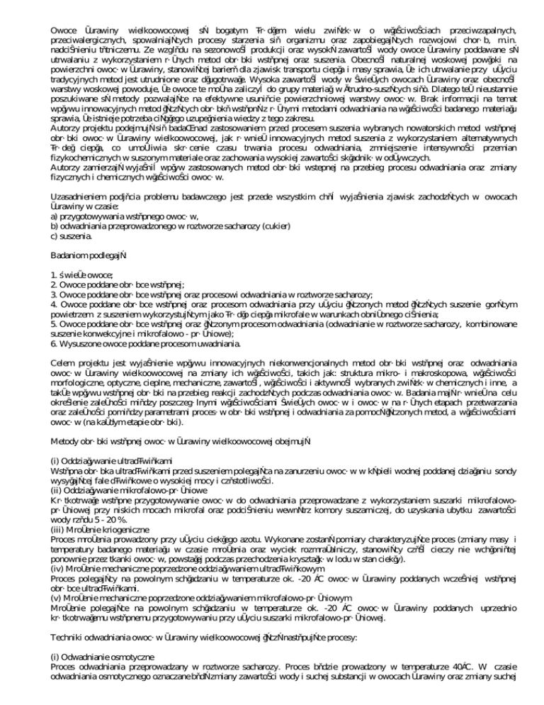 Owoce żurawiny wielkoowocowej są bogatym źródłem wielu związków o właściwościach przeciwzapalnych, przeciwalergicznych, spowalniających procesy starzenia się organizmu oraz zapobiegających rozwojowi chorób, m.in. nadciśnieniu tętniczemu. Ze względu na sezonowość produkcji oraz wysoką zawartość wody owoce żurawiny poddawane są utrwalaniu z wykorzystaniem różnych metod obróbki wstępnej oraz suszenia. Obecność naturalnej woskowej powłoki na powierzchni owoców żurawiny, stanowiącej barierę dla zjawisk transportu ciepła i masy sprawia, że ich utrwalanie przy użyciu tradycyjnych metod jest utrudnione oraz długotrwałe. Wysoka zawartość wody w świeżych owocach żurawiny oraz obecność warstwy woskowej powoduje, że owoce te można zaliczyć do grupy materiałów „trudno-suszących się”. Dlatego też nieustannie poszukiwane są metody pozwalające na efektywne usunięcie powierzchniowej warstwy owoców. Brak informacji na temat wpływu innowacyjnych metod łączących obróbkę wstępną z różnymi metodami odwadniania na właściwości badanego materiału sprawia, że istnieje potrzeba ciągłego uzupełnienia wiedzy z tego zakresu. Autorzy projektu podejmują się badań nad zastosowaniem przed procesem suszenia wybranych nowatorskich metod wstępnej obróbki owoców żurawiny wielkoowocowej, jak również innowacyjnych metod suszenia z wykorzystaniem alternatywnych źródeł ciepła, co umożliwia skrócenie czasu trwania procesu odwadniania, zmniejszenie intensywności przemian fizykochemicznych w suszonym materiale oraz zachowania wysokiej zawartości składników odżywczych. Autorzy zamierzają wyjaśnić wpływ zastosowanych metod obróbki wstepnej na przebieg procesu odwadniania oraz zmiany fizycznych i chemicznych właściwości owoców. Uzasadnieniem podjęcia problemu badawczego jest przede wszystkim chęć wyjaśnienia zjawisk zachodzących w owocach żurawiny w czasie: a) przygotowywania wstępnego owoców, b) odwadniania przeprowadzonego w roztworze sacharozy (cukier) c) suszenia. Badaniom podlegają: 1. Świeże owoce; 2. Owoce poddane obróbce wstępnej; 3. Owoce poddane obróbce wstępnej oraz procesowi odwadniania w roztworze sacharozy; 4. Owoce poddane obróbce wstępnej oraz procesom odwadniania przy użyciu łączonych metod łączących suszenie gorącym powietrzem z suszeniem wykorzystującym jako źródło ciepła mikrofale w warunkach obniżonego ciśnienia; 5. Owoce poddane obróbce wstępnej oraz łączonym procesom odwadniania (odwadnianie w roztworze sacharozy, kombinowane suszenie konwekcyjne i mikrofalowo - próżniowe); 6. Wysuszone owoce poddane procesom uwadniania. Celem projektu jest wyjaśnienie wpływu innowacyjnych niekonwencjonalnych metod obróbki wstępnej oraz odwadniania owoców żurawiny wielkoowocowej na zmiany ich właściwości, takich jak: struktura mikro- i makroskopowa, właściwości morfologiczne, optyczne, cieplne, mechaniczne, zawartość, właściwości i aktywność wybranych związków chemicznych i inne, a także wpływu wstępnej obróbki na przebieg reakcji zachodzących podczas odwadniania owoców. Badania mają również na celu określenie zależności między poszczególnymi właściwościami świeżych owoców i owoców na różnych etapach przetwarzania oraz zależności pomiędzy parametrami procesów obróbki wstępnej i odwadniania za pomocą łączonych metod, a właściwościami owoców (na każdym etapie obróbki). Metody obróbki wstępnej owoców żurawiny wielkoowocowej obejmują: (i) Oddziaływanie ultradźwiękami Wstępna obróbka ultradźwiękami przed suszeniem polegająca na zanurzeniu owoców w kąpieli wodnej poddanej działaniu sondy wysyłającej fale dźwiękowe o wysokiej mocy i częstotliwości. (ii) Oddziaływanie mikrofalowo-próżniowe Krótkotrwałe wstępne przygotowywanie owoców do odwadniania przeprowadzane z wykorzystaniem suszarki mikrofalowopróżniowej przy niskich mocach mikrofal oraz podciśnieniu wewnątrz komory suszarniczej, do uzyskania ubytku zawartości wody rzędu 5 - 20 %. (iii) Mrożenie kriogeniczne Proces mrożenia prowadzony przy użyciu ciekłego azotu. Wykonane zostaną pomiary charakteryzujące proces (zmiany masy i temperatury badanego materiału w czasie mrożenia oraz wyciek rozmrażalniczy, stanowiący część cieczy nie wchłoniętej ponownie przez tkanki owoców, powstałej podczas przechodzenia kryształków lodu w stan ciekły). (iv) Mrożenie mechaniczne poprzedzone oddziaływaniem ultradźwiękowym Proces polegający na powolnym schładzaniu w temperaturze ok. -20 °C owoców żurawiny poddanych wcześniej wstępnej obróbce ultradźwiękami. (v) Mrożenie mechaniczne poprzedzone oddziaływaniem mikrofalowo-próżniowym Mrożenie polegające na powolnym schładzaniu w temperaturze ok. -20 °C owoców żurawiny poddanych uprzednio krótkotrwałemu wstępnemu przygotowywaniu przy użyciu suszarki mikrofalowo-próżniowej. Techniki odwadniania owoców żurawiny wielkoowocowej łączą następujące procesy: (i) Odwadnianie osmotyczne Proces odwadniania przeprowadzany w roztworze sacharozy. Proces będzie prowadzony w temperaturze 40°C. W czasie odwadniania osmotycznego oznaczane będą zmiany zawartości wody i suchej substancji w owocach żurawiny oraz zmiany suchej substancji roztworu. (ii) Odwadnianie konwekcyjne Proces suszenia goracym powietrzem będzie prowadzony w temperaturze powietrza suszącego wynoszącej 80 °C. (iii) Odwadnianie mikrofalowo-próżniowe Odwadnianie przeprowadzane przy użyciu suszarki mikrofalowo-próżniowej przy niskich mocach mikrofal oraz podciśnieniu wewnątrz komory suszarniczej. Opracowane i przetestowane w ramach projektu metody określania właściwości owoców żurawiny będą mogły być wykorzystane wszędzie tam, gdzie istotne będzie szybkie i efektywne pozyskanie informacji o właściwościach materiałó biologicznych. Wiedza zdobyta w czasie realizacji projektu pozwoli na le
