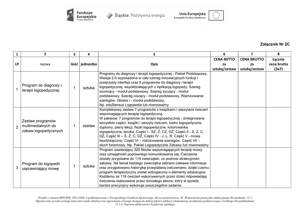 Załącznik Nr 2C 1 2 LP nazwa 3 4 ilość jednostka Program do diagnozy i 1 terapii logopedycznej 1 sztuka Zestaw programów 2 multimedialnych do zabaw logopedycznych 1 zestaw Program do logopedii 3 usprawniający mowę 1 sztuka 5 Opis 6 CENA NETTO za sztukę/zestaw 7 CENA BRUTTO za sztukę/zestaw Programy do diagnozy i terapii logopedycznej - Pakiet Podstawowy. Wersja 2.0 wyposażona w cały szereg innowacyjnych funkcji i przejrzysty interfejs oraz 5 programów do diagnozy i terapii logopedycznej, współdziałających z Aplikacją logopedy: Szereg szumiący - moduł podstawowy, Szereg syczący - moduł podstawowy, Szereg ciszący - moduł podstawowy, Różnicowanie szeregów, Głoska r - moduł podstawowy. Np. eduSensus Logopedia lub równoważny Kompleksowy zestaw 7 programów z książkami i zeszytami ćwiczeń wspomagających terapię logopedyczną. W pakiecie: 7 programów do terapii logopedycznej - zintegrowane wszystkie części, książki i zeszyty ćwiczeń, lustro logopedyczne, dyplomy, plany lekcji, fiszki logopedyczne, kolorowanka logopedyczna, teczka. Część I - SZ, Ż, CZ, DŻ, Część II - S, Z, C, DZ, Część III – Ś, Ź, Ć, DŹ, Część IV - J, L, R, Część V - mowa bezdźwięczna, Część VI – różnicowanie szeregów, Część VII – słuch fonemowy. Np. Pakiet Logopedyczne Zabawy lub równoważny Program zawierający 320 filmów wspomagających terapię mowy oraz umiejętność poprawnego komunikowania się. Ćwiczenia zostały przypisane do 119 zwierzątek, co podnosi atrakcyjność zabawy. Na temat każdego zwierzątka zebrano ciekawe informacje oraz przygotowano historyjkę przeplataną ćwiczeniami, dzięki czemu program terapeutyczny został wzbogacony o elementy edukacyjne. Każdemu ze 119 ćwiczeń wykonywanych przez dzieci odpowiadają ćwiczenia realizowane przez dorosłego aktora, który w sposób bardzo precyzyjny wykonuje poszczególne zadania. Projekt w ramach RPO WSL 2014-2020, współfinansowany z Europejskiego Funduszu Społecznego, dla osi priorytetowej: XI. Wzmocnienie potencjału edukacyjnego dla działania: 11.1. Ograniczenie przedwczesnego kończenia nauki szkolnej oraz zapewnienie równego dostępu do dobrej jakości edukacji elementarnej, kształcenia podstawowego i średniego dla poddziałania: 11.1.4. Poprawa efektywności kształcenia ogólnego. 8 Łącznie cena brutto (3x7) Zestaw 3 programów 4 wspomagających terapię logopedyczną. 1 zestaw 1 zestaw Gry logopedyczne 5 Zestaw zawiera wszystkie pozycje z opisu W programie obok ćwiczeń poszczególnych narządów mowy (warg, języka, podniebienia miękkiego, żuchwy) zawarte są ćwiczenia dłoni, fonacyjne i oddechowe. Wyboru ćwiczeń można dokonać ze względu na wiek dziecka oraz wadę wymowy. Zaletą programu jest możliwość wyboru ćwiczeń dostosowanych do terapii konkretnych głosek. Rodzaje ćwiczeń: warg, języka, podniebienia miękkiego, żuchwy, oddechowe, fonacyjne, dłoni. Przygotowanie do wypowiadania konkretnych głosek: s, z, c, dz, sz, ż, cz, dż, r, l, k, g, t, d, n, f, w, a, o, u, e, i, y, ą, ę. Typy zaburzeń: seplenienie między zębowe, seplenienie boczne, za krótkie wędzidełko podjęzykowe, opóźniony rozwój mowy, dyslalia wieloraka. Np. ZOOminki – ćwiczenia usprawniające mowę lub równoważny Zestaw 3 programów wspomagających terapię logopedyczną. Część I – sygmatyzm - Program służy do kształtowania prawidłowej wymowy głosek z, ż, cz, dż, s, z, c, dz, ś, ź, ć, dź oraz wspomagania harmonijnego rozwoju u dzieci. Przeznaczony dla dzieci w wieku od 4 do 8 lat., Część II – rotacyzm - Program dla dzieci w wieku od 4 do 8 lat. Służy do kształtowania prawidłowej wymowy głosek j, l, r oraz wspomagania harmonijnego rozwoju u dzieci, Część III - mowa bezdźwięczna - Program służy do kształtowania prawidłowej wymowy głosek dźwięcznych (b/bi, w/wi, d, z, dz, ź, dź, ż, dż, g/gi) i bezdźwięcznych (p/pi, f/fi, t, s, c, ś, ć, sz, cz, k/ki) oraz wspomagania harmonijnego rozwoju u dzieci. Przeznaczony dla dzieci w wieku od 4 do 8 lat. Np. Logoobrazki lub równoważne. Gra ma na celu rozwój mowy dziecka w wieku przedszkolnym i wczesnoszkolnym w zakresie poprawnej wymowy głosek szeregu szumiącego (sz, ż, cz, dż) oraz ciszącego (ś, ź, ć, dź), a także rozwój percepcji słuchowej. Dodatkowo dzieci ćwiczą spostrzegawczość, pamięć wzrokowo-słuchową, koncentrację uwagi oraz myślenie. Gra skierowana jest do logopedów, terapeutów, nauczycieli i rodziców, którzy pracują z dzieckiem nad poprawnością wymowy. Pudełko zawiera: 96 żetonów z obrazkami, 16 żetonów z Projekt w ramach RPO WSL 2014-2020, współfinansowany z Europejskiego Funduszu Społecznego, dla osi priorytetowej: XI. Wzmocnienie potencjału edukacyjnego dla działania: 11.1. Ograniczenie przedwczesnego kończenia nauki szkolnej oraz zapewnienie równego dostępu do dobrej jakości edukacji elementarnej, kształcenia podstawowego i średniego dla poddziałania: 11.1.4. Poprawa efektywności kształcenia ogólnego. poleceniami, dwustronną planszę, 16 pionków, kostkę do gry, instrukcję. Np. Szumi i szeleści wąż logopedyczny lub równoważna. Pomoc dydaktyczna - puzzle (30 elementów, wymiar 27x20 cm) przeznaczona do ćwiczeń w rozwijaniu myślenia i umiejętności językowych dzieci w wieku przedszkolnym oraz starszych. Po ułożeniu z puzzli obrazka należy odnaleźć na nim elementy, które są umieszczone na zewnętrznej stronie denka pudełka. Materiał obrazkowy można wykorzystać do ćwiczeń, np.: rozwijania słownika biernego (Pokaż szachy.) i czynnego (Co siedzi na oknie?), budowania zdań (Pociągiem ….), opisywania (Jak są ubrani chłopcy?), opowiadania (Co robią dzieci?) czy ćwiczeń logopedycznych (z wykorzystaniem wyrazów z wybranymi głoskami). Więcej ćwiczeń można znaleźć w instrukcji. Wyrazy z głoskami (kolory tła sygnalizują daną grupę głosek): - s, z, c, dz: pajac, statek, kl