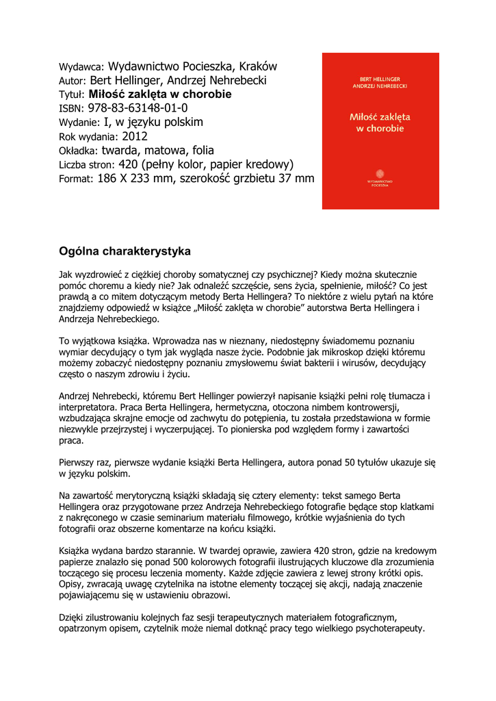 Wydawca: Wydawnictwo Pocieszka, Kraków Autor: Bert Hellinger, Andrzej Nehrebecki Tytuł: Miłość zaklęta w chorobie ISBN: 978-83-63148-01-0 Wydanie: I, w języku polskim Rok wydania: 2012 Okładka: twarda, matowa, folia Liczba stron: 420 (pełny kolor, papier kredowy) Format: 186 X 233 mm, szerokość grzbietu 37 mm Ogólna charakterystyka Jak wyzdrowieć z ciężkiej choroby somatycznej czy psychicznej? Kiedy można skutecznie pomóc choremu a kiedy nie? Jak odnaleźć szczęście, sens życia, spełnienie, miłość? Co jest prawdą a co mitem dotyczącym metody Berta Hellingera? To niektóre z wielu pytań na które znajdziemy odpowiedź w książce „Miłość zaklęta w chorobie” autorstwa Berta Hellingera i Andrzeja Nehrebeckiego. To wyjątkowa książka. Wprowadza nas w nieznany, niedostępny świadomemu poznaniu wymiar decydujący o tym jak wygląda nasze życie. Podobnie jak mikroskop dzięki któremu możemy zobaczyć niedostępny poznaniu zmysłowemu świat bakterii i wirusów, decydujący często o naszym zdrowiu i życiu. Andrzej Nehrebecki, któremu Bert Hellinger powierzył napisanie książki pełni rolę tłumacza i interpretatora. Praca Berta Hellingera, hermetyczna, otoczona nimbem kontrowersji, wzbudzająca skrajne emocje od zachwytu do potępienia, tu została przedstawiona w formie niezwykle przejrzystej i wyczerpującej. To pionierska pod względem formy i zawartości praca. Pierwszy raz, pierwsze wydanie książki Berta Hellingera, autora ponad 50 tytułów ukazuje się w języku polskim. Na zawartość merytoryczną książki składają się cztery elementy: tekst samego Berta Hellingera oraz przygotowane przez Andrzeja Nehrebeckiego fotografie będące stop klatkami z nakręconego w czasie seminarium materiału filmowego, krótkie wyjaśnienia do tych fotografii oraz obszerne komentarze na końcu książki. Książka wydana bardzo starannie. W twardej oprawie, zawiera 420 stron, gdzie na kredowym papierze znalazło się ponad 500 kolorowych fotografii ilustrujących kluczowe dla zrozumienia toczącego się procesu leczenia momenty. Każde zdjęcie zawiera z lewej strony krótki opis. Opisy, zwracają uwagę czytelnika na istotne elementy toczącej się akcji, nadają znaczenie pojawiającemu się w ustawieniu obrazowi. Dzięki zilustrowaniu kolejnych faz sesji terapeutycznych materiałem fotograficznym, opatrzonym opisem, czytelnik może niemal dotknąć pracy tego wielkiego psychoterapeuty. Sugestywny obraz to nie jedyna niespodzianka czekająca na czytelnika. Drugą są przystępne komentarze Andrzeja Nehrebeckiego do narracji Hellingera i zapisu jego pracy. Dzięki nim czytelnik może zrozumieć na czym rzeczywiście polega metoda, poznać uzasadnienie decyzji terapeutycznych i fascynujące zjawiska, które stały się niejako znakiem firmowym jego metod pracy. A zatem pokazanie od podszewki metody ustawień duchowych to kolejny atut tej lektury. Miłość – to słowo wstydliwie wykreślone ze słownika współczesnej psychoterapii, psychologii i psychiatrii. Zostało zastąpione terminami więź, przywiązanie, pozytywne odniesienie, afiliacja a nawet relacja z obiektem. Związek miłości z mechanizmami powstawania chorób jest wątkiem przewijającym się przez całą książkę. Dla czytelnika, który sam się boryka z chorobą czy nieszczęściem, jeszcze ciekawszym może być obserwowanie jak w procesie psychoterapii miłość prowadzi do wyleczenia. Książka Hellingera i Nehrebeckiego przeznaczona jest zarówno dla szerokiej publiczności jak i profesjonalistów ochrony zdrowia. Dla wielu może stać się przełomem w rozumieniu zdrowia, choroby, życia, miłości i śmierci. Metody Berta Hellingera zostały podchwycone przez profesjonalistów z różnych dziedzin. Nie można więc utożsamiać dorobku stworzonej przez niego praktyki jedynie z psychoterapią. Pedagogika i pomoc społeczna, psychoterapeutyczne wspomaganie leczenia chorób somatycznych, medycyna i medycyna alternatywna, doradztwo prawne, dramatopisarstwo, coaching, konsultacje i szkolenie biznesowe to obszary gdzie profesjonaliści zaadaptowali metody Hellingera. Zamieszczone w książce komentarze Andrzeja Nehrebeckiego umożliwiają odniesienie jej do codziennego doświadczenia czytelników. Życie dopisało do książki ciąg dalszy. Kiedy autorzy po kilku latach mogli spotkać pacjentów w niej opisanych, zmiany w nich i ich życiu okazały się niemal niewiarygodne. O autorach: Bert Hellinger – ur.1925 niemiecki psychoterapeuta i filozof. Jak napisał Helm Stierlin, jeden z protoplastów europejskiej terapii rodzin, Hellinger jest psychoterapeutą, który jak nikt wywarł pozytywny wpływ na ludzi, a jednocześnie wzbudził tak wiele kontrowersji. Po uzyskaniu formalnego wyszkolenia w psychoanalizie, poszerzał swoje umiejętności w licznych modalnościach psychoterapii, by w końcu rozwinąć unikalną metodę psychoterapii – ustawienia systemowe. Gruntowne kształcenie w psychoanalizie, terapia Gestalt, body-work, hipnoza ericksonowska, kontakt z pierwotną kulturą afrykańską, praca w roli duchownego i trening grupowy inspirowały Hellingera zanim nie rozwinął swojego niepowtarzalnego podejścia psychoterapeutycznego. Niezwykła skuteczność i niezwykła forma tego co robi przysporzyły mu wiele tysięcy uczniów i naśladowców, oraz wdzięczność ogromnej liczby wyleczonych pacjentów. Niezwykła forma tego co pisze przysporzyła mu także grono oponentów. Przez ostatnie kilkadziesiąt lat rozwija swoje metody, często zaskakując zmianami własnych uczniów wyszkolonych wcześniej. Autor licznych książek ilustrujących jego metody pracy. Sam siebie określa obecnie jako twórcę filozofii stosowanej. W ostatnich latach wspólnie z żoną prowadzi instytut szkoleniowy, nauczając na wszystkich kontynentach i skupiając się na przekazaniu swoich odkryć jak największej liczbie odbiorców. Andrzej Nehrebecki – ur.1955 polski psychoterapeuta, z wykszta