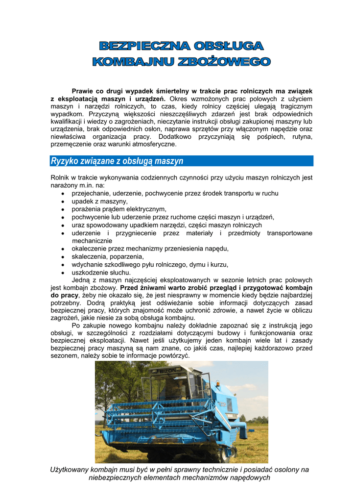 Prawie co drugi wypadek śmiertelny w trakcie prac rolniczych ma związek z eksploatacją maszyn i urządzeń. Okres wzmożonych prac polowych z użyciem maszyn i narzędzi rolniczych, to czas, kiedy rolnicy częściej ulegają tragicznym wypadkom. Przyczyną większości nieszczęśliwych zdarzeń jest brak odpowiednich kwalifikacji i wiedzy o zagrożeniach, nieczytanie instrukcji obsługi zakupionej maszyny lub urządzenia, brak odpowiednich osłon, naprawa sprzętów przy włączonym napędzie oraz niewłaściwa organizacja pracy. Dodatkowo przyczyniają się pośpiech, rutyna, przemęczenie oraz warunki atmosferyczne. Ryzyko związane z obsługą maszyn Rolnik w trakcie wykonywania codziennych czynności przy użyciu maszyn rolniczych jest narażony m.in. na: przejechanie, uderzenie, pochwycenie przez środek transportu w ruchu upadek z maszyny, porażenia prądem elektrycznym, pochwycenie lub uderzenie przez ruchome części maszyn i urządzeń, uraz spowodowany upadkiem narzędzi, części maszyn rolniczych uderzenie i przygniecenie przez materiały i przedmioty transportowane mechanicznie okaleczenie przez mechanizmy przeniesienia napędu, skaleczenia, poparzenia, wdychanie szkodliwego pyłu rolniczego, dymu i kurzu, uszkodzenie słuchu. Jedną z maszyn najczęściej eksploatowanych w sezonie letnich prac polowych jest kombajn zbożowy. Przed żniwami warto zrobić przegląd i przygotować kombajn do pracy, żeby nie okazało się, że jest niesprawny w momencie kiedy będzie najbardziej potrzebny. Dodrą praktyką jest odświeżanie sobie informacji dotyczących zasad bezpiecznej pracy, których znajomość może uchronić zdrowie, a nawet życie w obliczu zagrożeń, jakie niesie za sobą obsługa kombajnu. Po zakupie nowego kombajnu należy dokładnie zapoznać się z instrukcją jego obsługi, w szczególności z rozdziałami dotyczącymi budowy i funkcjonowania oraz bezpiecznej eksploatacji. Nawet jeśli użytkujemy jeden kombajn wiele lat i zasady bezpiecznej pracy maszyną są nam znane, co jakiś czas, najlepiej każdorazowo przed sezonem, należy sobie te informacje powtórzyć. Użytkowany kombajn musi być w pełni sprawny technicznie i posiadać osolony na niebezpiecznych elementach mechanizmów napędowych Przegląd techniczny Po okresie garażowania kombajn należy dokładnie umyć, zespół młócący i czyszczący przedmuchać sprężonym powietrzem, a następnie przystąpić do przeglądu technicznego maszyny. Przegląd i konserwację można bezpiecznie wykonać wyłącznie, gdy maszyna jest wyłączona i zabezpieczona przed przypadkowym uruchomieniem lub przetoczeniem. Podczas użytkowania, ale również przy obsłudze technicznej i konserwacji kombajnu należy ściśle stosować się do zasad bezpieczeństwa i higieny pracy określonych w instrukcji oraz przestrzegać wskazań i stosować się do treści symboli i napisów ostrzegawczych umieszczonych na maszynie. Podczas przeglądu należy sprawdzić sprawność układu kierowniczego i hamulcowego, świateł i sygnału dźwiękowego oraz stan ogumienia. Trzeba także sprawdzić szczelność przewodów olejowych i paliwowych, napięcie pasków klinowych, zacisków akumulatora i osłuchać kombajn czy pracujące elementy nie ocierają się o siebie. Każdorazowo przed uruchomieniem maszyny należy skontrolować sprawność decydujących o bezpieczeństwie obsługi elementów i podzespołów, w szczególności wszelkich pędni, przekładni kół zębatych, końcówek wałów, czopów, sprzęgieł oraz ostrych, wystających części, stan i napięcie pasów oraz łańcuchów napędowych. Źle przygotowane elementy znacznie zwiększają opory pracy agregatu i awaryjność sprzętu rolniczego, dlatego w trakcie przeglądu należy sprzęt nasmarować. Koniecznością jest nasmarowanie listwy nożowej zespołu tnącego, przegubu kulowego targańca, jak również przekładni bezstopniowej jazdy. Po zakończeniu przeglądu należy określić zakres uszkodzeń i niezwłocznie dokonać niezbędnych napraw lub wymiany zużytych części. Bezwzględnie zabronione jest przebywanie pod hederem uniesionym tylko przy użyciu siłownika hydraulicznego. W przypadku konieczności napraw lub konserwacji wykonywanych pod hederem, należy go dodatkowo zabezpieczyć mocną podporą, najlepiej drewnianym klockiem. Nieprzestrzeganie tej zasady często kończy się poważnym wypadkiem. Nie ufaj hydraulicznym podnośnikom – podeprzyj heder na czas naprawy! Po pierwsze bezpieczeństwo Regulowanie zaworów bezpieczeństwa układów hydraulicznych może odbywać się tylko w uprawnionych zakładach specjalistycznych. Jeśli zachodzi konieczność wymiany elementów instalacji elektrycznej, takich jak żarówki, czy bezpieczniki, należy pamiętać, że muszą one być zgodne z zaleceniami instrukcji obsługi danego kombajnu. Szczególnej ostrożności wymaga wymiana, naprawa i ostrzenie elementów tnących, a nawet zdejmowanie i zakładanie osłon. Te czynności należy wykonywać bez pośpiechu. Urządzeniami ochronnymi maszyn są osłony z blachy stalowej, tworzywa czy siatki metalowej, ograniczające kontakt z niebezpiecznymi częściami. Osłonięte powinny być przede wszystkim elementy napędowe – koła i pasy, przekładnie zębate, łańcuchy, wały napędowe, przeguby i końcówki wałów, części ostre i wystające poza obrys maszyny, noże i bijaki rozdrabniaczy nasion, elementy tnące. W kombajnie wszystkie oryginalne osłony zabezpieczające muszą być Osłony na elementach niebezpiecznych na swoich miejscach, uszkodzone kombajnu muszą być kompletne lub brakujące należy zastąpić i nieuszkodzone nowymi. Bezpieczny kombajn zbożowy powinien być wyposażony w: - kabinę lub podest zadaszony i zabezpieczony barierką, - żółte migające światło, tzw. „kogut”, - apteczkę pierwszej pomocy, - oznakowanie dla pojazdów wolnobieżnych lub trójkąt ostrzegawczy z tyłu maszyny, - dwie gaśnice (których sprawność na