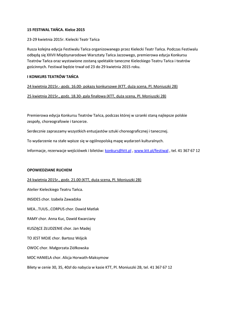 15 FESTIWAL TAŃCA. Kielce 2015 23-29 kwietnia 2015r. Kielecki Teatr Tańca Rusza kolejna edycja Festiwalu Tańca organizowanego przez Kielecki Teatr Tańca. Podczas Festiwalu odbędą się XXVII Międzynarodowe Warsztaty Tańca Jazzowego, premierowa edycja Konkursu Teatrów Tańca oraz wystawione zostaną spektakle taneczne Kieleckiego Teatru Tańca i teatrów gościnnych. Festiwal będzie trwał od 23 do 29 kwietnia 2015 roku. I KONKURS TEATRÓW TAŃCA 24 kwietnia 2015r.- godz. 16.00- pokazy konkursowe (KTT, duża scena, Pl. Moniuszki 2B) 25 kwietnia 2015r., godz. 18.30- gala finałowa (KTT, duża scena, Pl. Moniuszki 2B) Premierowa edycja Konkursu Teatrów Tańca, podczas której w szranki staną najlepsze polskie zespoły, choreografowie i tancerze. Serdecznie zapraszamy wszystkich entuzjastów sztuki choreograficznej i tanecznej. To wydarzenie na stałe wpisze się w ogólnopolską mapę wydarzeń kulturalnych. Informacje, rezerwacje wejściówek i biletów: [email protected] , www.ktt.pl/festiwal , tel. 41 367 67 12 OPOWIEDZIANE RUCHEM 24 kwietnia 2015r., godz. 21.00 (KTT, duża scena, Pl. Moniuszki 2B) Atelier Kieleckiego Teatru Tańca. INSIDES chor. Izabela Zawadzka MEA…TUUS…CORPUS chor. Dawid Matlak RAMY chor. Anna Kuc, Dawid Kwarciany KUSZĄCE ZŁUDZENIE chor. Jan Madej TO JEST MOJE chor. Bartosz Wójcik OWOC chor. Małgorzata Ziółkowska MOC HANIELA chor. Alicja Horwath-Maksymow Bilety w cenie 30, 35, 40zł do nabycia w kasie KTT, Pl. Moniuszki 2B, tel. 41 367 67 12 POLSKI TEATR TAŃCA 25 kwietnia 2015r., godz. 21.00 (KTT, duża scena, Pl. Moniuszki 2B) ALBUM Z TEGO ŚWIATA chor. Ewa Wycichowska EFEKT HALO chor. Daniel Stryjecki Bilety w cenie 30, 35, 40zł do nabycia w kasie KTT, Pl. Moniuszki 2B, tel. 41 367 67 12 GLIWICKI TEATR MUZYCZNY 28 kwietnia 2015r., godz. 19.00 (KTT, duża scena, Pl. Moniuszki 2B) I HAVE A DREAM chor. Roger Lybeck I Jan Åström W tanecznym show „I Have a Dream” szekspirowska historia opowiedziana zostanie za pomocą muzyki legendarnej szwedzkiej grupy ABBA. Ze sceny zabrzmią takie jej przeboje, jak „Mamma Mia”, „Take a Chance on Me”, „Honey, Honey”, „Thank You for the Music” czy tytułowy „I Have a Dream”. Autorami choreografii spektaklu oraz jego reżyserami są szwedzcy artyści Roger Lybeck, choreograf czołowych teatrów musicalowych i operowych Sztokholmu, Malmö i Göteborga (m.in. „A Chorus Line”, „Hair”, „Evita”, „Miss Saigon”), oraz Jan Åström, reżyser oraz choreograf takich musicalowych przebojów jak „Avenue Q” czy „Rent”, dyrektor artystyczny szwedzkiego zespołu Modern Jazz Dance Ensemble, mający również na koncie m.in. choreografię konkursów Eurowizji. Bilety w cenie 50, 80, 100zł do nabycia w kasie KTT, Pl. Moniuszki 2B, tel. 41 367 67 12 JAZZ DANCE BACK AND FORTH 29 kwietnia 2015r., godz. 19.00 (KTT, duża scena, Pl. Moniuszki 2B) Idea Elżbieta Szlufik-Pańtak Chor. Bill Goodson Bilety w cenie 30, 40, 50zł do nabycia w kasie KTT, Pl. Moniuszki 2B, tel. 41 367 67 12 XXVII MIĘDZYNARODOWE WARSZTATY TAŃCA JAZZOWEGO 23-26 kwietnia 2015r STACY BOEDDEKER- contemporary jazz ERIC BACON- contemporary, lyrical, modern jazz ZIEMOWIT BOGUSŁAWSKI “SIEMEK”- locking JOYSS- swing jazz, authentic RICK ODUMS- jazz NATE POOLE- hip hop THIERRY VERGER- modal technique, underground Zapisy [email protected] Informacje, rezerwacja wejściówek i biletów [email protected] [email protected] [email protected] lub telefonicznie 41 367 67 12.
