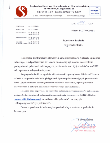 I Regionalne Centrum Krwiodawstwa i Krwiolecznictwa 25-734 Kielce, ul. Jagiellońska NIP: 959-l3-16-649 REGON: 66 ((P-~ /\ TtNNORD) 000291776-00029 Polska PN-EN e-mail: sekretariat@rckik-kielce. com.pl www.rckik-kielce.com.pl L.dz CENTRALA: tel. 41 335-94-00 DYREKTOR: tel. 41 335-94-01 SEKRETARIAT: tel. 41345-21-14 fax. 41 345-21-13 BANK TKANEK: tel. 41368-17-22 fax.41311-42-13 ISO 9001 ~ 02gc2<f .J./ . /2016 Kielce, dn. 27.09.2016 r. Dyrektor Szpitala OŚRODEK tel. 41335-94-01 DAWCÓW SZPIKU: fax. 41345-21-13 wg rozdzielnika Regionalne Centrum Krwiodawstwa i Krwiolecznictwa w Kielcach uprzejmie informuje, iż od października 2016 roku zmienia się tryb naboru na szkolenia pielęgniarek i położnych dokonujących przetaczania krwi i jej składników na 2017 rok, opisany w załączniku do pisma. Pragnę nadmienić, że zgodnie z Projektem Rozporządzenia Ministra Zdrowia z 2016 r. w sprawie szkolenia pielęgniarek i położnych dokonujących przetaczania krwi i jej składników, zostaną zmienione niektóre określenia, tryb wydawania zaświadczeń o odbytym szkoleniu oraz wzór tego zaświadczenia. Ponadto chcę zapewnić, że wszystkie informacje związane z w/w szkoleniami podane będą również od października br. na stronie internetowej RCKiK Kielce: www.rckik-kielce.com.pl w zakładce "Do pobrania" - w pozycji: "Dla pielęgniarek/rzy i położnych". Proszę o przekazanie informacji odpowiedzialnym osobom w podmiocie leczniczym. mir Jerzy Stalrnasinski