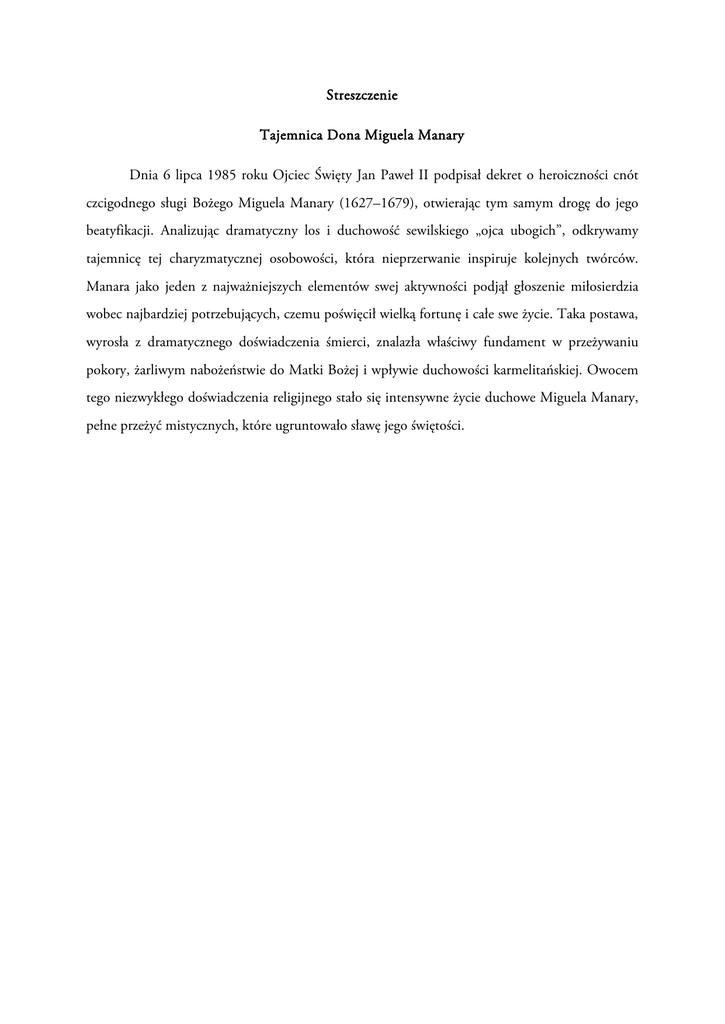 Streszczenie Tajemnica Dona Miguela Manary Dnia 6 lipca 1985 roku Ojciec Święty Jan Paweł II podpisał dekret o heroiczności cnót czcigodnego sługi Bożego Miguela Manary (1627–1679), otwierając tym samym drogę do jego beatyfikacji. Analizując dramatyczny los i duchowość sewilskiego „ojca ubogich”, odkrywamy tajemnicę tej charyzmatycznej osobowości, która nieprzerwanie inspiruje kolejnych twórców. Manara jako jeden z najważniejszych elementów swej aktywności podjął głoszenie miłosierdzia wobec najbardziej potrzebujących, czemu poświęcił wielką fortunę i całe swe życie. Taka postawa, wyrosła z dramatycznego doświadczenia śmierci, znalazła właściwy fundament w przeżywaniu pokory, żarliwym nabożeństwie do Matki Bożej i wpływie duchowości karmelitańskiej. Owocem tego niezwykłego doświadczenia religijnego stało się intensywne życie duchowe Miguela Manary, pełne przeżyć mistycznych, które ugruntowało sławę jego świętości.