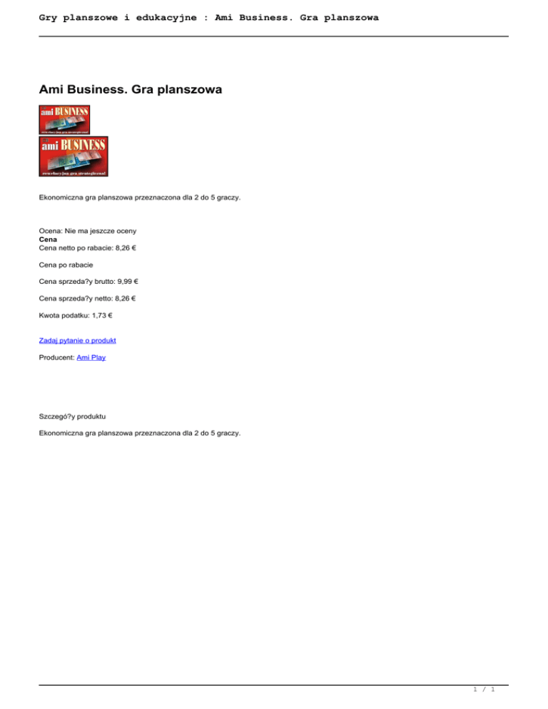 Gry planszowe i edukacyjne : Ami Business. Gra planszowa Ami Business. Gra planszowa Ekonomiczna gra planszowa przeznaczona dla 2 do 5 graczy. Ocena: Nie ma jeszcze oceny Cena Cena netto po rabacie: 8,26 € Cena po rabacie Cena sprzeda?y brutto: 9,99 € Cena sprzeda?y netto: 8,26 € Kwota podatku: 1,73 € Zadaj pytanie o produkt Producent: Ami Play Szczegó?y produktu Ekonomiczna gra planszowa przeznaczona dla 2 do 5 graczy. 1 / 1 Powered by TCPDF (www.tcpdf.org)