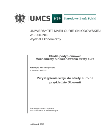 UNIWERSYTET MARII CURIE-SKŁODOWSKIEJ W LUBLINIE Wydział Ekonomiczny Studia podyplomowe: Mechanizmy funkcjonowania strefy euro Katarzyna Anna Filipowska nr albumu: 9355101 Przystąpienie kraju do strefy euro na przykładzie Słowenii Praca dyplomowa napisana pod kierunkiem dr Moniki Wojtas Lublin rok 2015 1 Spis treści Wstęp....................................................................................................................... 4 1. Koszty i korzyści z przystąpienia do unii walutowej ...................................... 6 2. Droga kraju członkowskiego Unii Europejskiej do przystąpienia do strefy euro.............................................................................................................. 10 2.1 Kryteria uczestnictwa w strefie euro ...................................................... 10 2.2 Procedura wejścia do ERM II i strefy euro ............................................ 13 2.3 Praktyczne aspekty przygotowania i wprowadzenia waluty euro do obiegu 14 Droga Słowenii do strefy euro ....................................................................... 17 3. 3.1 Gospodarka Słowenii przed przystąpieniem do strefy euro ................... 17 3.2 Przygotowania do wprowadzenia euro w Słowenii ............................... 19 3.3 Spełnienie kryteriów konwergencji ........................................................ 21 3.4 Wprowadzenie euro do obiegu-zamiana tolara na euro ......................... 23 4. Sytuacja gospodarcza Słowenii po wejściu do strefy euro ........................ 25 Zakończenie .......................................................................................................... 31 Literatura ............................................................................................................... 33 Spis tabel i wykresów ........................................................................................... 34 2 3 Wstęp Dnia 1 stycznia 1999r. na obszarze 11 z 15 krajów Unii Europejskiej wprowadzono wspólną walutę, euro. Początkowo w systemie płatności bezgotówkowych, a w 2002r. waluty 11 krajów zastąpiono jedną walutą. Od tego momentu euro weszło do obiegu gotówkowego oraz rozpoczął się proces wycofywania pieniądza narodowego z obiegu w tych krajach. Obecnie w grupie państw, w których obowiązuje wspólna waluta-euro jest 19 krajów. Kraje należące do Unii Walutowej prowadzą wspólną politykę pieniężną, zadanie to zostało powierzone Europejskiemu Bankowi Centralnemu. Obecnie każdy kraj, który wstępuje do Unii Europejskiej, zobowiązuję się także po spełnieniu kryteriów konwergencji, do wstąpienia do Unii Gospodarczej i Walutowej, czyli zastąpienia swojej narodowej waluty-wspólną walutą euro. Jednak zmiana waluty budzi wiele kontrowersji, czy na pewno będzie to korzystny proces. Przystąpienie do wspólnej waluty wiąże się z wieloma korzyściami, ale uczestnictwo w unii walutowej niesie ze sobą również koszty. Słowenia przystępując do Unii Europejskiej w 2004 roku wraz z innymi dziewięcioma krajami zobowiązała się również do wejścia do strefy euro. Po wypełnieniu szeregu kryteriów gospodarczych, kryteriów konwergencji przyjęła wspólną walutę w 2007 roku. Była jednym z pierwszych nowych krajów członkowskich, który przyjęły euro. Praca ma na celu analizę mechanizmu wprowadzenia euro na przykładzie Słowenii. Początkowo opisano koszty i korzyści, jakie niesie za sobą przyjęcie wspólnej waluty. Następnie poddano analizie kryteria uczestnictwa w strefie auro oraz opisano przygotowania kraju z derogacją do wprowadzenia nowej waluty do obiegu. Poddano analizie słoweńską gospodarkę oraz opisano szereg przygotowań, które miały miejsce przed przystąpieniem do unii monetarnej. Następnie została 4 przedstawiona sytuacja zamiany słoweńskiego tolara na euro oraz zmiany jakie nastąpiły w słoweńskiej gospodarce po wprowadzeniu euro. 5 1. Koszty i korzyści z przystąpienia do unii walutowej Państwo przystępując do unii monetarnej wiąże się utratą możliwości prowadzenia na szczeblu krajowym polityki pieniężnej oraz przejęciem w tym zakresie kompetencji przez ponadnarodową instytucję, realizującą politykę pieniężną dostosowaną do sytuacji gospodarczej na całym obszarze unii. Zadania te przejmuje Europejski Bank Centralny. Decyzje, które są podejmowane przez EBC mają na celu dobro wszystkich krajów UGiW, a nie wybranych. Powoduje to potencjalny koszt uczestnictwa w strefie euro. Może się pojawić w przypadku występowania znacznych różnic w rozwoju kraju szok asymetryczny, którego doświadczałby kraj w stosunku do pozostałych gospodarek unii. Gdyby bank krajowy miał swobodę działania, to zneutralizowałby swoimi działaniami szok popytowy czy podażowy. Bank centralny kraju UE z chwilą przystąpienia do strefy euro traci możliwość zarządzania narzędziami monetarnymi: stopami procentowymi, podażą pieniądza, kursem walutowym, jest podporządkowany decyzjom EBC w zakresie polityki monetarnej.1 Dlatego też ważne jest, aby kraje uczestniczące w unii monetarnej miały jak najbardziej zbliżone do siebie struktury gospodarcze, ponieważ zmniejsza to ryzyko wystąpienia w poszczególnych gospodarkach szoków o charakterze asymetrycznym.2 Poziom rozwoju gospodarczego kraju strefy euro ma również duże znaczenie. W skład unii wchodzą kraje o różnym poziomie rozwoju, więc polityka monetarna może nie być dobra dla wszystkich. Szczególne znaczenie mają tutaj stopy procentowe, dla kraju o niższym poziomie rozwoju, obniżenie stóp procentowych może doprowadzić do wzrostu popytu, boomu na rynku kredytowym, istnieje zatem ryzyko przegrzania się gospodarki. Zaś w krajach o wyższym od średniego poziomu rozwoju gospodarczego, stopy procentowe 1 M. Wajda-Lichy, Marek A. Dąbrowski Strategie rozszerzenia strefy euro, Wyd. UE w Krakowie, Kraków 2010, s. 35 2 A. Krajewska, M.