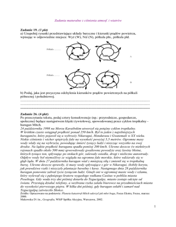 Zadania maturalne z ciśnienia atmosf. i wiatrów Zadanie 19. (3 pkt) a) Uzupełnij rysunki przedstawiające układy baryczne i kierunki prądów powietrza, wpisując w odpowiednie miejsca: Wyż (W), Niż (N), półkula płn., półkula płd. b) Podaj, jaka jest przyczyna odchylenia kierunków prądów powietrznych na półkuli północnej i południowej. ...................................................................................................................................................... ...................................................................................................................................................... ...................................................................................................................................................... Zadanie 26. (4 pkt) Po przeczytaniu tekstu, podaj cztery konsekwencje (np.: przyrodnicze, gospodarcze, społeczne) będące następstwem klęski żywiołowej, spowodowanej przez cyklon tropikalny huragan Mitch. 24 października 1998 na Morzu Karaibskim utworzył się potężny cyklon tropikalny. W krótkim czasie osiągnął prędkość ponad 250 km/h. Był to jeden z najsilniejszych huraganów, który pojawił się u wybrzeży Nikaragui, Hondurasu i Gwatemali w XX wieku. Niskie ciśnienie i wicher spiętrzyły fale na wysokość powyżej 5,5 metrów. Ogromne masy wody wlały się na wybrzeża, powodując śmierć tysięcy ludzi i niszcząc wszystko na swej drodze. Na lądzie prędkość huraganu spadła poniżej 200 km/h. Ulewne deszcze (w niektórych rejonach spadło około 500 mm) spwowdowały gwałtowne powodzie oraz lawiny błotne, których tysiące ton, spływając po stokach gór, zalewały osiedla, drogi i nieliczne autostrady. Odpływ wody był niemożliwy ze względu na ogromne fale morskie, które wdzierały się w głąb lądu. W dniu 27 października huragan wiał z mniejszą siłą i zmienił się w tropikalną burzę. Ulewne deszcze sprawiły, iż masy wody spływające z gór w Nikaragui, żłobiły koryta, jak prawdziwe rzeki i niszczyły plantacje bawełny i kawy. Następnego dnia 28 października huragan ponownie zabrał życie tysiącom ludzi. Ginęli oni w ogromnej masie wody i szlamu, który wylewał się z pękniętego krateru wygasłego wulkanu Casitas w pobliżu miasta Poseltoga. Gdy woda trzy dni później dotarła do Tegucigalpy, miasto zostaje odcięte od świata. Przestają działać telefony, a wezbrana rzeka zalała biurowce na przedmieściach miasta do wysokości pierwszego piętra. W kilka dni później, gdy huragan osłabł i zamarł nad Tegucigalpą zaświeciło Słońce. Źródło: Opracowano na podstawie: Planeta katastrof-Mitch uderzył jak młot boga, Focus Ekstra, Focus, marzec 2000. Makowska D i in., Geografia, WSiP Spółka Akcyjna, Warszawa, 2002. 1 Zadania maturalne z ciśnienia atmosf. i wiatrów ...................................................................................................................................................... ...................................................................................................................................................... ...................................................................................................................................................... ...................................................................................................................................................... ...................................................................................................................................................... ................................................................................................................................................................... ...................................................................................................................................................... ................................................................................................................................................................... ................................................................................................................................................................... ...................................................................................................................................................... ................................................................................................................................................................... ...................................................................................................................................................... ................................................................................................................................................................... Zadanie 41. (4 pkt) Uzupełnij poniższy schemat, tak aby przedstawiał cyrkulację powietrza w strefie międzyzwrotnikowej: a) wpisz odpowiednie wartości szerokości geograficznych zwrotników w miejsca kropek, b) dorysuj na schemacie strzałki określające kierunki przemieszczania się mas powietrza oraz wpisz w odpowiednich kwadratach litery oznaczające obszar wysokiego (W) i niskiego (N) ciśnienia atmosferycznego. c) podaj nazwę wiatru wiejącego w dolnej warstwie troposfery - ....................................... d) podkreśl trzy cechy, które dotyczą wyżej wymienionego wiatru: wilgotny, suchy, ciepły, chłodny, okresowy, stały. Zadanie 79. (2 pkt) Ofiary śmiertelne wśród ludności to najtragiczniejszy skutek występowania cyklonów tropikalnych. Bardzo dużo ofiar śmiertelnych było skutkiem wystąpienia cyklonów tropikalnych w Bangladeszu, kraju położonym w delcie Gangesu i Brahmaputry. W 1970 r. zginęło tam około 300 tysięcy osób, a w 1991 r. około 140 tysięcy. Skutkiem przejścia cyklonów tropikalnych są również katastrofalne zni