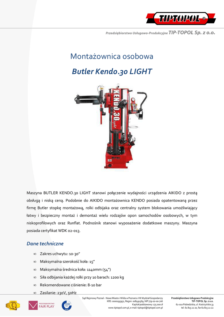 Montażownica osobowa Butler Kendo.30 LIGHT Maszyna BUTLER KENDO.30 LIGHT stanowi połączenie wydajności urządzenia AIKIDO z prostą obsługą i niską ceną. Podobnie do AIKIDO montażownica KENDO posiada opatentowaną przez firmę Butler stopkę montażową, rolki odbijaka oraz centralny system blokowania umożliwiający łatwy i bezpieczny montaż i demontaż wielu rodzajów opon samochodów osobowych, w tym niskoprofilowych oraz Runflat. Podnośnik stanowi wyposażenie dodatkowe maszyny. Maszyna posiada certyfikat WDK 02-013. Dane techniczne • Zakres uchwytu: 10-30” • Maksymalna szerokość koła: 15” • Maksymalna średnica koła: 1140mm (54”) • Siła odbijania każdej rolki przy 10 barach: 1200 kg • Rekomendowane ciśnienie: 8-10 bar • Zasilanie: 230V, 50Hz Sąd Rejonowy Poznań - Nowe Miasto i Wilda w Poznaniu VIII Wydział Gospodarczy KRS: 0000195952, Regon: 008491569, NIP:779-00-00-706 Kapitał podstawowy: 175.000 zł www.tiptopol.com.pl, e-mail: [email protected] Przedsiębiorstwo Usługowo-Produkcyjne TIP-TOPOL Sp. z o.o. 62-010 Pobiedziska, ul. Kostrzyńska 33 tel. 61 815 22 20, fax 61 815 22 22 • Waga: 330 kg • Wymiary (wysokość x głębokość x szerokość): 1470x1070x1735 mm • Wysokość centralnego uchwytu mocującego koło: 767 mm Informacje ogólne • specjalnie wyprofilowana stopka montażowa pracuje bezpośrednio na brzegu obręczy wywierając minimalny nacisk na stopki opony, • stopki odbijane są przy użyciu plastikowych rolek podczas obrotu koła, • silnik elektryczny z inwerterem, • opatentowany centralny system mocowania koła z regulowaną wysokością, • ergonomiczny uchwyt sterowniczy, • pompowanie opon przy użyciu pedału, Wyposażenie standardowe • dolna i górna stopka montażowa, • dwie rolki odbijaka • ergonomiczny uchwyt sterowniczy, • mała łyżka, • system umożliwiający pompowanie opon przy użyciu pedału, • plastikowa osłona na centralny system blokowania, • odbijak pneumatyczny Zalety maszyny Mechanizm mocujący koło Centralny mechanizm mocujący składa się z trzpienia i ze stożka. Samoczynnie blokujący. Jeśli koło nie jest poprawnie zamocowane, automatyczny system mocujący wyrówna jego położenie. Sąd Rejonowy Poznań - Nowe Miasto i Wilda w Poznaniu VIII Wydział Gospodarczy KRS: 0000195952, Regon: 008491569, NIP:779-00-00-706 Kapitał podstawowy: 175.000 zł www.tiptopol.com.pl, e-mail: [email protected] Przedsiębiorstwo Usługowo-Produkcyjne TIP-TOPOL Sp. z o.o. 62-010 Pobiedziska, ul. Kostrzyńska 33 tel. 61 815 22 20, fax 61 815 22 22 Stopki montażowe Górna stopka montażowa jest wyjątkowym, opatentowanym przyrządem do montażu. Stopka wykonana jest z plastiku, aby uniknąć uszkodzenia obręczy. Rolka zbijaka Rolki obu odbijaków znajdujące się naprzeciw siebie odbijają dolną i górną stopkę opony szybko i bezpiecznie, jedną po drugiej. Ruch odbijaków kontrolowany jest przez system elektroniczny. Dla odmiany w AIKIDO ruch rolek kontrolowany jest ręcznie, a nie za pomocą czujników. W przeciwieństwie do AIKIDO, montażownica KENDO nie wykorzystuje dwóch niezależnych cylindrów pneumatycznych. W niektórych przypadkach może wystąpić konieczność opuszczenia lub podniesienia jednej rolki aby odbić, którąś ze stopek opony. Sąd Rejonowy Poznań - Nowe Miasto i Wilda w Poznaniu VIII Wydział Gospodarczy KRS: 0000195952, Regon: 008491569, NIP:779-00-00-706 Kapitał podstawowy: 175.000 zł www.tiptopol.com.pl, e-mail: [email protected] Przedsiębiorstwo Usługowo-Produkcyjne TIP-TOPOL Sp. z o.o. 62-010 Pobiedziska, ul. Kostrzyńska 33 tel. 61 815 22 20, fax 61 815 22 22 Panel sterujący KENDO posiada łatwy w obsłudze uchwyt sterowniczy. Poziomy ruch rolek kontrolowany jest ręcznie przy pomocy dźwigni. Penetracja rolek odbijaka za krawędzią obręczy jest półautomatyczna. Operację tę wykonuje się wciskając czarne przyciski z przodu uchwytu sterowniczego. Wszystkie pozostałe ruchy kontrolowane są za pomocą żółtych przycisków. Kontrolowanie prędkości obrotu koła Silnik pracuje przy użyciu inwertera. Inwerter, który kontrolowany jest przy użyciu pedału, stale reguluje prędkość obrotu w zakresie od 0 do 14 obr/min. Silnik automatycznie dostosowuje prędkość obrotu do siły działającej z przeciwnej strony, zmniejszając w ten sposób nacisk na oponę podczas montażu/demontażu i tym samym unikając uszkodzenia opony. Sąd Rejonowy Poznań - Nowe Miasto i Wilda w Poznaniu VIII Wydział Gospodarczy KRS: 0000195952, Regon: 008491569, NIP:779-00-00-706 Kapitał podstawowy: 175.000 zł www.tiptopol.com.pl, e-mail: [email protected] Przedsiębiorstwo Usługowo-Produkcyjne TIP-TOPOL Sp. z o.o. 62-010 Pobiedziska, ul. Kostrzyńska 33 tel. 61 815 22 20, fax 61 815 22 22 Ustawienie średnicy obręczy Urządzenie posiada możliwość ustawienia pracy w zakresie trzech różnych średnic obręczy 10” – 26”, 12”-28”, 14” – 30”. Aby zmienić średnicę należy przesunąć kolumnę montażu koła w odpowiednie miejsce. Aby to zrobić, należy odkręcić kilka śrub, przesunąć kolumnę do tyłu i na nowo dokręcić śruby. Urządzenie ma fabrycznie ustawioną średnicę obręczy na 10” – 26”. Wyposażenie dodatkowe Nr katalogowy Opis BUG1000A69 Górna stopka montażowa BUG1000A89 Zdjęcie Górna stopka montażowa z dodatkowym zabezpieczeniem BUG1000A90 Zabezpieczenie do BUG1000A89 BUG1000A81K Gumowa osłona na obręcze obrócone BUG1000A60K Plastikowa osłona na centralny system mocowania Sąd Rejonowy Poznań - Nowe Miasto i Wilda w Poznaniu VIII Wydział Gospodarczy KRS: 0000195952, Regon: 008491569, NIP:779-00-00-706 Kapitał podstawowy: 175.000 zł www.tiptopol.com.pl, e-mail: [email protected] Przedsiębiorstwo Usługowo-Produkcyjne TIP-TOPOL Sp. z o.o. 62-010 Pobiedziska, ul. Kostrzyńska 33 tel. 61 815 22 20, fax 61 815 22 22 BUG1000A72 Uchwyt do obręczy bez otworowych BUG1000A66K Plastik ochronny systemu mocowa