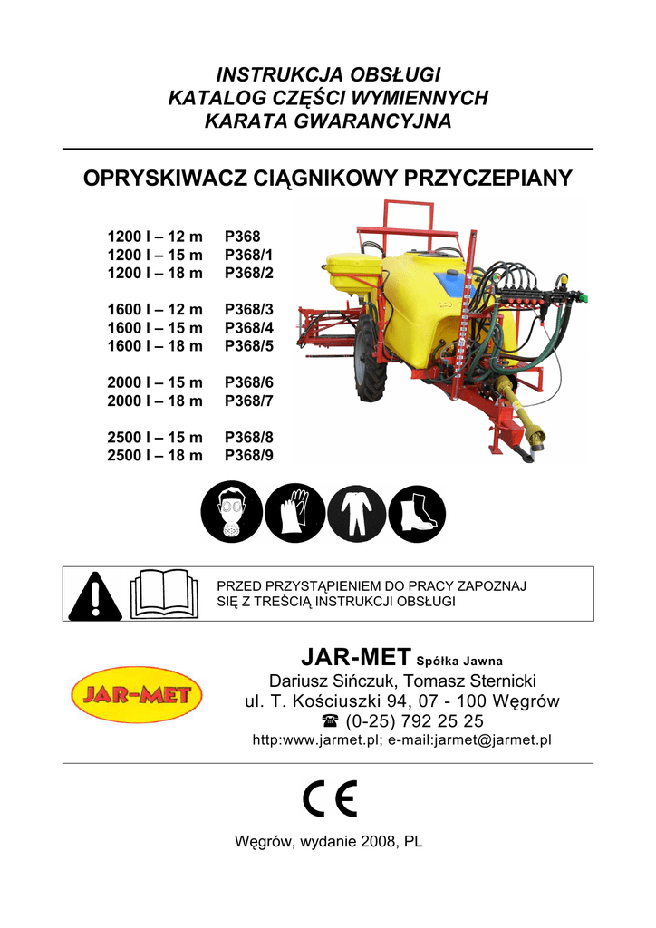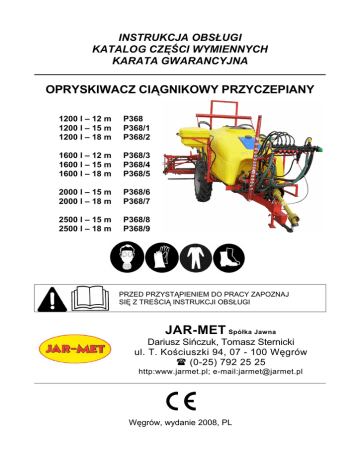 INSTRUKCJA OBSŁUGI KATALOG CZĘŚCI WYMIENNYCH KARATA GWARANCYJNA OPRYSKIWACZ CIĄGNIKOWY PRZYCZEPIANY 1200 l – 12 m 1200 l – 15 m 1200 l – 18 m P368 P368/1 P368/2 1600 l – 12 m 1600 l – 15 m 1600 l – 18 m P368/3 P368/4 P368/5 2000 l – 15 m 2000 l – 18 m P368/6 P368/7 2500 l – 15 m 2500 l – 18 m P368/8 P368/9 PRZED PRZYSTĄPIENIEM DO PRACY ZAPOZNAJ SIĘ Z TREŚCIĄ INSTRUKCJI OBSŁUGI JAR-MET Spółka Jawna Dariusz Sińczuk, Tomasz Sternicki ul. T. Kościuszki 94, 07 - 100 Węgrów (0-25) 792 25 25 http:www.jarmet.pl; e-mail:[email protected] Węgrów, wydanie 2008, PL JAR-MET Spółka Jawna Dariusz Sińczuk, Tomasz Sternicki ul. T.Kościuszki 94, 07-100 Węgrów tel. (025) 792 25 25 http:www.jarmet.pl; e-mail:[email protected] Deklaracja zgodności WE dla maszyny zgodnie z Dyrektywą Parlamentu Europejskiego i Rady 98/37/WE, załącznik II/A deklarujemy z pełną odpowiedzialnością, Ŝe maszyna: Maszyna: OPRYSKIWACZ CIĄGNIKOWY PRZYCZEPIANY Typ/model: Rok produkcji: do której odnosi się niniejsza deklaracja spełnia wymagania: Dyrektywy Parlamentu Europejskiego i Rady 98/37/WE wdroŜonej Rozp. Ministra Gospodarki z 20.12.2005 (Dz.U. Nr 259, poz. 2170) Zostały zastosowane następujące normy zharmonizowane: PN EN ISO 12100-1:2005 PN EN ISO 12100-1:2005 PN-EN ISO 4254-1:2006 PN-EN 294:1994 PN-EN 907: 2002 Ta deklaracja zgodności WE traci swoją waŜność, jeŜeli maszyna zostanie zmieniona lub przebudowana bez naszej zgody. .......................................................... .......................................................... Miejsce i data wystawienia Nazwisko, imię i stanowisko osoby upowaŜnionej do podpisywania 2 IDENTYFIKACJA OPRYSKIWACZ CIĄGNIKOWY PRZYCZEPIANY Dane umieszczone na tabliczce znamionowej słuŜą do identyfikacji opryskiwacza i powinny odpowiadać poniŜszym danym wpisanym przy sprzedaŜy. Symbol ________________________________ Rok produkcji ___________________________ Nr fabryczny ____________________________ Opryskiwacz posiada tabliczkę znamionową umieszczoną na zaczepie z lewej strony. Tabliczka zawiera podstawowe dane słuŜące do identyfikacji maszyny. OPRYSKIWACZE CIĄGNIKOWE PRZYCZEPIANE P368/8 (2500 l, 15 m) I P368/9 (2500 l, 18 m) NIE SĄ PRZYSTOSOWANE DO RUCHU PO DROGACH PUBLICZNYCH. ZALECA SIĘ, ABY DOSTAWCA MASZYN, ZARÓWNO NOWYCH JAK I UśYWANYCH, ZACHOWAŁ PODPISANE PRZEZ NABYWCĘ POTWIERDZENIE ODBIORU INSTRUKCJI WRAZ Z MASZYNĄ UWAGA PRZY UśYCZANIU OPRYSKIWACZA OSOBOM DRUGIM, MASZYNĘ NALEśY PRZEKAZAĆ W STANIE PEŁNEJ SPRAWNOŚCI TECHNICZNEJ WRAZ Z INSTRUKCJĄ OBSŁUGI INSTRUKCJA OBSŁUGI STANOWI PODSTAWOWE WYPOSAśENIE MASZYNY ZACHOWAĆ DO PRZYSZŁEGO UśYTKU 3 SPIS TREŚCI 1. WPROWADZENIE ------------------------------------------------------------------------------------------ 6 2. PRZEZNACZENIE OPRYSKIWACZA----------------------------------------------------------------- 6 3. UWAGI DOTYCZĄCE BEZPIECZEŃSTWA I OSTRZEśENIA --------------------------------- 6 3.1. SYMBOLE: ZNACZENIE I STOSOWANIE ----------------------------------------------------------------- 6 3.2. PRZEWIDYWANE UśYTKOWANIE ------------------------------------------------------------------------ 7 3.3. PRZEWIDYWANE ZAGROśENIA PRZY EKSPLOATACJI OPRYSKIWACZA----------------------------- 7 3.4. OPIS I OCENA RYZYKA SZCZĄTKOWEGO --------------------------------------------------------------- 8 3.5. OGÓLNE ZASADY BEZPIECZEŃSTWA ------------------------------------------------------------------- 9 3.6. BEZPIECZNA PRACA Z ŚRODKAMI OCHRONY ROŚLIN----------------------------------------------- 13 3.7. OCHRONA ŚRODOWISKA ------------------------------------------------------------------------------- 14 3.8. ZGODNOŚĆ Z NORMAMI -------------------------------------------------------------------------------- 15 3.9. ODPOWIEDZIALNOŚĆ PRODUCENTA I GWARANCJA ------------------------------------------------ 16 3.10. HAŁAS I DRGANIA -------------------------------------------------------------------------------------- 16 3.11. ZNAKI BEZPIECZEŃSTWA I NAPISY ------------------------------------------------------------------ 16 4. INFORMACJE DOTYCZĄCE UśYTKOWANIA--------------------------------------------------- 19 4.1. INFORMACJE OGÓLNE ---------------------------------------------------------------------------------- 19 4.2. BUDOWA I DZIAŁANIE ----------------------------------------------------------------------------------- 20 4.3. UKŁAD OBIEGU CIECZY --------------------------------------------------------------------------------- 21 4.4. W YPOSAśENIE I OSPRZĘT ----------------------------------------------------------------------------- 23 4.5. PRZYGOTOWANIE CIĄGNIKA DO PRACY -------------------------------------------------------------- 23 4.6. PRZYGOTOWANIE OPRYSKIWACZA DO PRACY ------------------------------------------------------ 24 4.7. AGREGATOWANIE OPRYSKIWACZA Z CIĄGNIKIEM -------------------------------------------------- 24 4.7.1. Agregatowanie na dolnym zaczepie-------------------------------------------------------- 24 4.7.2. Agregatowanie na cięgnach ciągnika ------------------------------------------------------ 24 4.8. NAPEŁNIANIE I OPRÓśNIANIE ZBIORNIKA------------------------------------------------------------- 25 4.9. CZYNNOŚCI ZWIĄZANE Z PIERWSZYM URUCHOMIENIEM OPRYSKIWACZA ---------------------- 26 5. ZASADY REGULACJI OPRYSKIWACZA---------------------------------------------------------- 26 6. WYKONYWANIE ORAZ ZASADY USTAWIENIA WYMAGANEJ DAWKI OPRYSKU 28 6.1. USTAWIENIE DAWKI OPRYSKU ------------------------------------------------------------------------ 28 6.2. KALIBRACJA OPRYSKIWACZA - PRÓBA OPRYSKU--------------------------------------------------- 30 6.3. DOBÓR STĘśENIA CIECZY ------------------------------------------------------------------------------ 32 6.4. PRACA OPRYSKIWACZEM ------------------------------------------------------------------------------ 32 7. INSTRUKCJE OBSŁUGI W