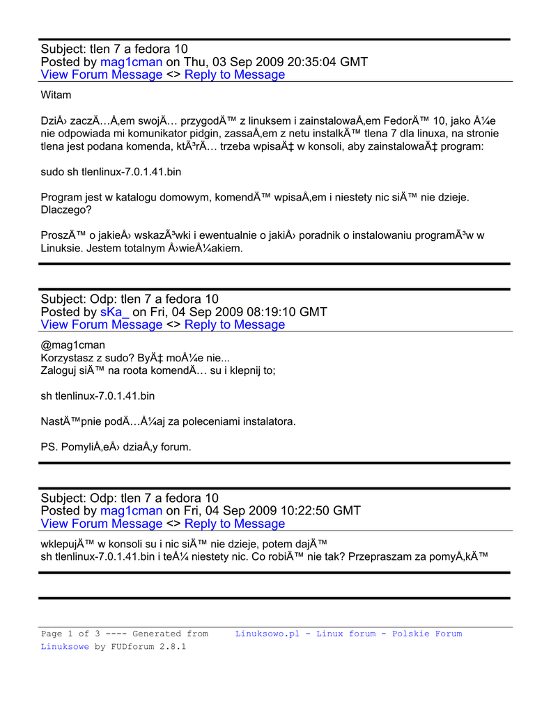 Subject: tlen 7 a fedora 10 Posted by mag1cman on Thu, 03 Sep 2009 20:35:04 GMT View Forum Message <> Reply to Message Witam Dziś zacząłem swoją przygodę z linuksem i zainstalowałem Fedorę 10, jako że nie odpowiada mi komunikator pidgin, zassałem z netu instalkę tlena 7 dla linuxa, na stronie tlena jest podana komenda, którą trzeba wpisać w konsoli, aby zainstalować program: sudo sh tlenlinux-7.0.1.41.bin Program jest w katalogu domowym, komendę wpisałem i niestety nic się nie dzieje. Dlaczego? Proszę o jakieś wskazówki i ewentualnie o jakiś poradnik o instalowaniu programów w Linuksie. Jestem totalnym świeżakiem. Subject: Odp: tlen 7 a fedora 10 Posted by sKa_ on Fri, 04 Sep 2009 08:19:10 GMT View Forum Message <> Reply to Message @mag1cman Korzystasz z sudo? Być może nie... Zaloguj się na roota komendą su i klepnij to; sh tlenlinux-7.0.1.41.bin Następnie podążaj za poleceniami instalatora. PS. Pomyliłeś działy forum. Subject: Odp: tlen 7 a fedora 10 Posted by mag1cman on Fri, 04 Sep 2009 10:22:50 GMT View Forum Message <> Reply to Message wklepuję w konsoli su i nic się nie dzieje, potem daję sh tlenlinux-7.0.1.41.bin i też niestety nic. Co robię nie tak? Przepraszam za pomyłkę Page 1 of 3 ---- Generated from Linuksowe by FUDforum 2.8.1 Linuksowo.pl - Linux forum - Polskie Forum Subject: Odp: tlen 7 a fedora 10 Posted by sKa_ on Fri, 04 Sep 2009 11:18:26 GMT View Forum Message <> Reply to Message mag1cman napisał(a) dnia pi�, 04 wrzesie� 2009 12:22wklepuję w konsoli su i nic się nie dzieje, potem daję sh tlenlinux-7.0.1.41.bin i też niestety nic. Co robię nie tak? Przepraszam za pomyłkę W konsoli dajesz su i w polu Hasło:/Password: wpisujesz hasło superużytkownika (piszesz i nie widzisz żadnych gwiazdek - względy bezpieczeństwa). Następnie, przechodzisz do katalogu, w którym zapisałeś instalkę - dla przykładu katalog domowy użytkownika mag1cman; cd /home/mag1cman Potem odpalasz instalkę, tak jak pisałem w moim poprzednim poście - musi śmigać. Subject: Odp: tlen 7 a fedora 10 Posted by mag1cman on Fri, 04 Sep 2009 12:48:30 GMT View Forum Message <> Reply to Message Podstawowy błąd robiłem w momencie uruchamiania konsoli, ponieważ naciskałem alt+f2n i myślałem, że to jest konsola, ale później znalazłem terminal. Zalogowałem się na superusera, wpisałem polecenie instalacji i gucio bo plik w katalogu domowym był jeszcze w katalogu "pobrane". Dopiero wyciągnąłem plik z pobranych i polecenie zadziałało. Szkoda tylko, że wtyczka gadu w tym tlenie nie działa. Dziękuję wszystkim za odpowiedzi, pozdrawiam Subject: Odp: tlen 7 a fedora 10 Posted by sKa_ on Sat, 05 Sep 2009 10:09:14 GMT View Forum Message <> Reply to Message mag1cman napisał(a) dnia pi�, 04 wrzesie� 2009 02:48Podstawowy błąd robiłem w momencie uruchamiania konsoli, ponieważ naciskałem alt+f2n i myślałem, że to jest konsola, ale później znalazłem terminal. Zalogowałem się na superusera, wpisałem polecenie instalacji i gucio bo plik w katalogu domowym był jeszcze w katalogu "pobrane". Dopiero wyciągnąłem plik z pobranych i polecenie zadziałało. Szkoda tylko, że Page 2 of 3 ---- Generated from Linuksowe by FUDforum 2.8.1 Linuksowo.pl - Linux forum - Polskie Forum wtyczka gadu w tym tlenie nie działa. Dziękuję wszystkim za odpowiedzi, pozdrawiam Równie dobrze mogłeś odpalić instalkę, będąc już superużytkownikiem, w ten sposób; sh ścieżka_do_instalki/tlenlinux-7.0.1.41.bin , czyli w Twoim wypadku; sh /home/mag1cman/pobrane/tlenlinux-7.0.1.41.bin Przeedytuj swój pierwszy post, dodając [ROZW.] przed nazwą wątku. Dzięki. Subject: Odp: tlen 7 a fedora 10 Posted by adamb on Sat, 05 Sep 2009 12:28:50 GMT View Forum Message <> Reply to Message mag1cman napisał(a) dnia pi�, 04 wrzesie� 2009 02:48...Szkoda tylko, że wtyczka gadu w tym tlenie nie działa... U mnie działa. Fedora11, tlenlinux64-7.0.1.41 Nie testowałem tylko rozmów głosowych/video. Subject: Odp: tlen 7 a fedora 10 Posted by Emde on Sat, 05 Sep 2009 13:18:40 GMT View Forum Message <> Reply to Message Aż z ciekawości zainstalowałem i GG u mnie również działa :). Tak BTW, to całkiem niezły ten Tlen. Subject: Odp: tlen 7 a fedora 10 Posted by adam.chyla on Sat, 05 Sep 2009 15:35:23 GMT View Forum Message <> Reply to Message adamb napisał(a) dnia sob, 05 wrzesie� 2009 02:28 Nie testowałem tylko rozmów głosowych/video. Od tego jest Skype, który radzi sobie dużo lepiej. Page 3 of 3 ---- Generated from Linuksowe by FUDforum 2.8.1 Linuksowo.pl - Linux forum - Polskie Forum