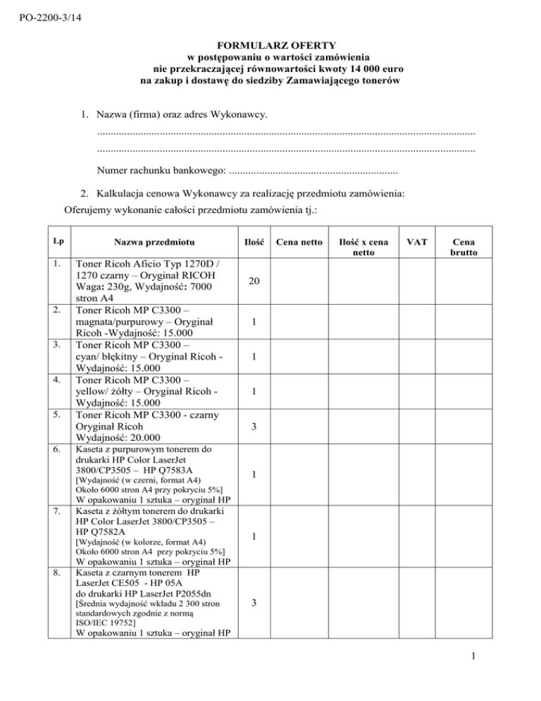 PO-2200-3/14 FORMULARZ OFERTY w postępowaniu o wartości zamówienia nie przekraczającej równowartości kwoty 14 000 euro na zakup i dostawę do siedziby Zamawiającego tonerów 1. Nazwa (firma) oraz adres Wykonawcy. ........................................................................................................................................... ........................................................................................................................................... Numer rachunku bankowego: .............................................................. 2. Kalkulacja cenowa Wykonawcy za realizację przedmiotu zamówienia: Oferujemy wykonanie całości przedmiotu zamówienia tj.: Lp 1. 2. 3. 4. 5. 6. Nazwa przedmiotu Toner Ricoh Aficio Typ 1270D / 1270 czarny – Oryginał RICOH Waga: 230g, Wydajność: 7000 stron A4 Toner Ricoh MP C3300 – magnata/purpurowy – Oryginał Ricoh -Wydajność: 15.000 Toner Ricoh MP C3300 – cyan/ błękitny – Oryginał Ricoh Wydajność: 15.000 Toner Ricoh MP C3300 – yellow/ żółty – Oryginał Ricoh Wydajność: 15.000 Toner Ricoh MP C3300 - czarny Oryginał Ricoh Wydajność: 20.000 Kaseta z purpurowym tonerem do drukarki HP Color LaserJet 3800/CP3505 – HP Q7583A [Wydajność (w czerni, format A4) Około 6000 stron A4 przy pokryciu 5%] 7. W opakowaniu 1 sztuka – oryginał HP Kaseta z żółtym tonerem do drukarki HP Color LaserJet 3800/CP3505 – HP Q7582A [Wydajność (w kolorze, format A4) Około 6000 stron A4 przy pokryciu 5%] 8. Ilość Cena netto Ilość x cena netto VAT Cena brutto 20 1 1 1 3 1 1 W opakowaniu 1 sztuka – oryginał HP Kaseta z czarnym tonerem HP LaserJet CE505 - HP 05A do drukarki HP LaserJet P2055dn [Średnia wydajność wkładu 2 300 stron standardowych zgodnie z normą ISO/IEC 19752] 3 W opakowaniu 1 sztuka – oryginał HP 1 PO-2200-3/14 9. Kaseta z czarnym tonerem HP LaserJet Q7553A 53A do drukarki HP LaserJet P2015d [Wydajność (w czerni, format A4) 3 000 stron standardowych zgodnie z normą ISO/IEC 19752] 2 W opakowaniu 1 sztuka – oryginał HP Okres gwarancji na tonery: 12 miesięcy za cenę netto: ........................................................ zł., a wraz z należnym podatkiem VAT w wysokości ........................% za cenę brutto: ................................................... zł.; 3. Oświadczam, iż zapoznałem się z opisem przedmiotu zamówienia i wymogami Zamawiającego i nie wnoszę do nich żadnych zastrzeżeń. Miejscowość ................................................, dnia ......................................2014 roku. ....................................................................................... (pieczęć i podpis osoby uprawnionej do składania oświadczeń woli w imieniu Wykonawcy) 2