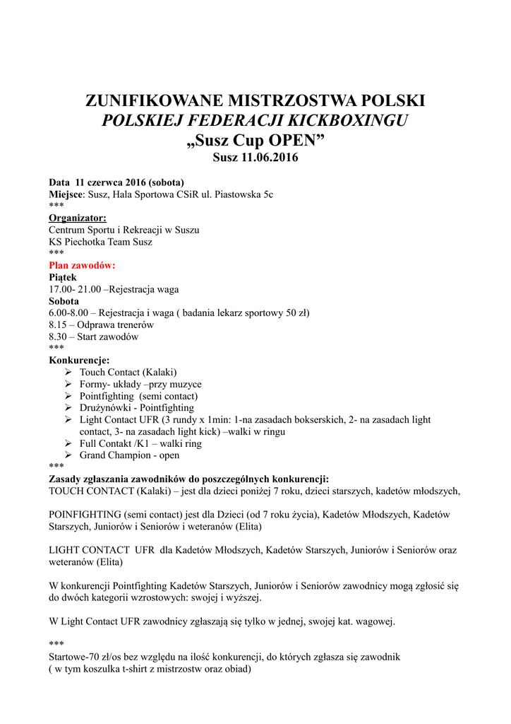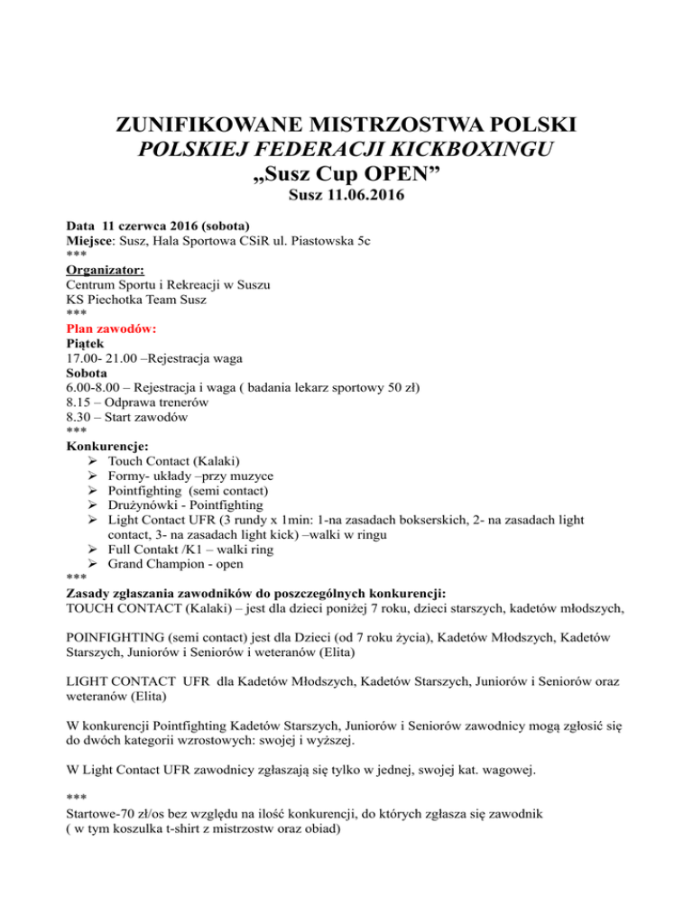 ZUNIFIKOWANE MISTRZOSTWA POLSKI POLSKIEJ FEDERACJI KICKBOXINGU „Susz Cup OPEN” Susz 11.06.2016 Data 11 czerwca 2016 (sobota) Miejsce: Susz, Hala Sportowa CSiR ul. Piastowska 5c *** Organizator: Centrum Sportu i Rekreacji w Suszu KS Piechotka Team Susz *** Plan zawodów: Piątek 17.00- 21.00 –Rejestracja waga Sobota 6.00-8.00 – Rejestracja i waga ( badania lekarz sportowy 50 zł) 8.15 – Odprawa trenerów 8.30 – Start zawodów *** Konkurencje: Touch Contact (Kalaki) Formy- układy –przy muzyce Pointfighting (semi contact) Drużynówki - Pointfighting Light Contact UFR (3 rundy x 1min: 1-na zasadach bokserskich, 2- na zasadach light contact, 3- na zasadach light kick) –walki w ringu Full Contakt /K1 – walki ring Grand Champion - open *** Zasady zgłaszania zawodników do poszczególnych konkurencji: TOUCH CONTACT (Kalaki) – jest dla dzieci poniżej 7 roku, dzieci starszych, kadetów młodszych, POINFIGHTING (semi contact) jest dla Dzieci (od 7 roku życia), Kadetów Młodszych, Kadetów Starszych, Juniorów i Seniorów i weteranów (Elita) LIGHT CONTACT UFR dla Kadetów Młodszych, Kadetów Starszych, Juniorów i Seniorów oraz weteranów (Elita) W konkurencji Pointfighting Kadetów Starszych, Juniorów i Seniorów zawodnicy mogą zgłosić się do dwóch kategorii wzrostowych: swojej i wyższej. W Light Contact UFR zawodnicy zgłaszają się tylko w jednej, swojej kat. wagowej. *** Startowe-70 zł/os bez względu na ilość konkurencji, do których zgłasza się zawodnik ( w tym koszulka t-shirt z mistrzostw oraz obiad) *** Kategorie wiekowe: Dzieci Młodsze- poniżej 7 lat Dzieci Starsze – ukończone 7,8,9 lat Kadeci Młodsi – ukończone 10,11,12 lat Kadeci Starsi – ukończone 13,14,15 lat Juniorzy – ukończone 16,17 lat Seniorzy – ukończone 18 lat i starsi Kategorie wzrostowe konkurencji dzieci młodsze – Touch Contact: Podział według zgłoszeń Kategorie wzrostowe konkurencji dzieci starszych – Pointfighting i Touch Contact: 125 cm, - 135 cm, -145 cm, - 155 cm, + 155 cm Kategorie wzrostowe konkurencji kadetów młodszych – Pointfighting i Touch Contact: 135 cm, -145 cm, - 155 cm, + 155 cm Kategorie wzrostowe Pointfighting: Kadeci Starsi: dziewczęta - 155 cm, - 165 cm, + 165 cm chłopcy - 150 cm, - 160 cm, - 170 cm, + 170 cm Juniorzy: kobiety - 160 cm, - 170 cm, + 170 cm mężczyźni - 175 cm, - 185 cm, + 185 cm Seniorzy: kobiety - 160 cm, - 170 cm, + 170 cm mężczyźni - 175 cm, - 185 cm, + 185 cm Kategorie wagowe Light Contact UFR: Kadeci Młodsi: dziewczęta - 35 kg, - 40 kg, - 45 kg, - 50 kg, + 50 kg chłopcy - 30 kg, - 35 kg, - 40 kg, - 45 kg, - 50 kg, - 55 kg, + 55 kg Kadeci Starsi: dziewczęta - 45 kg, - 50 kg, - 55 kg, + 55 kg chłopcy - 45 kg, - 50 kg, - 55 kg, - 60 kg, - 65 kg, + 65 kg Juniorzy: kobiety - 50 kg, - 55 kg, - 60 kg, + 60 kg mężczyźni - 60 kg, - 65 kg, - 70 kg, - 75 kg, - 80 kg, + 80 kg Seniorzy: kobiety - 50 kg, - 55 kg, - 60 kg, + 60 kg mężczyźni - 60 kg, - 65 kg, - 70 kg, - 75 kg, - 80 kg, - 85 kg, - 90 kg, + 90 kg *** Warunki uczestnictwa z zawodach: W zawodach mogą wziąć udział zawodniczki i zawodnicy spełniający następujące warunki: -Potwierdzone ubezpieczenie -Aktualne badania lekarskie wpisane do książeczki sportowca -Uiszczenie opłaty startowej w wysokości 70 złotych od osoby startującej - Zgłoszenie przesłane na formularzu do wyznaczonej przez organizatora daty tj. 3 czerwca 2016r. - Oświadczenie podpisane przez trenera lub kierownika ekipy (podczas rejestracji) Koszty obsługi sędziowskiej: Opłata klubowa na pokrycie kosztów sędziowania imprezy (od drużyny liczącej 6 zawodników): 100 zł – jeśli klub nie posiada sędziego z licencją PFKB. 0 zł – jeśli klub posiada sędziego z licencją PFKB (licencję należy okazać podczas rejestracji. UWAGA: sędziowie i praktykanci mają obowiązek pozostać do końca zawodów. ZASADY REJESTRACJI I REGULAMIN W celu sprawnego przeprowadzenie imprezy i aby sprostać oczekiwaniom uczestników i trenerów oraz zapewnić możliwość szybkiego powrotu do domu wprowadzamy następujące zasady rejestracji i uczestnictwa w zawodach: 1. Zgłoszenia przyjmowane są tylko do wyznaczonej daty tj. 3 czerwca 2016 br. 2. Drabinki przygotowywane są odpowiednio wcześniej przed datą zawodów i nie wprowadzamy już do nich żadnych zmian aby maksymalnie uprościć i zapewnić sprawne rozpoczęcie turnieju. 3. Startowe pobierane jest od każdego zgłoszonego zawodnika (bez zmian, dopisywania po terminie itp.) Jeśli klub zgłosił zawodnika a ten nie dojechał to startowe i tak będzie pobierane. Proponujemy aby trenerzy sami wcześniej zbierali startowe od zawodników. 4. Podczas rejestracji sprawdzamy badania i wyrywkowo ważymy wybranych zawodników np z konkretnej drużyny. UWAGA! W razie przesłania błędnego zgłoszenia zawodnik zostaje zdyskwalifikowany. Jeśli zawodnik nie dojechał to traktujemy to jak nie stawienie się do walki, przeciwnik przechodzi dalej. Zgłoszenia prosimy wysyłać na adres: [email protected] tel. Kontakt do organizatora: Jarosław Piechotka tel. 502755394 Zapraszamy! Co warto wiedzieć? O czym warto pamiętać! 1. Dzieci Starsze i Kadeci Młodsi mają obowiązek, we własnym zakresie, posiadać kaski z "maskami" chroniącymi twarz. UWAGA Nie podlega to żadnym wyjątkom. Dbajmy o bezpieczeństwo najmłodszych uczestników. 2. Organizator nie zapewnia sprzętu do walki. Posiadajmy choćby kilka kompletów bezpiecznego regulaminowego sprzętu (ochraniacze piszczeli, ochraniacze stóp, ochraniacz krocza, kask, szczęka, rękawice, ochraniacze piersi u kobiet). "Rozbite", uszkodzone rękawice nie będą honorowane. 3. Ochraniacze na piersi u kobiet obowiązkowe są u Juniorek i Seniorek, zalecane w młodszych grupach wiekowych. Ochraniacze krocza obowiązkowe są u wszystkich mężczyzn i chłopców a zalecane u kobiet i dziewczynek Zalecane są także ochraniacze zębów u dzieci które regulaminowo walczą w kaskach z "mask