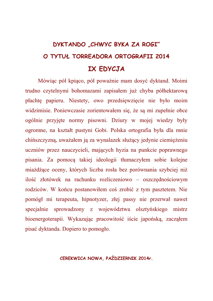 DYKTANDO „CHWYC BYKA ZA ROGI” O TYTUŁ TORREADORA ORTOGRAFII 2014 IX EDYCJA Mówiąc pół kpiąco, pół poważnie mam dosyć dyktand. Moimi trudno czytelnymi bohomazami zapisałem już chyba półhektarową płachtę papieru. Niestety, owo przedsięwzięcie nie było moim widzimisie. Poniewczasie zorientowałem się, że są mi zupełnie obce ogólnie przyjęte normy pisowni. Dziury w mojej wiedzy były ogromne, na kształt pustyni Gobi. Polska ortografia była dla mnie chińszczyzną, uważałem ją za wynalazek służący jedynie ciemiężeniu uczniów przez nauczycieli, mających hyzia na punkcie poprawnego pisania. Za pomocą takiej ideologii tłumaczyłem sobie kolejne miażdżące oceny, których liczba rosła bez porównania szybciej niż ilość złotówek na rachunku rozliczeniowo – oszczędnościowym rodziców. W końcu postanowiłem coś zrobić z tym pasztetem. Nie pomógł mi terapeuta, hipnotyzer, złej passy nie przerwał nawet specjalnie sprowadzony z województwa olsztyńskiego mistrz bioenergoterapii. Wykazując pracowitość iście japońską, zacząłem pisać dyktanda. Dopiero to pomogło. CEREKWICA NOWA, PAŹDZIERNIK 2014r.