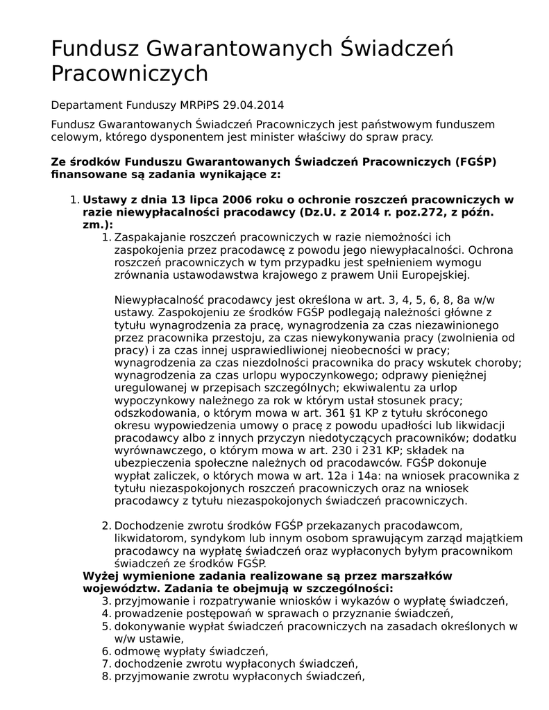 Fundusz Gwarantowanych Świadczeń Pracowniczych Departament Funduszy MRPiPS 29.04.2014 Fundusz Gwarantowanych Świadczeń Pracowniczych jest państwowym funduszem celowym, którego dysponentem jest minister właściwy do spraw pracy. Ze środków Funduszu Gwarantowanych Świadczeń Pracowniczych (FGŚP) finansowane są zadania wynikające z: 1. Ustawy z dnia 13 lipca 2006 roku o ochronie roszczeń pracowniczych w razie niewypłacalności pracodawcy (Dz.U. z 2014 r. poz.272, z późn. zm.): 1. Zaspakajanie roszczeń pracowniczych w razie niemożności ich zaspokojenia przez pracodawcę z powodu jego niewypłacalności. Ochrona roszczeń pracowniczych w tym przypadku jest spełnieniem wymogu zrównania ustawodawstwa krajowego z prawem Unii Europejskiej. Niewypłacalność pracodawcy jest określona w art. 3, 4, 5, 6, 8, 8a w/w ustawy. Zaspokojeniu ze środków FGŚP podlegają należności główne z tytułu wynagrodzenia za pracę, wynagrodzenia za czas niezawinionego przez pracownika przestoju, za czas niewykonywania pracy (zwolnienia od pracy) i za czas innej usprawiedliwionej nieobecności w pracy; wynagrodzenia za czas niezdolności pracownika do pracy wskutek choroby; wynagrodzenia za czas urlopu wypoczynkowego; odprawy pieniężnej uregulowanej w przepisach szczególnych; ekwiwalentu za urlop wypoczynkowy należnego za rok w którym ustał stosunek pracy; odszkodowania, o którym mowa w art. 361 §1 KP z tytułu skróconego okresu wypowiedzenia umowy o pracę z powodu upadłości lub likwidacji pracodawcy albo z innych przyczyn niedotyczących pracowników; dodatku wyrównawczego, o którym mowa w art. 230 i 231 KP; składek na ubezpieczenia społeczne należnych od pracodawców. FGŚP dokonuje wypłat zaliczek, o których mowa w art. 12a i 14a: na wniosek pracownika z tytułu niezaspokojonych roszczeń pracowniczych oraz na wniosek pracodawcy z tytułu niezaspokojonych świadczeń pracowniczych. 2. Dochodzenie zwrotu środków FGŚP przekazanych pracodawcom, likwidatorom, syndykom lub innym osobom sprawującym zarząd majątkiem pracodawcy na wypłatę świadczeń oraz wypłaconych byłym pracownikom świadczeń ze środków FGŚP. Wyżej wymienione zadania realizowane są przez marszałków województw. Zadania te obejmują w szczególności: 3. przyjmowanie i rozpatrywanie wniosków i wykazów o wypłatę świadczeń, 4. prowadzenie postępowań w sprawach o przyznanie świadczeń, 5. dokonywanie wypłat świadczeń pracowniczych na zasadach określonych w w/w ustawie, 6. odmowę wypłaty świadczeń, 7. dochodzenie zwrotu wypłaconych świadczeń, 8. przyjmowanie zwrotu wypłaconych świadczeń, 9. wnioskowanie o określanie warunku zwrotu, odstąpienie od dochodzenia zwrotu lub umorzenie należności przez dysponenta FGŚP, 10.monitorowanie przewidywanych wypłat świadczeń oraz windykacji należności FGŚP. 2. Ustawy z dnia 16 września 2011 r. o szczególnych rozwiązaniach związanych z usuwaniem skutków powodzi (Dz.U. z 2011 r. Nr 234, poz. 1385, z późn. zm.): 1. Udzielanie nieoprocentowanej pożyczki pracodawcom, którzy na skutek powodzi przejściowo zaprzestali prowadzenia działalności gospodarczej lub istotnie ograniczyli jej prowadzenie. Zaspokojeniu ze środków FGŚP może podlegać wynagrodzenie przysługujące: za czas usprawiedliwionej nieobecności w pracy w przypadku faktycznej niemożności świadczenia w związku z powodzią; za czas niewykonywania pracy, jeżeli pracownik był gotów do jej wykonywania, a doznał przeszkód z przyczyn dotyczących pracodawcy, które zostały bezpośrednio spowodowane powodzią; za wykonywaną pracę, polegającą na ochronie zakładu pracy przed powodzią lub na usuwaniu skutków powodzi, mającą na celu utrzymanie lub przywrócenie prowadzenia przez pracodawcę działalności gospodarczej. 2. Dochodzenie zwrotu udzielonej pożyczki w oparciu o przepisy o postępowaniu egzekucyjnym w administracji w zakresie egzekucji obowiązków o charakterze pieniężnym. Wyżej wymienione zadania realizowane są przez marszałków województw. Zadania te obejmują w szczególności: 3. przyjmowanie i rozpatrywanie wniosków i wykazów o udzielenie nieoprocentowanej pożyczki pracownikom, których wynagrodzenia będą podlegały zaspokojeniu z pożyczki, 4. dochodzenie zwrotu udzielonej pożyczki, 5. umarzanie pożyczek na podstawie wniosku złożonego przez pracodawcę. 3. Ustawy z dnia 11 października 2013 r. o szczególnych rozwiązaniach związanych z ochroną miejsc pracy (Dz. U. z 2013 r. poz. 1291): 1. Wypłata świadczeń na rzecz ochrony miejsc pracy przedsiębiorcom, u których wystąpił spadek obrotów gospodarczych nie mniejszy niż o 15%, obliczony jako stosunek łącznych obrotów w ciągu 6 kolejnych miesięcy w okresie 12 miesięcy poprzedzających dzień złożenia wniosku o wypłatę świadczeń, do łącznych obrotów z analogicznych 6 miesięcy w okresie 12 miesięcy przed okresem 12 miesięcy poprzedzających dzień złożenia wniosku. Pracodawca może uzyskać ze środków FGŚP świadczenia na częściowe zaspokojenie pracownikom wynagrodzeń za czas przestoju ekonomicznego za okres nie dłuższy niż 6 miesięcy, na częściowe zrekompensowanie pracownikom wynagrodzeń z tytułu obniżenia wymiaru czasu pracy za okres nie dłuższy niż 6 miesięcy oraz środki na opłacenie składek na ubezpieczenia społeczne należnych od pracodawcy od świadczeń przyznanych ze środków FGŚP. Wypłacone ze środków FGŚP na podstawie w/w ustawy o szczególnych rozwiązaniach związanych z ochroną miejsc pracy świadczenia stanowią pomoc de minimis. 2. Dochodzenie zwrotu wypłaconych świadczeń od przedsiębiorcy w przypadkach określonych w ustawie. Wyżej wymienione zadania realizowane są przez marszałków województw. Zadania te obejmują w szczególności: 3. przyjmowanie i rozpatrywanie wniosków i wykazów o przyznanie świadczeń na rzecz ochrony miejsc pracy przysługujących pracownikom uprawnionych do