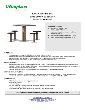 KARTA TECHNICZNA STÓŁ DO GRY W SZACHY Olimpicus- WD-1008W DANE TECHNICZNE: • wymiary (dł. x szer. x wys.): 1280 x 1280 x 745 mm • przeznaczone dla dorosłych i młodzieży w wieku od lat 16 • maksymalny ciężar użytkowania 130 kg • waga spakowanego urządzenia: 70 kg MATERIAŁY: • • • • rury stalowe o średnicy 114, 60 i 38mm - grubość ścianki 2,5 mm, siedzisko i oparcie wykonane z tworzywa LLDPE, obudowa słupów tworzywo LLDPE – struktura drewna zaślepki, pedały oraz uchwyty wykonane tworzywa PE. Zaślepki do rur Ø114 aluminiowe, śruby maszynowe wykonane ze stali nierdzewnej, nakrętki samokontrujące. ZABEZPIECZENIA: • • elementy stalowe odtłuszczane i galwanizowane. Finalne zabezpieczenie oparte na przemysłowej technologii Interpon PZ660 SYSTEM firmy AKZO Nobel – warstwa podkładowa na bazie cynku następnie farba proszkowa. Utwardzanie poprzez obróbkę termiczną, nakrętki i wystające śruby (>8mm) zabezpieczone zaślepkami z tworzywa lub metalu. MONTAŻ I POSADOWIENIE: • konstrukcja modułowa skręcana, zgodnie z dokumentacją – połączenia śrubowe, • metody posadowienia: - w gruncie, poprzez zabetonowanie słupów nośnych zgodnie z normą PN-EN 1176-1:2009. OZNAKOWANIE: • tabliczka znamionowa zawierająca informacje: - model urządzenia, - rok produkcji, - norma, zgodnie z którą urządzenie zabawowe zostało wyprodukowane, - nazwa i adres producenta, - ostrzeżenie o nieużywaniu produktu w przypadku jego uszkodzenia. Urządzenie wyprodukowane zgodnie z normą PN-EN 1176-1:2009 F.H. SYSTEM Krzysztof Mliczek ul. Wyspiańskiego 30a, 33-300 Nowy Sącz tel./fax: 18 547 68 62, e-mail: [email protected] www.olimpicus.com.pl