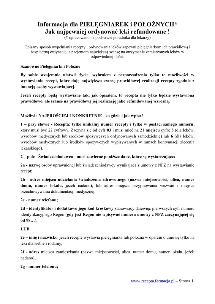 Informacja dla PIELĘGNIAREK i POŁOŻNYCH* Jak najpewniej ordynować leki refundowane ! (*-opracowano na podstawie poradnika dla lekarzy) Opisany sposób wypełniania recepty i ordynowania leków zapewni pielęgniarkom ich prawidłową i bezpieczną ordynację, a pacjentom największą szansę na otrzymanie zamierzonych leków w odpowiedniej ilości. Szanowne Pielęgniarki i Położne By sobie wzajemnie ułatwić życie, wybrałem z rozporządzenia tylko te możliwości w wystawianiu recept, które dają największą szansę prawidłowej realizacji recepty zgodnie z intencją osoby wystawiającej. Jeżeli recepty będą wystawiane tak, jak opisałem, to recepta nie tylko będzie wystawiona prawidłowo, ale szanse na prawidłową jej realizację jako refundowanej wzrosną. Możliwie NAJPROŚCIEJ I KONKRETNIE - co gdzie i jak wpisać 1 – przy słowie - Recepta: tylko unikalny numer recepty i tylko w postaci samego numeru, który musi być 22 cyfrowy. Zaczyna się od cyfr 03 i musi mieć na 21 miejscu cyfrę 5 (dla leków, wyrobów medycznych lub środków spożywczych ordynowanych samodzielnie) lub 6 (dla leków, wyrobów medycznych lub środków spożywczych wypisywanych w ramach kontynuacji zlecenia lekarskiego). 2 – pole - Świadczeniodawca - musi zawierać poniższe dane, które są wystarczające: 2a - nazwę osoby uprawnionej lub świadczeniodawcy wynikającą z umowy z NFZ na wystawianie recept; 2b - adres miejsca udzielania świadczenia zdrowotnego (nazwa miejscowości, ulica, numer domu, numer lokalu, jeżeli nadano), lub adres miejsca przyjmowania wezwań i miejsca przechowywania dokumentacji medycznej; 2c - numer telefonu; 2d - identyfikator i dodatkowo jego kod kreskowy stanowiący dziewięć pierwszych cyfr numeru identyfikacyjnego Regon (gdy jest Regon nie wpisywać numeru umowy z NFZ zaczynającej się od 98…); LUB 2e – imię i nazwisko, jeżeli receptę wystawia pielęgniarka lub położna w oparciu o umowę tylko na leki dla siebie i rodziny; 2f - adres miejsca zamieszkania (nazwa miejscowości, ulica, numer domu, numer lokalu, jeżeli nadano); 2g - numer telefonu; www.recepta.farmacja.pl – Strona 1 2h - dziewięciocyfrowy numer umowy rozpoczynający się od 98, ten numer nie musi być przedstawiony kodem kreskowym; Inne dane firmy lub pielęgniarki/położnej (poza reklamą) mogą być zamieszczane na recepcie, ale nie są konieczne; 3 – pole - Pacjent - musi zawierać: 3a - imię i nazwisko oraz adres (nazwa miejscowości, ulica, numer domu, numer lokalu, jeżeli nadano) miejsca zamieszkania albo miejsca pełnienia służby wojskowej, albo dla osoby z decyzją z pomocy społecznej adres siedziby urzędu gminy lub gminnego ośrodka pomocy społecznej, albo siedziby świadczeniodawcy, który udzielił świadczenia opieki zdrowotnej w przypadku osoby bezdomnej; 3b - wiek - w przypadku pacjenta do lat 18, o ile nie można go ustalić na podstawie numeru PESEL; 3c – dla pacjentów z Unii Europejskiej numer poświadczenia wydanego przez NFZ lub numer z pola nr 8 karty EKUZ; 3d – adnotację pro auctore, pro familiae lub inną równoważną tylko wtedy gdy nie ma Regonu, a dodatkowo jest wpisany numer umowy z NFZ rozpoczynający się od 98 na wypisywanie recept dla siebie lub rodziny; 4 – miejsce przy określeniu PESEL musi zawierać: 4a - numer PESEL, a w przypadku dziecka nieposiadającego numeru PESEL lub niemożności ustalenia tego numeru - numer PESEL przedstawiciela ustawowego lub opiekuna wraz z adnotacją o zamieszczeniu numeru PESEL osoby innej niż pacjent i wtedy podpisem pielęgniarki, lub położnej. PESEL warto, ale nie trzeba przedstawiać dodatkowym kodem kreskowym. 4b – lub numer Karty Polaka, a w przypadku cudzoziemców i recept wyłącznie pełnopłatnych, gdy zniżka nie przysługuje - numer paszportu lub innego dokumentu ze zdjęciem; 5 – pole – Oddz. NFZ - musi zawierać: tylko i nic innego niż numer oddziału NFZ (załącznik nr 2) lub symbol europejskiego państwa dla pacjentów z UE (załącznik nr 3) , lub znak „X”; 6 – pole – Uprawnienia dodatkowe - musi zawierać: tylko i nic innego niż dwuliterowy kod uprawnień dodatkowych pacjenta, określony w załączniku nr 1 do rozporządzenia, jeżeli dotyczy, a jeżeli nie to znak „X”. Zawsze jednak musi występować łącznie z numerem w okienku Oddział NFZ. 7 – pole - Rp - na wpisywanie leków: 7a - wypisując recepty nazwami handlowymi najlepiej podać krótką nazwę handlową bez dodawania zbędnych informacji jak np. producenta czy sposobu pakowania leku, itp., jednak najlepszym sposobem na wypisywanie nazw leków jest podawanie nazw międzynarodowych, wtedy szansa na realizację recepty jest największa, gdyż prawdopodobieństwo znalezienia jednego z odpowiedników jest największe. Przy wpisaniu np. nazwy handlowej najtańszego odpowiednika www.recepta.farmacja.pl – Strona 2 apteka nie może wydać nic innego i przy jego całkowitym braku pacjent może tylko wrócić do lekarza po inną receptę lub wykupić inny odpowiednik tylko na 100%. Ponadto wpisując nazwę międzynarodową, lekarz wykorzystuje wszystkie wskazania, jakie w jakiejkolwiek nazwie handlowej o tej nazwie międzynarodowej występują. 7b – apteka ma obowiązek proponować pacjentom tańsze odpowiedniki, a jedynym sposobem, by ich nie proponować, jest wpisanie „NZ” lub „nie zamieniać” przy każdej pozycji, która ma pozostać niezamieniona. Adnotacja ta dotyczy jedynie kontynuacji zlecenia lekarskiego z takim zastrzeżeniem. O wpisaniu przez lekarza tej adnotacji apteki informują NFZ; 7c - ilość leku na recepcie podawać tylko i wyłącznie ilością jednostek dawkowania – na sztuki! Nie pisać ilości i wielkości opakowań! Jeżeli leku ma być w sumie więcej niż dwa najmniejsze opakowania musi pojawić się takie dawkowanie, by ta ilość mieściła się w 120 dniowym stosowaniu. Warto się zorientować, jakie są dostępne opakowania leku refundowanego i wpisać na s