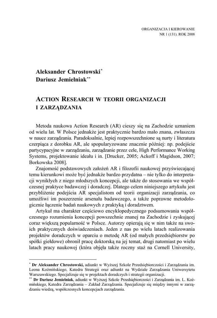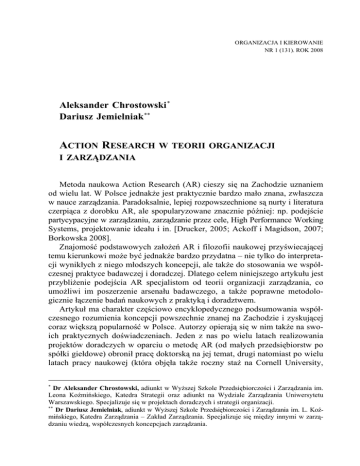 ORGANIZACJA I KIEROWANIE NR 1 (131). ROK 2008 Aleksander Chrostowski ∗ Dariusz Jemielniak ∗∗ ACTION RESEARCH W TEORII ORGANIZACJI I ZARZĄDZANIA Metoda naukowa Action Research (AR) cieszy się na Zachodzie uznaniem od wielu lat. W Polsce jednakże jest praktycznie bardzo mało znana, zwłaszcza w nauce zarządzania. Paradoksalnie, lepiej rozpowszechnione są nurty i literatura czerpiąca z dorobku AR, ale spopularyzowane znacznie później: np. podejście partycypacyjne w zarządzaniu, zarządzanie przez cele, High Performance Working Systems, projektowanie ideału i in. [Drucker, 2005; Ackoff i Magidson, 2007; Borkowska 2008]. Znajomość podstawowych założeń AR i filozofii naukowej przyświecającej temu kierunkowi może być jednakże bardzo przydatna – nie tylko do interpretacji wynikłych z niego młodszych koncepcji, ale także do stosowania we współczesnej praktyce badawczej i doradczej. Dlatego celem niniejszego artykułu jest przybliżenie podejścia AR specjalistom od teorii organizacji zarządzania, co umożliwi im poszerzenie arsenału badawczego, a także poprawne metodologicznie łączenie badań naukowych z praktyką i doradztwem. Artykuł ma charakter częściowo encyklopedycznego podsumowania współczesnego rozumienia koncepcji powszechnie znanej na Zachodzie i zyskującej coraz większą popularność w Polsce. Autorzy opierają się w nim także na swoich praktycznych doświadczeniach. Jeden z nas po wielu latach realizowania projektów doradczych w oparciu o metodę AR (od małych przedsiębiorstw po spółki giełdowe) obronił pracę doktorską na jej temat, drugi natomiast po wielu latach pracy naukowej (która objęła także roczny staż na Cornell University, ∗ Dr Aleksander Chrostowski, adiunkt w Wyższej Szkole Przedsiębiorczości i Zarządzania im. Leona Koźmińskiego, Katedra Strategii oraz adiunkt na Wydziale Zarządzania Uniwersytetu Warszawskiego. Specjalizuje się w projektach doradczych i strategii organizacji. ∗∗ Dr Dariusz Jemielniak, adiunkt w Wyższej Szkole Przedsiębiorczości i Zarządzania im. L. Koźmińskiego, Katedra Zarządzania – Zakład Zarządzania. Specjalizuje się między innymi w zarządzaniu wiedzą, współczesnych koncepcjach zarządzania. 42 Aleksander Chrostowski, Dariusz Jemielniak w „kolebce” podejścia AR, przez którą przewinęli się m.in. Kurt Lewin, William F. Whyte, Davydd Greenwood i in.) zajął się także projektami doradczymi AR. Mimo teoretycznego i przeglądowego charakteru niniejszego tekstu, jest on jednak jednocześnie umocowany w realnych doświadczeniach naukowo-konsultingowych. Artykuł podzielony jest na cztery części. W pierwszej formułujemy problem, który był bezpośrednim powodem poszukiwań metody, takiej jak AR. W drugiej przedstawiamy definicję AR we współczesnym rozumieniu tego pojęcia. W trzeciej opisujemy szczegółowiej partycypacyjny charakter podejścia. W czwartej przybliżamy pierwsze, historyczne zastosowania AR, aby zilustrować kontekst środowiskowy, w jakim narodziła się ta metoda. Korzenie Action Research Jednym z powodów powstania nurtu AR w teorii organizacji było zauważenie problemu, który nie stracił na aktualności do dzisiaj: praktyka i teoria zarządzania są od siebie bardzo oddalone. Menedżerowie nie zwracają się do naukowców z prośbą o rozwiązywanie ich problemów – do realizacji tej potrzeby powstała osobna profesja konsultantów. Z kolei naukowcy nie traktują także praktyków poważnie – ich doświadczenie nie jest uważane za współmierne i kwalifikujące do uzyskania wysokiego statusu na uczelni, niezależnie od osiągnięć zawodowych [Mabry, May, Berger, 2004]. Po części wynika to z naturalnej rywalizacji pomiędzy naukowcami a praktykami o to, czyje interpretacje rzeczywistości społecznej będą uznane za prawdziwe. Uczelnie kultywują pogląd, zgodnie z którym jedynie naukowe metody badawcze (często w domyśle – stosowane przez osoby z formalnie uznanymi stopniami) mogą służyć do rzetelnego opisu świata [Feyerabend, 1996]. Zgodnie z tym światopoglądem naukowcy „wiedzą”, podczas gdy pozostali (praktycy) jedynie „wierzą” [Latour, 1987]. Praktycy odwzajemniają to lekceważenie. Złośliwe pytanie McCloskey, skierowane do ekonomistów i zawarte w tytule znanej książki „if you’re so smart, why aren’t you rich” [1992] (ang. dosł. skoro jesteś taki mądry, to czemu nie jesteś bogaty) dobrze podsumowuje stosunek wielu specjalistów do teoretyków naszej dyscypliny. Ma także całkiem racjonalne uzasadnienie – gdyby teoretycy zarządzania faktycznie znali się na nim, nie jest do końca jasne czemu nie postępują zgodnie ze swoim interesem ekonomicznym i nie porzucają pracy na uczelni, aby przejść do biznesu. Powiedzonka, takie jak „w szkole cię tego nie nauczą”, czy określenia „wieża z kości słoniowej”, plastycznie obrazujące odizolowanie naukowców od realnego świata, wskazują, że dla wielu ludzi nauka (a zwłaszcza nauki społeczne i ekonomiczne) w dużym stopniu straciły już kontakt ze światem codziennym, a także dużą część swojej legitymizacji. Action Research w teorii organizacji i zarządzania 43 Być może jest to nieuniknione. Większość nauk społecznych zaczynała od obietnicy rozwiązania realnych problemów zbiorowości – filozofia miała m.in. pomóc Ateńczykom w budowaniu strategii militarnych i wychowywaniu dzieci, socjologia – wyeliminować przestępczość i ubóstwo, a ekonomia doprowadzić do stabilnego i przewidywalnego rozwoju gospodarczego [Czarniawska-Joerges, 1994]. Miało to oczywiście za każdym razem na celu uprawomocnienie danej dziedziny wiedzy i uzasadnienie jej istnienia. Zarządzanie również podlegało podobnemu procesowi: w początkach naszej dyscypliny było wręcz uważane za odmianę inżynierii, tylko w odniesieniu do grup ludzkich [Shenhav, 1999] i miało doprowadzić do opracowania optymalnych struktu