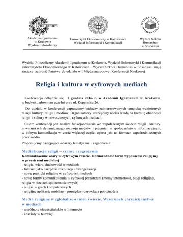 Akademia Ignatianum w Krakowie Wydział Filozoficzny Uniwersytet Ekonomiczny w Katowicach Wydział Informatyki i Komunikacji Wyższa Szkoła Humanitas w Sosnowcu Wydział Filozoficzny Akademii Ignatianum w Krakowie, Wydział Informatyki i Komunikacji Uniwersytetu Ekonomicznego w Katowicach i Wyższa Szkoła Humanitas w Sosnowcu mają zaszczyt zaprosić Państwa do udziału w I Międzynarodowej Konferencji Naukowej Religia i kultura w cyfrowych mediach Konferencja odbędzie się 1 grudnia 2016 r. w Akademii Ignatianum w Krakowie, w budynku głównym uczelni przy ul. Kopernika 26. Do udziału w konferencji zapraszamy badaczy zainteresowanych tematyką wzajemnych relacji kultury, religii i mediów. Organizatorzy szczególny nacisk kładą na kwestię obecności religii i kultury w nowoczesnych, cyfrowych mediach. Celem konferencji jest analiza funkcjonowania we współczesnym świecie religii i kultury, w warunkach dynamicznego rozwoju mediów i przemian w społeczeństwie informacyjnym, w którym komunikacja w coraz większej części oparta jest na formach zapośredniczonych przez media. Proponujemy następujące obszary tematyczne i zagadnienia: Mediatyzacja religii – szanse i zagrożenia Komunikowanie wiary w cyfrowym świecie. Różnorodność form wypowiedzi religijnej w przestrzeni medialnej - religia, wiara, duchowość w mediach - Internet jako narzędzie rekrutacji i ewangelizacji - nowe praktyki religijne w cyfrowych mediach - nowe formy komunikowania w cyfrowej przestrzeni (memy internetowe, blogi religijne, religia w sieciach społecznościowych) - religia w grach komputerowych - religijne aplikacje mobilne – pomiędzy rozrywką a pobożnością Media religijne w zglobalizowanym świecie. Wizerunek chrześcijaństwa w mediach - wspólnoty chrześcijańskie w Internecie - kościoły w telewizji - chrześcijańskie stacje radiowe - kościoły w mediach cyfrowych - prasa religijna - ważne wydarzenia religijne w mediach - promocja kościołów wobec wyzwań rynkowych XXI wieku Medialne oblicza instytucji religijnych i kulturalnych w XXI wieku - media cyfrowe w instytucjach kultury - instytucje kultury w mediach cyfrowych - nowoczesne technologie medialne w teatrze, kinie, muzeum - promocja instytucji kultury w cyfrowym świecie - teatr, kino, nowe media – przestrzenie kultury XXI wieku - wieloetniczność i wielokulturowość przekazów emitowanych przez media - cyberkultura - nowa relacja twórca-odbiorca w cyfrowym świecie - nowe media a uczestnictwo w kulturze - gry komputerowe w kulturze - kreacja imprez kulturalnych w cyberprzestrzeni Komitet Naukowy prof. dr hab. Janusz Adamowski prof. dr hab. Andrzej Adamski prof. dr hab. Józef Bremer SJ prof. UP JPII dr hab. Michał Drożdż prof. dr hab. Tomasz Goban-Klas prof. dr hab. Jerzy Gołuchowski prof. AIK dr hab. Tomasz Homa SJ prof. WSH dr hab. Michał Kaczmarczyk dr hab. Mirosław Lakomy prof. UE dr hab. Marek Łuczak prof. dr hab. Agnieszka Ogonowska prof. UE dr hab. Aleksandra Pethe prof. dr hab. Dariusz Rott prof. AIK dr hab. Krzysztof Śnieżyński Doc. Mgr. Katarína Fichnová, PhD.oc. Univerzita Konštantína Filozofa v Nitre, Słowacja Doc. Mgr. Peter Mikulaš, Phd. Univerzita Konštantína Filozofa v Nitre, Słowacja Doc. PaedDr. Jana Raclavska, PhD. Ostravska Univerzita w Ostrave, Czechy Doc. PhDr. Ján Višňovský, PhD. University of SS. Cyril and Methodius in Trnava, Słowacja dr Małgorzata Łosiewicz dr Iwona Ocetkiewicz Mgr. Łukasz Wojciechowski, PhD. FORMULARZ ZGŁOSZENIOWY DOSTĘPNY NA STRONIE KONFERENCJI: http://nauka.ignatianum.edu.pl/ Opłata konferencyjna wynosi 350 zł i obejmuje: materiały konferencyjne; bufet dostępny podczas trwania konferencji; publikację artykułu w punktowanym czasopiśmie naukowym (po uzyskaniu pozytywnych recenzji). Komitet organizacyjny konferencji zastrzega sobie prawo do ostatecznej decyzji o zakwalifikowaniu tekstu wystąpienia i jego opublikowania. O decyzji poinformujemy Państwa do 15 października 2016 r. Osoby które chcą uczestniczyć w konferencji bez wygłoszenia referatu i publikacji, wnoszą opłatę w wysokości 200 zł. Wpłaty należy dokonać do 30 października 2016 na konto: BANK BPH O/KRAKÓW 53 1060 0076 0000 3210 0016 0058 AKADEMIA IGNATIANUM W KRAKOWIE ul. Kopernika 26, 31-501 Kraków W tytule przelewu proszę wpisać: Kultura i religia w cyfrowych mediach Uwaga: Opłata nie obejmuje kosztów dojazdu i ewentualnego noclegu. Ważne terminy do 30.09.2016 – zgłoszenie udziału do 15.10.2016 – informacja o zakwalifikowaniu do 30.10.2016 – opłata konferencyjna 1.12.2016 – konferencja SEKRETARZE KONFERENCJI dr Katarzyna Walotek-Ściańska [email protected] , [email protected] dr Danuta Smołucha [email protected] dr Magdalena Boczkowska [email protected]