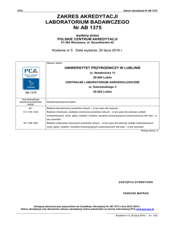 PCA Zakres akredytacji Nr AB 1375 ZAKRES AKREDYTACJI LABORATORIUM BADAWCZEGO Nr AB 1375 wydany przez POLSKIE CENTRUM AKREDYTACJI 01-382 Warszawa, ul. Szczotkarska 42 Wydanie nr 5 Data wydania: 20 lipca 2016 r. Nazwa i adres UNIWERSYTET PRZYRODNICZY W LUBLINIE ul. Akademicka 13 20-950 Lublin CENTRALNE LABORATORIUM AGROEKOLOGICZNE ul. Dobrzańskiego 3 20-262 Lublin AB 1375 Kod identyfikacji dziedziny/przedmiotu badań B/1 C/1; C/9; C/22 Dziedzina/przedmiot badań: Badania biochemiczne produktów rolnych – w tym pasz dla zwierząt Badania chemiczne, analityka chemiczna produktów rolnych – w tym pasz dla zwierząt, próbek środowiskowych, wody, gleby, osadów i ścieków, wyrobów konsumpcyjnych przeznaczonych dla ludzi – w tym żywności N/1; N/9; N22 Badania właściwości fizycznych produktów rolnych – w tym pasz dla zwierząt, próbek środowiskowych, wody, gleby, osadów i wyrobów konsumpcyjnych przeznaczonych dla ludzi – w tym żywności Wersja strony: A ZASTĘPCA DYREKTORA TADEUSZ MATRAS Niniejszy dokument jest załącznikiem do Certyfikatu Akredytacji Nr AB 1375 z dnia 20.07.2016 r. Status akredytacji oraz aktualność zakresu akredytacji można potwierdzić na stronie internetowej PCA www.pca.gov.pl Wydanie nr 5, 20 lipca 2016 r. str. 1/23 PCA Zakres akredytacji Nr AB 1375 CENTRALNE LABORATORIUM AGROEKOLOGICZNE ul. Dobrzańskiego 3, 20-262 Lublin Rodzaj działalności/badane Przedmiot badań/wyrób Dokumenty odniesienia cechy/metoda Pasze dla zwierząt Aminokwasy ogólne CLA/PLC/34/2011 Zakres: wersja 2 z dnia 01.02.2011 r. Asparagina (0,3 – 50) mg/g Treonina (0,3 – 50) mg/g Seryna (0,2 – 40) mg/g Kwas glutaminowy (0,7 – 50) mg/g Prolina (0,4 – 30) mg/g Glicyna (0,2 – 50) mg/g Alanina (0,2 – 50) mg/g Walina (0,4 – 50) mg/g Izoleucyna (0,3 – 20) mg/g Leucyna (0,3 – 50) mg/g Tyrozyna (0,5 – 30) mg/g Fenyloalanina (0,5 – 50) mg/g Histydyna (0,5 – 50) mg/g Lizyna (0,5 – 50) mg/g Arginina (0,5 – 40) mg/g Metoda wysokosprawnej chromatografii cieczowej (HPLC) Zboże Zawartość azotu CLA/PSO/13/2013 Zakres: (0,02 – 2,4)% wersja 3 z dnia 19.12.2013 r. Metoda miareczkowa (Kjeldahla) Zawartość białka CLA/PSO/13/2013 Z obliczeń wersja 3 z dnia 19.12.2013 r. Zawartość popiołu surowego PN-ISO 2171:1994 Zakres: (0,4 – 3,25)% Metoda wagowa Jęczmień Zawartość białka w SM: CLA/PSO/4/2011 Zakres: (6 – 18)%, wersja 2 z dnia 01.02.2011 r. Wilgotność Zakres: (8 – 25)%, Zawartość skrobi Zakres: (40 – 70)% Metoda NIR Kukurydza Zawartość oleju w SM CLA/PSO/4/2011 Zakres: (3 – 17)%, wersja 2 z dnia 01.02.2011 r. Zawartość białka w SM Zakres: (6 – 20)%, Wilgotność: Zakres: (4 – 47)%, Zawartość skrobi w SM Zakres: (61 – 77)% Metoda NIR Rzepak Wilgotność CLA/PSO/4/2011 Zakres: (4 – 25)% wersja 2 z dnia 01.02.2011 r. Zawartość oleju w SM Zakres: (35 – 52) % Metoda NIR Pszenica Dur Zawartość białka CLA/PSO/4/2011 Zakres: (7 – 22)%, wersja 2 z dnia 01.02.2011 r. Zawartość wody Zakres: (7 – 25)% Metoda NIR Wydanie nr 5, 20 lipca 2016 r. str. 2/23 PCA Zakres akredytacji Nr AB 1375 Wersja strony: A Przedmiot badań/wyrób Owies Żyto Pszenżyto Pszenica Burak cukrowy Pasze Surowiec roślinny Rodzaj działalności/badane cechy/metoda Wilgotność Zakres: (9 – 25)% Metoda NIR Zawartość białka Zakres: (6 – 14)%, Wilgotność Zakres: (9 – 28)% Metoda NIR Wilgotność Zakres: (9 – 25)% Metoda NIR Zawartość białka w SM Zakres: (7 – 22)%, Wilgotność Zakres: (7 – 25)%, Zawartość skrobi w SM Zakres (52 – 75)%, Zawartość glutenu mokrego Zakres: (14 – 45)%, Wskaźnik sedymentacyjny Zeleny’ego Zakres: (10 – 70) ml Metoda NIR Zawartość sacharozy Zakres: (0,5 – 30)% Metoda polarymetryczna Zawartość wapnia, miedzi, żelaza, magnezu, manganu, potasu, sodu i cynku Zakres: Wapń (500 – 24000) mg/kg Miedź (35 – 5000) mg/kg Żelazo (50 – 7000) mg/kg Magnez (200 – 12000) mg/kg Mangan (35 – 5000) mg/kg Potas (100 – 12000) mg/kg Sód (200 – 12000) mg/kg Cynk (20 – 4000) mg/kg Metoda płomieniowej absorpcyjnej spektrometrii atomowej (FAAS) Zawartość fosforu Zakres: (1,25 – 50) g/kg Metoda spektrofotometryczna Zawartość włókna surowego Zakres: powyżej 0,01% zawartości włókna surowego w badanym materiale Metoda wagowa Zawartość flawonoidów (suma) w przeliczeniu na kwercetynę Zakres: (0,0023 – 5) g/100g Metoda spektrofotometryczna Zawartość o-Dihydroksyfenoli (suma) w przeliczeniu na kwas kawowy Zakres: (0,1 – 8) g/100g Metoda spektrofotometryczna Dokumenty odniesienia CLA/PSO/4/2011 wersja 2 z dnia 01.02.2011 r. CLA/PSO/4/2011 wersja 2 z dnia 01.02.2011 r. CLA/PSO/4/2011 wersja 2 z dnia 01.02.2011 r. CLA/PSO/4/2011 wersja 2 z dnia 01.02.2011 r. CLA/PLC/32/2011 wersja 2 z dnia 01.02.2011 r. PN-EN ISO 6869:2002 PN-ISO 6491:2000 CLA/PSO/27/2011 wersja 2 z dnia 01.02.2011 r. Farmakopea Polska, Wydanie VI 2002, „Oznaczanie zawartości flawonoidów” - str.150 CLA/SR/20/2013 wersja 4 z dnia 30.01.2013 r. Wydanie nr 5, 20 lipca 2016 r. str. 3/23 PCA Zakres akredytacji Nr AB 1375 Wersja strony: A Przedmiot badań/wyrób Nasiona roślin Woda Rodzaj działalności/badane cechy/metoda Zawartość mikotoksyn Zakres: 3-Acetyldeoxynivalenol: (1- 30) µg/kg Aflatoxin B1: (1 – 30) µg/kg Aflatoxin B2: (1 – 20) µg/kg Aflatoxin G1: (1 – 20) µg/kg Aflatoxin G2: (1 – 20) µg/kg Diacetoxyscirpenol: (1 – 30) µg/kg Deoxynivalenol: (1 – 30) µg/kg Fusarenon X: (1 – 20) µg/kg HT-2 toxin: (1 – 30) µg/kg Nivalenol: (1 – 30) µg/kg Ochratoxin A: (10 – 30) µg/kg T2 toxin: (1 – 30) µg/kg Zearalenone: (1 – 30) µg/kg Metoda wysokosprawnej chromatografii cieczowej z detekcją tandemową spektrometrią mas (HPLC-MS-MS) pH Zakres: 4 – 10 Metoda potencjometryczna Przewodność elektryczna właściwa Zakres: (20 – 1413) µS/cm Metoda konduktometryczna Stężenie fosforu ogólnego Zakres: (0,04 – 0,4) mg/dm3 Metoda spektrofotometryczna Stężenie ogólnego węg