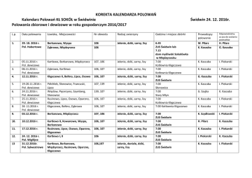 KOREKTA KALENDARZA POLOWAŃ Kalendarz Polowań KŁ SOKÓŁ w Świdwinie Polowania zbiorowe i dewizowe w roku gospodarczym 2016/2017 Świdwin 24. 12. 2016r. L.p. Data polowania Łowiska, Miejscowości Nr obwodu Rodzaj zwierzyny Godzina i miejsce zbiórki Prowadzący polowanie Odpowiedzialny za psa do szukania postrzałów 1. 29. 10. 2016 r. Pol. Hubertowe Berkanowo, Wyspa Ząbrowo, Międzyrzecz 106 106 Jelenie, dziki, sarny, lisy W. Pilarz K. Kaszuba H. Pilarz G. Kaszuba 2. 05.11.2016 r. Pol. dewizowe 06.11.2016 r. Pol. dewizowe 12.11.2016 r. Kartlewo, Berkanowo, Międzyrzecz 107, 106 Jelenie, dziki, sarny, lisy K. Kaszuba I. Piekarski Ząbrowo, Kartlewo 106, 107 Jelenie, dziki, sarny, lisy K. Kaszuba I. Piekarski Klępczewo II, Bełtno, Lipce, Osowo 106, 107 Jelenie, dziki, sarny, lisy G. Kaszuba I. Piekarski Półchleb, Słonowice, Francuski, Lipce Więcław, Pęcerzyno, Szymberg, Słonowice Rusinowo, Lipce, Osowo, Oparzno, Klępczewo Klępczewo, Bełtno, Ząbrowo 107, 139 Jelenie, dziki, sarny, lisy K. Kaszuba I. Piekarski 139, 107 Jelenie, dziki, sarny, lisy G. Szyjka K. Kaszuba 106, 107 Jelenie, dziki, sarny, lisy K. Kaszuba I. Piekarski 106, 107 Jelenie, dziki, sarny, lisy K. Kaszuba I. Piekarski 9. 19-20.11.2016 r. Pol. dewizowe 24.11.2016 r. Pol. dewizowe 25.11.2016 r. Pol. dewizowe 26 .11.2016 r. Pol. dewizowe 03.12.2016 r. 6.45 ZUS Świdwin lub 7.15 dom myśliwski Sokołówka w Międzyrzecku 7.00 Kotłownia Klępczewo 7.00 Kotłownia Klępczewo 7.00 ZUS Świdwin 7.00 Słonowice 7.00 Stary Młyn 7.00 Kotłownia Klępczewo 7.00 Kotłownia Klępczewo Berkanowo, Międzyrzecz 107, 106 Jelenie, dziki, sarny, lisy K. Szydłowski I. Piekarski 10. 10.12.2016 r. 106, 107 Jelenie, dziki, sarny, lisy H. Pilarz K. Kaszuba 11. 17.12.2016 r. 106, 107 Jelenie, dziki, sarny, lisy K. Kaszuba I. Piekarski 12. 24. 12. 2016 r. Pol. Wigilijne 31.12.2016r. Pol. Sylwestrowe Kartlewo II, Kowanowo, Wyspa, Berkanowo Rusinowo, Lipce, Osowo, Oparzno, Klępczewo Kartlewo I, II 106 Jelenie, dziki, sarny, lisy I. Piekarski K. Kaszuba 106,107 Jelenie, daniele, dziki, sarny, lisy K. Kaszuba I. Piekarski 3. 4. 5. 6. 7. 8. 13 Kartlewo, Berkanowo, Międzyrzecz, Rusinowo, Oparzno, Klępczewo 7.00 ZUS Świdwin 7.00 ZUS Świdwin 7.00 ZUS Świdwin 7.00 ZUS Świdwin 7.00 ZUS Świdwin 13. 06-07-08. 01. 2017 r. 14. 14-15.01.2017r. w przypadku niewykonania planu odstrzału na jelenie 15. 28-29. 01. 2017 r. 16. 11-12.02.2017r. 17. 25-26. 02. 2017 r. Więcław, Pęcerzyno, Szymberg, Słonowice, Oparzno, Klępczewo I i II, Kartlewo I i II, Kowanowo, Wyspa, Osowo, Berkanowo, Półchleb, Jasiuchna, Francuski, Lipce, Oparzno, Klępczewo Oparzno, Klępczewo I i II, Kartlewo I i II, Kowanowo, Wyspa, Osowo, Berkanowo, Półchleb, Jasiuchna, Francuski, Lipce, Oparzno, Klępczewo, Słonowice, Więcław 139, 107, 106 Jelenie, daniele, dziki, sarny, lisy 7.00 ZUS Świdwin K. Kaszuba G. Szyjka 106, 107, 139 Jelenie, daniele, dziki, sarny, lisy 8.00 ZUS Świdwin K. Kaszuba I. Piekarski Oparzno, Klępczewo I i II, Kartlewo I i II, Kowanowo, Wyspa, Osowo, Berkanowo, Półchleb, Jasiuchna, Francuski, Lipce, Oparzno, Klępczewo, Słonowice, Więcław Oparzno, Klępczewo I i II, Kartlewo I i II, Kowanowo, Wyspa, Osowo, Berkanowo, Półchleb, Jasiuchna, Francuski, Lipce, Oparzno, Klępczewo, Słonowice, Więcław Oparzno, Klępczewo I i II, Kartlewo I i II, Kowanowo, Wyspa, Osowo, Berkanowo, Półchleb, Jasiuchna, Francuski, Lipce, Oparzno, Klępczewo, Słonowice, Więcław 106, 107, 139 Na lisy i inne drapieżniki z wabikiem 8.00 ZUS Świdwin W. Pilarz H. Pilarz 106, 107, 139 Na lisy i inne drapieżniki z wabikiem 8.00 ZUS Świdwin W. Pilarz H. Pilarz 106, 107, 139 Na lisy i inne drapieżniki z wabikiem 8.00 ZUS Świdwin G. Szyjka K. Kaszuba Otrzymują: 1. 2. 3. Nadleśnictwo Świdwin ZO PZŁ w Koszalinie Zarząd Gminy Świdwin i Brzeżno Z poważaniem Łowczy Koła Krzysztof Kaszuba