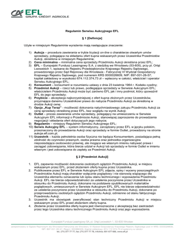 Regulamin Serwisu Aukcyjnego EFL § 1 [Definicje] Użyte w niniejszym Regulaminie wyrażenia mają następujące znaczenie: 1) Aukcja – procedura zawierania w trybie licytacji on-line o charakterze otwartym umów sprzedaży, polegająca na składaniu ofert kupna wskazanych przez Uczestnika Przedmiotów Aukcji, określona w niniejszym Regulaminie; 2) Cena minimalna – minimalna cena sprzedaży Przedmiotu Aukcji określona przez EFL; 3) EFL – Europejski Fundusz Leasingowy S.A. z siedzibą we Wrocławiu (53-605), przy pl. Orląt Lwowskich 1, wpisana do Rejestru Przedsiębiorców Krajowego Rejestru Sądowego, prowadzonego przez Sąd Rejonowy dla Wrocławia - Fabrycznej VI Wydział Gospodarczy Krajowego Rejestru Sądowego, pod numerem KRS 0000026609, NIP: 897-001-26-57; kapitał zakładowy w wysokości 674.112.374,73 zł – wpłacony w całości, właściciel i operator Serwisu Aukcyjnego EFL; 4) Konsument – konsument w rozumieniu ustawy z dnia 23 kwietnia 1964 r. Kodeks cywilny; 5) Przedmiot Aukcji – rzecz lub prawo, podlegające sprzedaży w Serwisie Aukcyjnym EFL; właścicielem Przedmiotu Aukcji może być zarówno EFL jak i inny podmiot, który upoważnił EFL do jego sprzedaży; 6) Przybicie – akceptacja najkorzystniejszej z ofert kupna złożonych przez Uczestników, przyznająca danemu Uczestnikowi prawo do nabycia Przedmiotu Aukcji za określoną w drodze Aukcji cenę; 7) Opcja „Kup Teraz” - możliwość dokonania natychmiastowego zakupu Przedmiotu Aukcji za cenę sprzedaży określoną przez EFL, bez względu na wynik Aukcji; 8) Outlet – proces zawierania umów sprzedaży, polegający na umieszczeniu w Serwisie Aukcyjnym EFL informacji o Przedmiocie Aukcji, stanowiącej zaproszenie do prowadzenia negocjacji i składania ofert dotyczących jego nabycia; 9) Regulamin – niniejszy Regulamin Serwisu Aukcyjnego EFL; 10) Serwis Aukcyjny EFL – system informatyczny, zarządzany przez EFL w języku polskim, przeznaczony do prowadzenia Aukcji oraz sprzedaży w formie Outlet, prowadzony na stronie aukcje.efl.com.pl; 11) Uczestnik – każda pełnoletnia osoba fizyczna nie będąca Konsumentem, posiadająca pełną zdolność do czynności prawnych, osoba prawna oraz jednostka organizacyjna nieposiadająca osobowości prawnej, ale mogąca we własnym imieniu nabywać prawa i zaciągać zobowiązania, która bierze udział w Aukcji lub sprzedaży w formie Outlet w imieniu własnym i jest zobowiązana do zapłaty za Przedmiot Aukcji. § 2 [Przedmiot Aukcji] 1. EFL zapewnia możliwość dokonania osobistych oględzin Przedmiotu Aukcji, w miejscu wskazanym przez EFL, przed złożeniem oferty kupna przez Uczestnika. 2. Publikowane przez EFL w Serwisie Aukcyjnym EFL zdjęcia, opisy i wyceny poszczególnych Przedmiotów Aukcji mają charakter wyłącznie poglądowy i nie stanowią wiążącego dla Uczestnika elementu oznaczenia lub opisu stanu technicznego i wyposażenia Przedmiotu Aukcji. EFL nie bierze odpowiedzialności za ustalenia poczynione przez Uczestnika w stosunku do Przedmiotu Aukcji, dokonane na podstawie opublikowanych materiałów poglądowych, umieszczonych w Serwisie Aukcyjnym EFL. EFL nie bierze odpowiedzialności za ustalenia poczynione przez Uczestnika w stosunku do Przedmiotu Aukcji, dokonane po przeprowadzeniu osobistych oględzin Przedmiotu Aukcji, odmienne od stanu faktycznego Przedmiotu Aukcji. 3. Uczestnik ma obowiązek zweryfikować stan techniczny Przedmiotu Aukcji w miejscu wskazanym przez EFL przed złożeniem oferty kupna. 4. Złożenie przez Uczestnika oferty kupna jest równoznaczne z akceptacją bez zastrzeżeń przez tego Uczestnika stanu technicznego Przedmiotu Aukcji oraz jego wyposażenia. 5. Z uwagi na fakt, że oferowane w Serwisie Aukcyjnym EFL Przedmioty Aukcji należą w zdecydowanej większości do kategorii sprzętów używanych oraz że Uczestnik w chwili złożenia oferty kupna zaakceptował bez zastrzeżeń stan techniczny Przedmiotu Aukcji oraz jego wyposażenia EFL wyłącza rękojmię za wady oraz nie uzupełnia ewentualnych braków wyposażenia nabytych Przedmiotów Aukcji. 6. EFL nie udziela gwarancji na Przedmioty Aukcji. § 3 [Warunki uczestnictwa] 1. Uczestnik winien posiadać konto poczty elektronicznej. 2. Rejestracja Uczestnika odbywa się poprzez przesłanie formularza rejestracyjnego dostępnego w Serwisie Aukcyjnym EFL. 3. Podanie przez Uczestnika danych osobowych objętych formularzem rejestracyjnym jest obowiązkowe, a ich brak lub niekompletność uniemożliwi aktywację konta. 4. W związku z realizacją obowiązków wynikających z ustawy z dnia 16 listopada 2000 r. o przeciwdziałaniu praniu pieniędzy i finansowaniu terroryzmu, warunkiem niezbędnym do aktywowania konta i przeprowadzenia transakcji jest doręczenie przez Uczestnika wymaganych przez EFL dokumentów i informacji niezbędnych do stosowania środków bezpieczeństwa finansowego adekwatnych do poziomu ryzyka. Uczestnik jest zobowiązany w szczególności do przedłożenia kopii dokumentów potwierdzających: a. w przypadku osób fizycznych i ich przedstawicieli – dane Uczestnika tj.: imienia, nazwiska, obywatelstwa oraz adresu Uczestnika, a ponadto numeru PESEL lub daty urodzenia w przypadku Uczestnika nieposiadającej numeru PESEL lub numeru dokumentu stwierdzającego tożsamość cudzoziemca, lub kodu kraju w przypadku przedstawienia paszportu; b. w przypadku osób prawnych lub jednostek organizacyjnych nieposiadających osobowości prawnej - aktualne dane Uczestnika tj.: NIP, REGON oraz wyciąg z rejestru sądowego lub innego dokumentu, wskazującego nazwę (firmę), formę organizacyjną osoby prawnej, siedzibę i jej adres, a także imienia, nazwiska, obywatelstwa osoby uprawnionej do reprezentacji Uczestnika, a ponadto jej numeru PESEL lub daty urodzenia w przypadku osoby nieposiadającej numeru PESEL. W celu zastosowania środków bezpieczeństwa finansowego EFL może również zażądać od Uczestników wszelkich dodatkowych dokumentów i inf