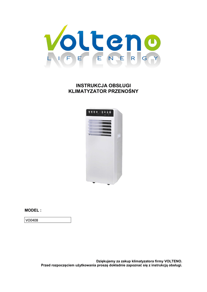 INSTRUKCJA OBSŁUGI KLIMATYZATOR PRZENOŚNY MODEL : VO0408 Dziękujemy za zakup klimatyzatora firmy VOLTENO. Przed rozpoczęciem użytkowania proszę dokładnie zapoznać się z instrukcją obsługi. ŚRODKI OSTROŻNOŚCI Klimatyzator jest drogim urządzeniem, dlatego też zalecamy, aby został on zainstalowany przez doświadczonego instalatora. W przeciwnym razie mogą wystąpić nie tylko poważne straty materialne, lecz również niewłaściwe działanie i spadek efektywności pracy. Firma Zipp NIE ODPOWIADA za awarie klimatyzatora, który został nieprawidłowo zainstalowany. Ta instrukcja przeznaczona jest dla klimatyzatorów typu przenośnego. Wygląd może nieco odbiegać od rysunków zawartych w poniższej instrukcji. Prosimy o uważne przeczytanie instrukcji i pozostawienie jej w miejscu umożliwiającym skorzystanie z niej w razie potrzeby. • Należy przeczytać wszystkie zasady bezpieczeństwa. • Odłącz urządzenie od źródła zasilania przed demontowaniem, składaniem lub czyszczeniem klimatyzatora. • Unikaj dotykania wszystkich ruchomych części urządzenia. • Jeżeli klimatyzator jest podłączony do zasilania, a w szczególności kiedy pracuje, nie wkładaj palców, ołówków i innych ciał obcych do otworów wlotowych. • Urządzenie nie może być obsługiwane przez dzieci lub osoby niepełnosprawne chyba, że są one nadzorowane przez osoby odpowiedzialne, zapewniające bezpieczne użytkowanie urządzenia. • Należy zwracać szczególną uwagę, aby małe dzieci nie bawiły się urządzeniem. • Nie umieszczaj urządzenia w pomieszczeniach narażonych na wilgoć. • Urządzenie tylko do użytku domowego, proszę nie używać go w innych miejscach. • Nie rozpryskuj wody, lub innych cieczy w pobliżu urządzenia. • Nie umieszczaj twardych przedmiotów pomiędzy łopatkami. • Nie zakrywaj wlotu powietrza, nie wieszaj ubrań , innych materiałów, które blokują dostęp powietrza. • Nie wykorzystuj klimatyzatora do celów innych niż opisane w niniejszej instrukcji. • Nie wolno korzystać z klimatyzatora, jeżeli jego otwory wlotowe nie są umieszczone zgodnie z instrukcją. • Aby uniknąć narażania na niebezpieczeństwo, uszkodzony kabel zasilający powinien być wymieniany przez producenta, jego autoryzowanego serwisanta lub odpowiednio wykwalifikowaną osobę. • Nie korzystaj z przedłużacza do klimatyzatora, jeżeli nie zostanie on sprawdzony i przetestowany przez wykwalifikowanego elektryka lub dostawcę części elektrycznych • Klimatyzator musi być zawsze przechowywany i transportowany w pozycji pionowej, w innym przypadku mogą zajść nienaprawialne uszkodzenia kompresora; w razie wątpliwości co do sposobu przechowywania i transportu zaleca się odczekanie 24 godzin przed uruchomieniem klimatyzatora. • Unikaj restartowania klimatyzatora w czasie krótszym niż cztery minuty po jego wyłączeniu, w innym przypadku kompresor może ulec uszkodzeniu. • Nigdy nie używaj wtyczki zasilającej jako włącznika i wyłącznika klimatyzatora. Korzystaj z włącznika/wyłącznika (przycisk ON/OFF) umieszczonego na panelu sterowania. • Zawsze umieszczaj przenośny klimatyzator na suchej, stabilnej powierzchni. • Nigdy nie naprawiaj samodzielnie urządzenia . • Nie instaluj urządzenia w pralni. • Urządzenie musi być tak umieszczone, aby dostęp do gniazdka zasilającego nie był utrudniony. Urządzenie powinno być zainstalowane zgodnie z państwowymi przepisami okablowania. UWAGA! Nie zakrywaj i nie ograniczaj przepływu powietrza przez otwory wlotowe i wylotowe. Urządzenie powinno znajdować sie w minimalnej odległości 50cm od mebli. Zasłaniaj firany lub zasłony we wszystkich oknach podczas najsłoneczniejszej części dnia. Dbaj o czystość filtrów. W normalnych warunkach użytkowania filtry powinny być czyszczone co 30 dni. W związku z tym, że filtry usuwają drobinki pyłu z powietrza, w zależności od jakości powietrza we wnętrz budynku, częstsze czyszczenie może być niezbędne. Istnieje możliwość skroplenia wody na dnie, proszę przestawiać klimatyzator ostrożnie, zapobiegając wylewaniu się wody. Na początek ustaw pokrętło prędkości wentylatora na poziom wysokiego chłodzenia i termostat na najniższą temperaturę, a następnie przestaw wentylator na niskie chłodzenie i termostat na komfortową temperaturę. Umiejscowienie i instalacja umieszczenie 1. Umieść urządzenie na płaskiej i suchej ziemi, i trzymać go z dala od rzeczy, co najmniej około 50cm. (rys.1) Sposób montowania rury wylotowej 1/ Podłącz kwadratową końcówkę rury do otworu wylotowego klimatyzatora. 2/ Umieścić drugi koniec w najbliższym oknie. Pozostaw przynajmniej 50 cm wolnej przestrzeni wokół rury wylotowej. Długość rury została specjalnie zaprojektowana i odpowiada wymaganiom technicznym klimatyzatora. Nie wolno jej wydłużać lub zamieniać na inną rurę , gdyż może to spowodować wadliwe działanie urządzenia. Właściwe i niewłaściwe zginanie rury wylotowej. Uwaga: ekstremalna długość rury wydechowej to 1500mm, sugerujemy używanie rury przy jej minimalnej długości, aby zapewnić oszczędność energii. Nazwy i funkcje poszczególnych części PRZÓD 1 – Panel kontrolny 2 – Wylot powietrza 3 – Przyciski 4 – Uchwyt 5 – Kółka TYŁ 6-8 – Filtr powietrza 7 – Wylot gorącego powietrza 9 – Korek spustowy 10 – Zatyczka 11 – Przewód zasilający Akcesoria instalacyjne Wkładka rozsuwana do okna została tak zaprojektowana, aby można ją było zamontować w większości okien wertykalnych i horyzontalnych. Jednakże, może być koniecznym zmodyfikowanie niektórych aspektów procesu instalacji przy niektórych typach okien. Zestaw zawiera : 1 – wąż elastyczny 2 – okienny panel mocujący 3- łącznik 4 – pilot zdalnego sterowania 5 – filtr ( opcjonalnie) Panel sterowania POWER – Przycisk WŁ./WYŁ. MODE – Przycisk trybu pracy urządzenia FAN – Przycisk wy