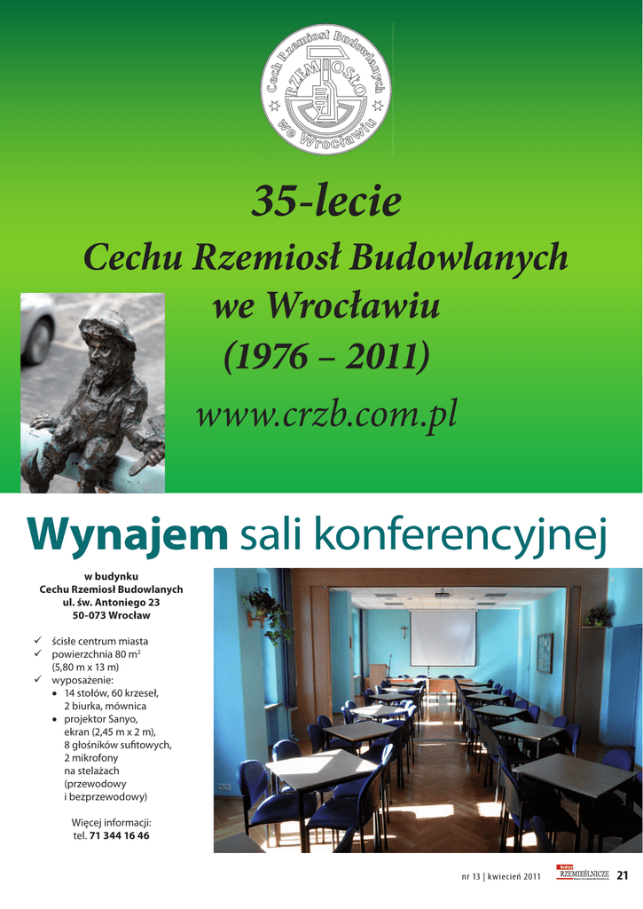 35-lecie Cechu Rzemiosł Budowlanych we Wrocławiu (1976 – 2011) www.crzb.com.pl Wynajem sali konferencyjnej w budynku Cechu Rzemiosł Budowlanych ul. św. Antoniego 23 50-073 Wrocław ścisłe centrum miasta powierzchnia 80 m2 (5,80 m x 13 m) wyposażenie: • 14 stołów, 60 krzeseł, 2 biurka, mównica • projektor Sanyo, ekran (2,45 m x 2 m), 8 głośników sufitowych, 2 mikrofony na stelażach (przewodowy i bezprzewodowy) Więcej informacji: tel. 71 344 16 46 nr 13 | kwiecień 2011 21 WIADOMOŚCI Z REGIONU Jubileusz Cechu N asze dolnośląskie rzemiosło ma bogatą historię. Nie wszyscy zapewne wiemy, że szybko zaczęło się ono rozwijać zaraz po wojnie. Dowodem na to jest fakt, że Cech Rzemiosł Odzieżowych i Włókienniczych ma już 65 lat. Sięgnijmy zatem do jego początków. Nieco historii Zaledwie pół roku po zakończeniu najstraszniejszej z wojen, dokładnie 2 grudnia 1945 roku, zawiązany został Cech Krawców we Wrocławiu. Aktu tego dokonał Karol Lazar, ówczesny prezes Izby Rzemieślniczej, działającej w naszym mieście od sierpnia 1945 r. Na spotkaniu założycielskim było zaledwie siedemnastu krawców, wśród nich – pierwszy krawiec w powojennym Wrocławiu Michał Stolarski oraz Franciszek Juszczak, mistrz krawiectwa męskiego, późniejszy wiceprezes, a następnie prezes Izby Rzemieślniczej. Tymczasem do Wrocławia i na Ziemie Odzyskane z różnych stron wciąż przybywali nowi mieszkańcy, w tym kolejni rzemieślnicy. Cech zatem szybko się rozwijał i już w lipcu 1946 roku liczba jego członków wzrosła do 150 osób. Pierwszym Starszym Cechu został wspomniany już Franciszek Juszczak. 14 września 1946 r. poświęcono sztandar Cechu Krawców. Cech Krawców, aktualnie działający jako Cech Rzemiosł Odzieżowych i Włókienniczych, przez dziesięciolecia gromadził wokół siebie rzesze rzemieślników, bardzo oddanych miastu i Ojczyźnie. Od początku istnienia organizacji jej członkowie brali czynny udział w pracach społecznych na rzecz Wrocławia. Wspierali organizacje społeczne, na odgruzowywanie miasta poświęcili 2000 godzin. W cechowych archiwach zachował się dokument, mówiący, że do porządkowania w czynie społecznym cmentarza oporowskiego zgłosiło się 564 krawców. Cech i skupieni w nim rzemieślnicy wiedzieli, jak bardzo Wrocławiowi, wrocławianom, ale też całemu krajowi potrzebna jest szeroko rozumiana pomoc. Fundowali książeczki mieszkaniowe dla sierot, organizowali zbiórki odzieży dla dzieci z domów dziecka, przekazywali datki na Centrum Zdrowia Dziecka. Przekazywali pieniądze na odbudowę stolicy, podarowali Wyższej Szkole Muzycznej we Wrocławiu togi rektorskie i dziekańskie. Jednocześnie nie zapominali o przyszłości rzemiosła. Systematycznie podnosili swoje kwalifikacje zawodowe, szkolili się na kursach pedagogicznych, kształcili kolejne pokolenia krawców, dziewiarzy, kapeluszników. Swoje umiejętności prezentowali na różnego rodzaju targach, wystawach, pokazach mody. Dbali też o integrację środowiska, organizując dla swoich członków i ich rodzin wycieczki, wieczorki taneczne, spotkania z okazji Święta Pracy czy Dnia Nauczyciela. Mijały kolejne lata i jubileusze. Przełom lat 1989/90 to początek polityczno-gospodarczej transformacji w kraju. Niestety, zmiana przepisów i warunków, w jakich przyszło funkcjonować teraz rzemiosłu, przyniosła Cechowi osłabienie. Liczba członków – z dwóch tysięcy w czasach świetności – bardzo szybko malała. Zrezygnowano z organizowania zabaw choinkowych dla dzieci, 22 nr 13 | kwiecień 2011 zmniejszyła się liczba pokazów, wycieczek, szkoleń. Coraz mniejsze też były wpływy z członkowskich składek, bez których trudno sobie wyobrazić sprawne funkcjonowanie Cechu. Na przekór tym trudnościom Cech przetrwał i pozostaje nadal aktywny zawodowo i społecznie. Wciąż posiada osobowość prawną i chociaż zrzesza niewiele zakładów, nadal prowadzi aktywną działalność statutową. Jak na dziarskiego 65-latka przystało, Jubilat utrzymuje stałe kontakty z rzemieślnikami z innych branż i miast, także poza granicami naszego kraju. Uczestniczy w różnego rodzaju konkursach i szkoleniach, organizuje spotkania i pielgrzymki, współpracuje z władzami miasta, instytucjami, organizacjami społecznymi, szkołami. Bierze udział w uroczystościach kościelnych i imprezach organizowanych nie tylko przez środowiska rzemieślnicze. W 1997 roku, wskutek katastrofalnej powodzi, zniszczeniu uległo aż osiemnaście spośród skupionych w Cechu zakładów. Tragedia wprawdzie skonsolidowała środowisko, ale z jej skutkami poszkodowani wówczas rzemieślnicy borykali się wiele lat. Odczuwają je do dziś. Na przekór jednak własnym problemom pamiętali o stałym propagowaniu w szkołach i w prasie historii rzemiosła i kultu zawodu. Spełnili też marzenia swoje i wielu innych rzemieślników. Otóż dzięki darczyńcom i środkom wła- snym powstał nowy sztandar cechowy, który został poświęcony 20 września 1998 r. w kościele św. Idziego. Aktualnie Cech Rzemiosł Odzieżowych i Włókienniczych zrzesza dziesięć zakładów. Starszym Cechu od 2001 roku jest Wanda Fok, mistrz krawiectwa męskiego i damskiego. Największym marzeniem członków Cechu jest doprowadzić do tego, by liczba zrzeszonych w Cechu członków znów zaczęła wzrastać, a słowo „rzemieślnik” było wypowiadane z godnością, szacunkiem i dumą. Wanda Fok Uroczyste obchody 5 lutego br. miała miejsce uroczystość 65-lecia istnienia Cechu Rzemiosł Odzieżowych i Włókienniczych. W jubileuszu uczestniczyli przedstawiciele wielu organizacji cechowych z Dolnego Śląska. Przybył prezes Dolnośląskiej Izby Rzemieślniczej Zbigniew Ładziński. Oprócz niego w uroczystości wzięli udział m.in.: Starszy Cechu Rzemiosł Budowlanych Marian Fornalski, Starszy Cechu Rzemiosł Różnych w Oleśnicy Henryk Kruszelnicki, Starszy Cechu Rzemiosł Metalowych i Motoryz