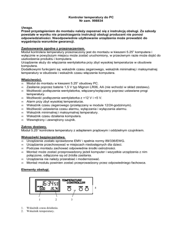 Kontroler temperatury do PC Nr zam. 998834 Uwaga. Przed przystąpieniem do montażu należy zapoznać się z instrukcją obsługi. Za szkody powstałe w wyniku nie przestrzegania instrukcji obsługi producent nie ponosi odpowiedzialności. Nieodpowiednie użytkowanie urządzenia może prowadzić do wygaśnięcia warunków gwarancji. Zastosowanie zgodne z przeznaczeniem. Moduł kontrolera temperatury przeznaczony jest do montażu w kieszeni 5.25” komputera i wyłącznie w powyższym miejscu może zostać uruchomiony, w przeciwnym razie może dojść do uszkodzenia produktu i komputera. Urządzenie służy do włączania wentylatorka przy zbyt wysokiej temperaturze w obudowie komputera. Dodatkowymi funkcjami są: wskaźnik czasu zegarowego, wskaźnik minimalnej i maksymalnej temperatury w obudowie i wskaźnik czasu włączenie komputera. Właściwości. • Moduł do montażu w kieszeni 5.25” obudowy PC. • Zasilanie poprzez baterie 1,5 V typ Mignon LR06, AA (nie wchodzi w skład zestawu). • Możliwość podłączenia wentylatorka, włączany/wyłączany poprzez ustawiane progi temperatury. • Możliwość podłączenia wentylatorka z +12 V i +5 V. • Alarm przy zbyt wysokiej temperaturze. • Wskaźnik czasu zegarowego (przełączany w module 12/24-godzinnym). • Możliwość ustawienia czasu alarmu, wyłączania i wyłączania alarmu. • Wskaźnik minimalnej i maksymalnej temperatury. • Wskaźnik czasu działania komputera. • Wewnętrzny i zewnętrzny czujnik. Zakres dostawy. Moduł 5.25” kontrolera temperatury z adapterem prądowym i oddzielnym czujnikiem. Wskazówki bezpieczeństwa. • Urządzenie zostało sprawdzone EMV i spełnia normy 89/336/EWG. • Urządzenie przechowywać w miejscach niedostępnych dla dzieci. • Podczas montażu zachować odpowiednie środki ostrożności. • Montaż może zostać przeprowadzony jeżeli komputer i wszystkie urządzenia z nim połączone, odłączone są od źródła zasilania. • Urządzenia nie należy przerabiać i modernizować. • Montaż modułu powinien zostać przeprowadzony przez odpowiedniego fachowca. Elementy obsługi. 4 1 1. 2. 2 Wskaźnik czasu działania. Wskaźnik temperatury. 3 3. 4. Sygnalizator. Przyciski obsługi: MODE, HOUR, MIN. Wskaźnik czasu działania (godziny/minuty) zacznie działać po włączeniu komputera. Po wyłączeniu komputera wskaźnik zakończy odliczanie . Przy ponownym włączeniu komputera dotychczasowa wartość zostanie wykasowana i licznik rozpocznie odliczanie od wartości 0.00. Wskaźnik temperatury wskazuje chwilową wartość pomiaru wewnętrznego i zewnętrznego czujnika pomiaru ( w zależności od tego, który czujnik jest aktywny). Przy wskaźniku MIN/MAX wskazana zostanie w tym miejscu wartość najwyższa i najniższa. Z prawej strony umieszczone są trzy przyciski obsługujące MODE, HOUR i MIN. Naciśnięcie jednego z nich potwierdzane jest sygnałem akustycznym. Za czterema otworkami między przyciskami MODE i HOUR znajduje się brzęczyk sygnalizujący wystąpienie alarmu. Ustawienie mostków wtykowych JP1: Przełączenie formatu 12/24-godzinnego Ustawienie pozwala wybrać formę wskaźnika czasu zegarowego- 12- lub 24 –godzinny. 1. Wskaźnik 12-godzinny (z AM/PM). 2. Wskaźnik 24-godzinny. JP2: Sygnał alarmu przy włączonym/wyłączonym wentylatorku Przy przekroczeniu ustawionego zakresu temperatury, jeżeli wentylatorek powinien zostać włączony/ wyłączony, nastąpi krótki sygnał alarmowy. 1. Alarm wyłączony. 2. Alarm włączony. JP3. Wewnętrzny/ zewnętrzny czujnik. Należy w tu podłączyć oddzielny czujnik. Aby korzystać z czujnika wewnętrznego, należy odłączyć czujnik zewnętrzny i ustawić mostek wtykowy. Wewnętrzny czujnik (na wewnętrznej stronie płytki kontrolera temperatury). JP4: Podłączenie zasilania/ wentylatorka. Do wejścia tego należy podłączyć kabel z wtykiem prądowym (dla wentylatorka) i gniazdo prądu (dla zasilania poprzez zasilacz sieciowy komputera). Włożenie baterii. Do zasilania kontrolera temperatury niezbędna jest jedna bateria typu Mignon LR06. Odkręcić śruby mocujące pokrywy pojemnika baterii i zdjąć ostrożnie pokrywę. Włożyć baterię, przestrzegając prawidłowego rozmieszczenia biegunów. Montaż i podłączenie. • • • • • • • • Przed dokonaniem montażu ustawić mostki wtykowe i włożyć prawidłowo baterie. Wyłączyć komputer i urządzenia peryferyjne. Wszystkie urządzenia odłączy od źródła napięcia sieciowego, wyjmując wtyczki z gniazda. Wyłączenie poprzez przełącznik sieciowy nie jest wystarczające. Odkręcić obudowę komputera i zdjąć ostrożnie pokrywę. Wyjąć przesłonę kieszeni 5.25”. Umieścić moduł w kieszeni, zwracając uwagę, aby przewody nie zostały uszkodzone lub zgięte. Przykręcić moduł na stałe odpowiednimi śrubami. Wetknąć podłączenie prądu 5.25” do gniazda prądu modułu, wentylatorek podłączyć do wtyku prądowego. Umieścić czujnik temperatury np. za pomocą łącznika, w miejscu, które ma być kontrolowane. Jeżeli długość jednego łącznika kabla nie jest wystarczająca, połączyć ze sobą kilka łączników. Skręcić obudowę i podłączyć pozostałe akcesoria. Podłączyć komputer do zasilania i włączyć. Ustawienie czasu zegarowego, alarmu temperatury itp. Ustawienie różnych wskaźników odbywa się zgodnie z poniższym opisem, zawsze w tej samej kolejności. Ustawienie czasu zegarowego. • Nacisnąć i przytrzymać przycisk MODE przez ok. 4 sek. • Czas zegarowy zacznie pulsować. Przyciskiem HOUR ustawić odpowiednią wartość godziny, przyciskiem MIN- minuty. Przytrzymanie jednego z powyższych przycisków spowoduje szybszą zmianę wartości danego wskaźnika. Ustawienie czasu alarmu. • Nacisnąć krótko przycisk MODE. • Czas alarmu zacznie pulsować. Przyciskiem HOUR ustawić odpowiednią wartość godziny, przyciskiem MIN- minuty. Przytrzymanie jednego z powyższych przycisków spowodu