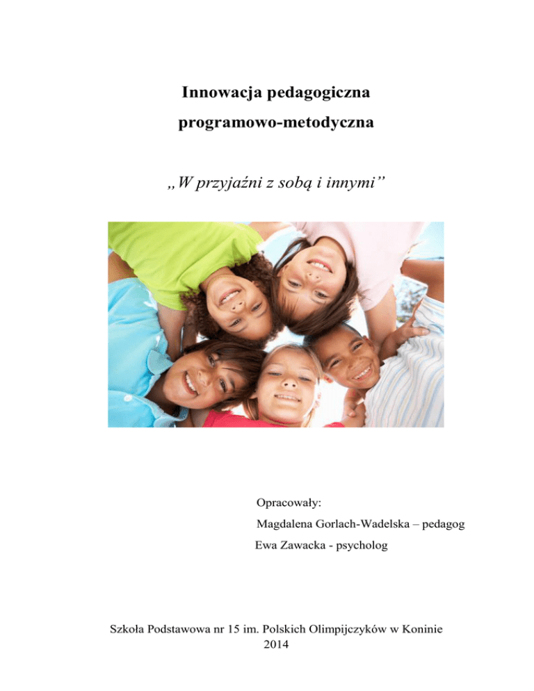 Innowacja pedagogiczna programowo-metodyczna „W przyjaźni z sobą i innymi” Opracowały: Magdalena Gorlach-Wadelska – pedagog Ewa Zawacka - psycholog Szkoła Podstawowa nr 15 im. Polskich Olimpijczyków w Koninie 2014 Wstęp Inspiracją do opracowania innowacji pt. „W przyjaźni z sobą i innymi” stały się dla nas refleksje wychowawców klas, nauczycieli i rodziców na temat trudności dzieci w radzeniu sobie z sytuacjami trudnymi, budowaniu prawidłowych relacji oraz przestrzeganiu zasad obowiązujących w szkole. Ponadto obserwacja funkcjonowania uczniów w grupie rówieśniczej uświadamia nam jak duża jest skala problemu w radzeniu sobie w sferze społecznej. Współczesna szkoła obok funkcji edukacyjnej, pełni bardzo ważną rolę wychowawczą. To tutaj uczniowie spędzają znaczną część swojego czasu. Przeżywają sukcesy i niepowodzenia. Zdobywają wiedzę, ale poznają także siebie, uczą się budować pozytywne relacje z innym ludźmi. Umiejętność bycia z drugim człowiekiem ma znaczący wpływ na to w jaki sposób dziecko postrzega i ocenia siebie, jak kształtują się jego kontakty z rówieśnikami, ale i dorosłymi. Dzięki pozytywnym doświadczeniom zdobywanym w szkole, w domu, w grupie rówieśniczej dzieci zaspokajają swoje najważniejsze potrzeby: bycia akceptowanym, lubianym, kochanym, potrzebnym. Mogą czuć się ważne i przynależeć do grup. Zdobywają wiedzę na temat swoich możliwości, mocnych stron. Zajęcia w grupie umożliwiają im wzajemne poznawanie siebie, uczą szacunku do innych. Uczniowie stają się bardziej otwarci na siebie, dostrzegają i rozumieją emocje swoje i innych. Zaplanowane działania w dużym stopniu modelują właściwe wzorce funkcjonowania w społeczeństwie. Dzieci dowiadują się, w jaki sposób skutecznie się komunikować, a co się z tym wiąże, jak rozwiązywać konflikty. Bardzo ważnym elementem jest przybliżenie uczestnikom zajęć wiedzy o emocjach. Dzieci często mają dużą trudność z przeżywaniem i okazywaniem emocji. W codziennym życiu uczucia są mało doceniane. Nawet w bliskim otoczeniu dziecka często okazywanie uczuć jest kłopotliwe. Dla prawidłowego rozwoju dziecka bardzo ważnym jest, by zrozumiało ono, że przeżywanie emocji jest naturalną odpowiedzią na to, co nas spotyka. Jest to zatem coś naturalnego i potrzebnego. Rozumienie siebie, innych, budowanie prawidłowych relacji, otrzymywanie wsparcia i akceptacji, powoduje, że wzrasta poczucie własnej wartości. Tworzenie pozytywnej samooceny, samoakceptacji jest bardzo ważnym elementem kształtowania się silnej osobowości. Tylko wtedy, gdy młody człowiek jest przekonany o swojej sile, mądrości i wartości, gotów jest stawiać opór naciskom ze strony grupy rówieśniczej i uniknąć zagrożeń związanych z uzależnieniami i innymi zachowaniami ryzykownymi. Zajęcia, których celem jest budowanie pozytywnej samooceny umożliwią dzieciom doświadczanie tego, że są wyjątkowe, lubiane przez innych, że mają wiele mocnych stron i talentów. Ponieważ szkoła jest miejscem, w którym spotykają się różne charaktery, osobowości, temperamenty i zainteresowania, uważamy, że rozumienie i akceptacja tych różnic pozwoli dzieciom kształtować prawidłowe relacje. Osoby wzrastające w atmosferze spokoju i wzajemnego zrozumienia, nie będą odczuwały lęku przed nowymi sytuacjami, będą miały większą odwagę w pokonywaniu problemów i lepiej poradzą sobie z sytuacjami trudnymi. Ponieważ pojawiające się trudności i konflikty są naturalnym elementem kontaktów międzyludzkich, (są nieuniknione właśnie dlatego, że różnimy się między sobą) dzieci powinny uczyć się radzenia sobie z nimi, a nie postrzegać je jako coś złego i niepożądanego. Obszarem, który został również w programie uwzględniony jest zdrowy styl życia. Proponowane zajęcia dają uczniom okazję do zastanowienia się nad codziennymi nawykami, korzystnymi i niekorzystnymi dla ich zdrowia. Ważne jest, aby zrozumieli, że oni sami są w znacznym stopniu odpowiedzialni za własne zdrowie. Uczniowie dowiedzą się również, jak na równowagę organizmu wpływają środki uzależniające. Realizacja programu innowacji „W przyjaźni z sobą i innymi” stwarza możliwość wspólnego zdobywania doświadczeń, poznawania siebie i innych. Pozwoli dzieciom zbliżyć się do siebie i nawiązać pozytywne relacje. Wiemy, jak ważna jest w życiu sfera emocjonalna i społeczna. To od niej w dużym stopniu zależy, czy z dziecka wyrośnie szczęśliwy, znający swoją wartość i szanujący innych dorosły. Ogólne założenia Wprowadzenie innowacji zostało poprzedzone diagnozą funkcjonowania emocjonalnego i społecznego uczniów naszej szkoły. Innowacja zawiera zagadnienia związane z wiedzą o systemach wartości, wpływach społecznych, umiejętnościach radzenia sobie z sytuacjami trudnymi i rozwiązywaniem konfliktów. Zaprezentowana innowacja została opracowana na podstawie programu zajęć profilaktyczno-wychowawczych dla klas I-III i IV-VI „Spójrz inaczej”. Zawiera propozycje grupowych zajęć oraz propozycję wspólnych rajdów i organizacji spektakli tematycznych. Formy te mają przyczynić się do osiągnięcia zamierzonych celów oraz sprawdzenia skuteczności i efektywności podejmowanych działań. Uczestnikami programu będą wybrani uczniowie klas pierwszych i czwartych. Typowanie uczniów uzależnione będzie od funkcjonowania ucznia na terenie szkoły i w środowisku rodzinnym na zasadzie dobrowolności. Przez okres 3 lat będą uczestniczyć w nieobowiązkowych zajęciach pozalekcyjnych. Miejsce realizacji: Szkoła Podstawowa nr 15 im. Polskich Olimpijczyków w Koninie Termin realizacji: 01.09.2014r. – 23.06.2017r. Forma zajęć innowacyjnych: nieobowiązkowe zajęcia pozalekcyjne - 1 godzina tygodniowo Odpowiedzialni za realizację programu: Magdalena Gorlach-Wadelska- pedagog – prowadzenie zajęć dla