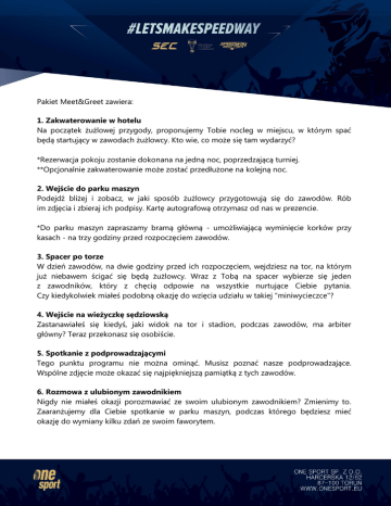 Pakiet Meet&Greet zawiera: 1. Zakwaterowanie w hotelu Na początek żużlowej przygody, proponujemy Tobie nocleg w miejscu, w którym spać będą startujący w zawodach żużlowcy. Kto wie, co może się tam wydarzyć? *Rezerwacja pokoju zostanie dokonana na jedną noc, poprzedzającą turniej. **Opcjonalnie zakwaterowanie może zostać przedłużone na kolejną noc. 2. Wejście do parku maszyn Podejdź bliżej i zobacz, w jaki sposób żużlowcy przygotowują się do zawodów. Rób im zdjęcia i zbieraj ich podpisy. Kartę autografową otrzymasz od nas w prezencie. *Do parku maszyn zapraszamy bramą główną - umożliwiającą wyminięcie korków przy kasach - na trzy godziny przed rozpoczęciem zawodów. 3. Spacer po torze W dzień zawodów, na dwie godziny przed ich rozpoczęciem, wejdziesz na tor, na którym już niebawem ścigać się będą żużlowcy. Wraz z Tobą na spacer wybierze się jeden z zawodników, który z chęcią odpowie na wszystkie nurtujące Ciebie pytania. Czy kiedykolwiek miałeś podobną okazję do wzięcia udziału w takiej "miniwycieczce"? 4. Wejście na wieżyczkę sędziowską Zastanawiałeś się kiedyś, jaki widok na tor i stadion, podczas zawodów, ma arbiter główny? Teraz przekonasz się osobiście. 5. Spotkanie z podprowadzającymi Tego punktu programu nie można ominąć. Musisz poznać nasze podprowadzające. Wspólne zdjęcie może okazać się najpiękniejszą pamiątką z tych zawodów. 6. Rozmowa z ulubionym zawodnikiem Nigdy nie miałeś okazji porozmawiać ze swoim ulubionym zawodnikiem? Zmienimy to. Zaaranżujemy dla Ciebie spotkanie w parku maszyn, podczas którego będziesz mieć okazję do wymiany kilku zdań ze swoim faworytem. 7. Zdjęcie z ulubionym zawodnikiem Po zakończonej rozmowie zrobimy Wam - Tobie oraz wskazanemu przez Ciebie zawodnikowi - zdjęcie na tle ścianki wywiadowej. Fotka trafi następnie na Twoją skrzynkę e-mailową. 8. Obecność na murawie podczas prezentacji Już raz byłeś na torze, ale co powiesz na możliwość obejrzenia z bliska przedmeczowej prezentacji zawodników? Podejdź pod scenę i poczuj rosnące emocje. 9. Miejsce na trybunie VIP Teraz wiesz już najlepiej, że rozpoczynające się zawody będą ekscytujące, a Ty obejrzysz je z najlepszego miejsca na trybunie głównej. Usiądź wśród VIP-ów i delektuj się widowiskiem. 10. Strefa gastronomiczna VIP Zgłodniałeś? A może masz ochotę na "małe co nieco"? Szwedzki stół i zimne napoje, również te dozwolone od lat osiemnastu, czekać będą na Ciebie w strefie gastronomicznej VIP. 11. Ponowna wizyta w parku maszyn Znasz już wyniki końcowe turnieju, możesz więc pogratulować zwycięstwa najlepszemu zawodnikowi. Umożliwi Ci to ponowne wejście do parku maszyn, tuż po zakończeniu ceremonii dekoracji najlepszych żużlowców. 12. Pamiątka z zawodów Jesteśmy przekonani, że pakiet Meet&Greet w pełni Ciebie zadowolił. Na zakończenie tej przygody otrzymasz od nas pamiątkowy laminat, oficjalny plakat oraz zestaw gadżetów, które przez długie lata przypominać będą Tobie o naszych zawodach. Cena pakietu Meet&Greet: 1500 złotych z hotelem zarezerwowanym na jedną noc; 1200 złotych bez hotelu.