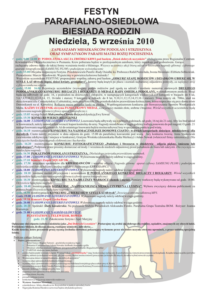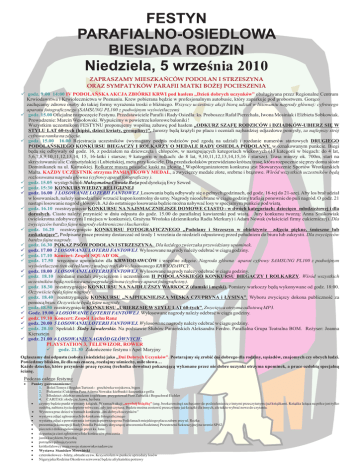 FESTYN PARAFIALNO-OSIEDLOWA BIESIADA RODZIN Niedziela, 5 wrzeœnia 2010 ZAPRASZAMY MIESZKAÑCÓW PODOLAN I STRZESZYNA ORAZ SYMPATYKÓW PARAFII MATKI BO¯EJ POCIESZENIA ü godz. 9:00 14:00 IV PODOLAÑSKA AKCJA ZBIÓRKI KRWI pod has³em „Dzieñ dobrych uczynków” obs³ugiwana przez Regionalne Centrum Krwiodawstwa i Krwiolecznictwa w Poznaniu. Krew pobierana bêdzie w profesjonalnym autobusie, który zaparkuje pod probostwem. Gor¹co zachêcamy zdrowe osoby do takiej formy wyra¿enia troski o bliŸniego. Wszyscy uczestnicy akcji bior¹ udzia³ w losowaniu nagrody g³ównej: cyfrowego aparatu fotograficznego (SAMSUNG PL100 z podwójnym wyœwietlaczem) ü godz. 15.00 Oficjalne rozpoczêcie Festynu. Przedstawiciele Parafii i Rady Osiedla: ks. Proboszcz Rafa³ Pierzcha³a, Iwona Mosiniak i El¿bieta Sobkowiak. Prowadzenie: Marcin Weso³owski. Wypuœcimy w powietrze kolorowe baloniki ! Wszystkim uczestnikom FESTYNU proponujemy wspóln¹ zabawê pod has³em „ODKURZ SZAFÊ RODZICÓW i DZIADKÓW-UBIERZ SIÊ W STYLU LAT 60-tych (hipisi, dzieci kwiaty, grempliny)”. Jurorzy bêd¹ kr¹¿yli po placu i oceniali najbardziej odjazdowe pomys³y, za najlepszy strój cyfrowa ramka na zdjêcia. ü godz. 15.00 16.00 Rejestracja uczestników (wymagany podpis rodziców pod zgod¹ na udzia³) i rozdanie numerów startowych DRUGIEGO PODOLAÑSKIEGO KONKURSU BIEGACZY I ROLKARZY O MEDALE RADY OSIEDLA PODOLANY, w oznakowanym punkcie. Biegi bêd¹ siê odbywa³y od godz. 16, z podzia³em na dziewczêta i ch³opców, w nastêpuj¹cych kategoriach wiekowych (13 kategorii w biegach: do 4 lat, 5,6,7,8,9,10,11,12,13,14, 15, 16-latki i starsze; 9 kategorii w rolkach: do 8 lat, 9,10,11,12,13,14,15,16 i starsze). Trasa mierzy ok. 700m, start na skrzy¿owaniu ulic Czorsztyñskiej i Lubieñskiej, meta przy koœciele. Dla przedszkolaków przewidziano krótsz¹ trasê, która rozpocznie siê przy domu sióstr Dominikanek na ul. Kartuskiej. Rolkarze musz¹ posiadaæ kaski na g³owie ! Wspó³organizatorem konkursu jest Stowarzyszenie Sportów Wrotkarskich Malta. KA¯DY UCZESTNIK otrzyma PAMI¥TKOWY MEDAL, a zwyciêzcy medale z³ote, srebrne i br¹zowe. Wœród wszystkich uczestników bêd¹ rozlosowana nagroda g³ówna (cyfrowy aparat fotograficzny ). ü godz. 15.05 wystêp Scholi Maksymalna Chwa³a Bo¿a pod dyrekcj¹ Ewy Szwed ü godz. 15:30 KONKURS WIEDZY RELIGIJNEJ ü godz. 16.00 1 LOSOWANIE LOTERII FANTOWEJ. Losowania bêd¹ odbywa³y siê o pe³nych godzinach, od godz. 16-tej do 21-szej. Aby los bra³ udzia³ w losowaniach, nale¿y samodzielnie wrzuciæ kupon kontrolny do urny. Nagrody nieodebrane w ci¹gu godziny trafiaj¹ ponownie do puli nagród. O godz. 21 nast¹pi losowanie nagród g³ównych.A¿ do ostatniego losowania bêdzie mo¿na nabywaæ losy w specjalnym punkcie pod wiat¹. ü godz. 16.10 rozstrzygniêcie KONKURSU NA NAJSMACZNIEJSZE DOMOWE CIASTO - w dwóch kategoriach: dzieciêco m³odzie¿owej i dla doros³ych. Ciasto nale¿y przynieœæ w dniu odpustu do godz. 15.00 do parafialnej kawiarenki pod wiat¹. Jury konkursu tworz¹: Anna Staœkowiak (wielokrotna zdobywczyni I miejsca w konkursie), Gra¿yna Wroñska (dziennikarka Radia Merkury) i Adam Nowak (w³aœciciel firmy cukierniczej). Dla zwyciêzców bardzo fajne nagrody elektroniczne i kucharskie. ü godz. 16.20 rozstrzygniêcie KONKURSU FOTOGRAFICZNEGO „Podolany i Strzeszyn w obiektywie zdjêcia piêkne, œmieszne lub zaskakuj¹ce”. Podpisane prace prosimy dostarczaæ od œrody 1 wrzeœnia do niedzieli odpustowej przed po³udniem do biura lub zakrystii. Dla zwyciêzców bardzo fajne nagrody. ü godz. 16.30 POKAZ PSÓW PODOLAN I STRZESZYNA. Dla ka¿dego zwierzaka przewidziany upominek. ü godz. 17.00 2 LOSOWANIE LOTERII FANTOWEJ. Wylosowane nagrody nale¿y odebraæ w ci¹gu godziny. ü godz. 17.10 Koncert: Zespó³ SQUAD`OK ü godz. 17.50 wrêczenie upominków dla KRWIODAWCÓW i wspólne zdjêcie. Nagroda g³ówna aparat cyfrowy SAMSUNG PL100 z podwójnym wyœwietlaczem (ten od reklamy z ma³p¹) trafi do wylosowanego KRWIODAWCY. ü godz. 18.00 3 LOSOWANIE LOTERII FANTOWEJ. Wylosowane nagrody nale¿y odebraæ w ci¹gu godziny. ü godz. 18.10 rozdanie medali zwyciêzcom i uczestnikom II PODOLAÑSKIEGO KONKURSU BIEGACZY I ROLKARZY. Wœród wszystkich uczestników bêd¹ rozlosowana nagroda g³ówna (cyfrowy aparat fotograficzny). ü godz. 18.30 rozstrzygniêcie KONKURSU NA NAJD£U¯SZY WARKOCZ (damski i mêski). Pomiary warkoczy bêd¹ wykonywane od godz. 18:00. Oczywiœcie bêd¹ fajne nagrody. ü godz. 18.40 rozstrzygniêcie KONKURSU „NAJPIÊKNIEJSZA MÊSKA CZUPRYNA i £YSINA”. Wyboru zwyciêzcy dokona publicznoœæ za pomoc¹ braw. Oczywiœcie bêd¹ fajne nagrody. ü godz. 18.50 rozstrzygniêcie KONKURSU „UBIERZ SIÊ W STYLU LAT 60-tych”. Zwyciêzca otrzyma odlotow¹ MP3. ü Godz. 19.00 4 LOSOWANIE LOTERII FANTOWEJ. Wylosowane nagrody nale¿y odebraæ w ci¹gu godziny. ü godz. 19.10 Koncert: Zespó³ Lechu Ranz ü godz. 20.00 5 LOSOWANIE LOTERII FANTOWEJ. Wylosowane nagrody nale¿y odebraæ w ci¹gu godziny. ü godz. 20.10 Spektakl: Œluby kawalerskie. Na podstawie Œlubów Panieñskich Aleksandra Ferdro. Parafialna Grupa Teatralna BOM. Re¿yser: Joanna Kiersztejn ü godz. 21.00 6 LOSOWANIE NAGRÓD G£ÓWNYCH: PLAYSTATION 3, TELEWIZOR, ROWER ü godz. 21.30 Zakoñczenie festynu i Apel Maryjny Og³aszamy dni odpustu (sobota i niedziela) jako „Dni Dobrych Uczynków”. Postarajmy siê zrobiæ coœ dobrego dla rodziny, s¹siadów, znajomych czy obcych ludzi. Powiedzmy bliskim, ile dla nas znacz¹, rozdajmy uœmiechy, mi³e s³owa… Ka¿de dziecko, które przyniesie pracê rêczn¹ (technika dowolna) pokazuj¹c¹ wykonane przez nie dobre uczynki otrzyma upominek, a prace ozdobi¹ specjaln¹ œcianê. Podczas ca³ego festynu: · Punkty gastronomiczne: 1. Boleœ Tomys i Bogdan Turtooñ - grochówka wojskowa, bigos 2. Piekarnia i Cukiernia PanaAdama Nowaka: kie³baski i kaszanka z grilla 3. M³odzie¿: chleb ze smalcem i ogórkiem przygotowa