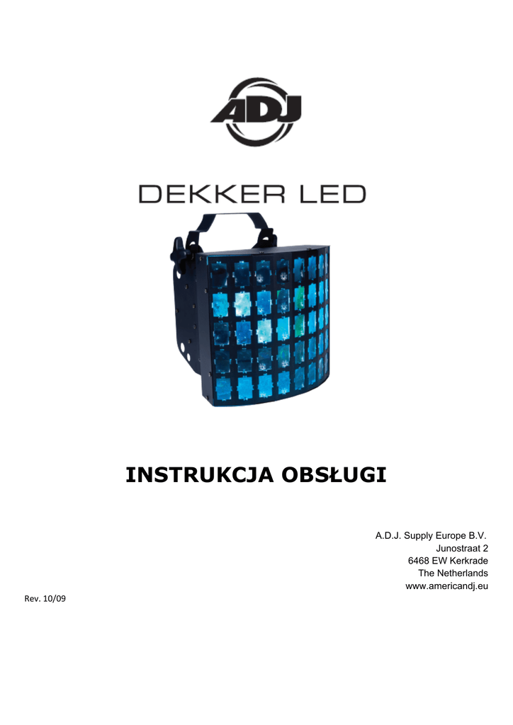 INSTRUKCJA OBSŁUGI A.D.J. Supply Europe B.V. Junostraat 2 6468 EW Kerkrade The Netherlands www.americandj.eu Rev. 10/09 Spis treści WSTĘP ..................................................................................................................................................................................... 3 WSKAZÓWKI OGÓLNE ............................................................................................................................................................ 3 CHARAKTERYSTYKA ................................................................................................................................................................. 3 ŚRODKI BEZPIECZEŃSTWA ...................................................................................................................................................... 4 USTAWIENIA ........................................................................................................................................................................... 4 DZIAŁANIE ............................................................................................................................................................................... 6 2 KANAŁY DMX – WARTOŚCI I CECHY ..................................................................................................................................... 8 8 KANAŁÓW DMX ‐ WARTOŚCI I CECHY ................................................................................................................................ 8 WYMIANA BEZPIECZNIKA ....................................................................................................................................................... 9 USUWANIE USTEREK ............................................................................................................................................................... 9 CZYSZCZENIE ........................................................................................................................................................................... 9 SPECYFIKACJA: ...................................................................................................................................................................... 10 ROHS oraz WEEE ................................................................................................................................................................. 11 A.D.J. Supply Europe B.V. – www.americandj.eu – Dekker™ Instrukcja Obsługi Str. 2 INTRODUZIONE WSTĘP Wypakowanie: Dziękujemy za zakup urządzenia świetlnego Dekker firmy American DJ®. Każdy egzemplarz Dekker został gruntownie przetestowany, co jest gwarancją jego prawidłowego funkcjonowania. Przed rozpakowaniem należy sprawdzić czy opakowanie nie zostało uszkodzone w czasie transportu. W razie stwierdzenia uszkodzenia opakowania, dokładnie sprawdź, czy nie nastąpiło uszkodzenie sprzętu oraz upewnij się, że wszystkie części konieczne do obsługi urządzenia przybyły w stanie nienaruszonym. W razie stwierdzenia usterek lub braku części, należy skontaktować się z bezpłatnym biurem obsługi klienta. Prosimy o taki kontakt przed podjęciem decyzji o zwrocie urządzenia do sprzedawcy. Wstęp: Urządzenie Dekker jest kontynuacją wysiłków firmy American DJ zmierzających do stworzenia niedrogich inteligentnych urządzeń emitujących światło o wysokiej jakości. Dekker jest inteligentnym diodowym urządzeniem świetlnym typu Wash kompatybilnym z systemem DMX. Wytwarza ono efekt świetlny Moonflower (drobne wzory świetlne). Urządzenie może być używane samodzielnie (Stand Alone), w konfiguracji Maaster/Slave lub sterowane z poziomu konsoli DMX. Urządzenie Dekker ma cztery tryby operacyjne: tryb reakcji na dźwięk (Sound Active Mode), tryb automatyczny (Auto Mode), tryb statyczny (Static Mode) oraz tryb sterowania sygnałem DMX. Obsługa klienta: W razie jakichkolwiek problemów, prosimy o kontakt z zaufanym punktem sprzedaży American Audio. Istnieje również możliwość bezpośredniego kontaktu z nami. Można to zrobić poprzez naszą stronę internetową www.americandj.eu oraz pisząc na adres: [email protected] Ostrzeżenie! Aby zapobiec lub zmniejszyć ryzyko porażenia prądem lub pożaru, nie włączaj urządzenia w warunkach deszczowych lub przy podwyższonej wilgotności powietrza. Uwaga! Urządzenie nie zawiera żadnych elementów przeznaczonych do serwisowania przez użytkownika. Gwarancja na urządzenie traci ważność, jeśli użytkownik zdecyduje się na samowolną naprawę którejkolwiek części. Jeżeli jakaś część wymaga naprawy to należy się skontaktować z American DJ®. PROSIMY o recykling opakowania, jeśli to możliwe. WSKAZÓWKI OGÓLNE Aby w pełni wykorzystać możliwości urządzenia, prosimy o przeczytanie instrukcji obsługi i zapoznanie z podstawowymi funkcjami urządzenia. Instrukcja zawiera ważne informacje dotyczące bezpieczeństwa obsługi oraz sposobu konserwacji urządzenia. Prosimy o zachowanie instrukcji obsługi w celu ponownego użycia. CHARAKTERYSTYKA • Technologia Q4 LED • Zamocowany Uchwyt do Wieszania • Reakcja na Dźwięk (Sound-Active) • Niewielki Ciężar • Strobowanie • Elektroniczne Ściemnianie 0-100% • Wbudowany Mikrofon • Protokół DMX-512 • 2 Tryby DMX: 2 Kanałowy oraz 8 Kanałowy A.D.J. Supply Europe B.V. – www.americandj.eu – Dekker™ Instrukcja Obsługi Str. 3 ŚRODKI BEZPIECZEŃSTWA Aby zmniejszyć ryzyko porażenia prądem lub pożaru, nie włączaj urządzenia w warunkach deszczowych lub przy podwyższonej wilgotności powietrza. Trzymaj urządzenie z dala od wody lub innych płynów. Upewnij się, że napięcie wymagane przez urządzenie jest takie samo jak napięcie w sieci. Nie uruchamiaj urządzenia, jeśli przewód zasilający jest uszkodzony. Nie próbuj usunąć lub wyłamać bolca uziemienia z wtyczki. Jego zadaniem jest 