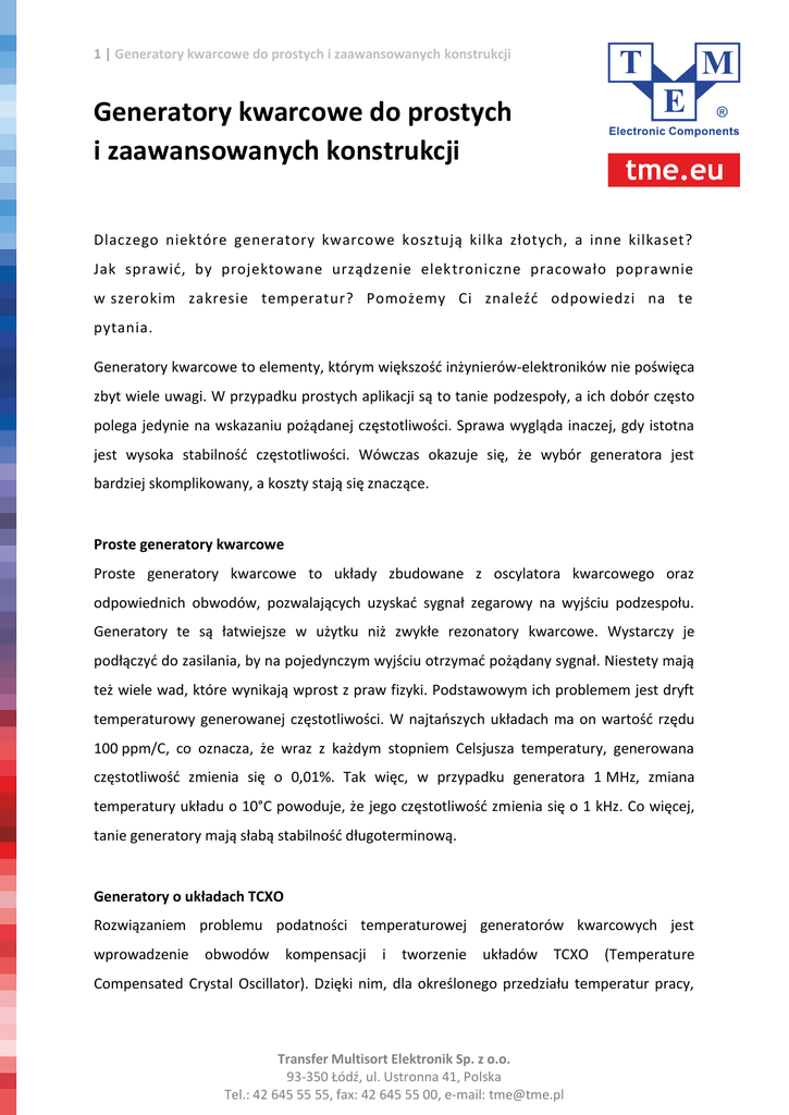 1 | Generatory kwarcowe do prostych i zaawansowanych konstrukcji Generatory kwarcowe do prostych i zaawansowanych konstrukcji Dlaczego niektóre generatory kwarcowe kosztują kilka złotych, a inne kilkaset? Jak sprawić, by projektowane urządzenie elek troniczne pracowało poprawnie w szerokim zakresie temperatur? Pomożemy Ci znaleźć odpowiedzi na te pytania. Generatory kwarcowe to elementy, którym większość inżynierów-elektroników nie poświęca zbyt wiele uwagi. W przypadku prostych aplikacji są to tanie podzespoły, a ich dobór często polega jedynie na wskazaniu pożądanej częstotliwości. Sprawa wygląda inaczej, gdy istotna jest wysoka stabilność częstotliwości. Wówczas okazuje się, że wybór generatora jest bardziej skomplikowany, a koszty stają się znaczące. Proste generatory kwarcowe Proste generatory kwarcowe to układy zbudowane z oscylatora kwarcowego oraz odpowiednich obwodów, pozwalających uzyskać sygnał zegarowy na wyjściu podzespołu. Generatory te są łatwiejsze w użytku niż zwykłe rezonatory kwarcowe. Wystarczy je podłączyć do zasilania, by na pojedynczym wyjściu otrzymać pożądany sygnał. Niestety mają też wiele wad, które wynikają wprost z praw fizyki. Podstawowym ich problemem jest dryft temperaturowy generowanej częstotliwości. W najtańszych układach ma on wartość rzędu 100 ppm/C, co oznacza, że wraz z każdym stopniem Celsjusza temperatury, generowana częstotliwość zmienia się o 0,01%. Tak więc, w przypadku generatora 1 MHz, zmiana temperatury układu o 10°C powoduje, że jego częstotliwość zmienia się o 1 kHz. Co więcej, tanie generatory mają słabą stabilność długoterminową. Generatory o układach TCXO Rozwiązaniem problemu podatności temperaturowej generatorów kwarcowych jest wprowadzenie obwodów kompensacji i tworzenie układów TCXO (Temperature Compensated Crystal Oscillator). Dzięki nim, dla określonego przedziału temperatur pracy, Transfer Multisort Elektronik Sp. z o.o. 93-350 Łódź, ul. Ustronna 41, Polska Tel.: 42 645 55 55, fax: 42 645 55 00, e-mail: [email protected] 2 | Generatory kwarcowe do prostych i zaawansowanych konstrukcji dryft krótkotrwały, w zależności od modelu, redukowany jest do poziomu od 0,28 ppm do 2,00 ppm. Deklarowany zakres temperatury pracy i generowana częstotliwość wpływają na dokładną wartość stabilności częstotliwości. Przykładem układów TCXO są generatory serii IQXT-200 i IQXT-210 firmy IQD Frequency Products. Modele IQXT-210 wyróżniają się jeszcze skuteczniejszą kompensacją temperaturową i pozwalają uzyskać stabilność częstotliwości na poziomie 0,05 ppm ÷ 1,00 pm. Warto przy tym zauważyć, że dotyczy to także modeli przeznaczonych do pracy w temperaturze od -40°C do +85°C. Generatory o układach TCVCXO Generatory serii IQXT-200 i IQXT-210, których dalsza część nazwy przyjmuje wartości „-3” lub „-4” (np. IQXT-210-2) określane są mianem układów TCVCXO (Temperature Compensated Voltage Controlled Crystal Oscillator). Mają one wbudowaną możliwość ręcznej regulacji generowanej częstotliwości za pomocą napięcia. Zakres regulacji jest liniowy (z dokładnością do 10%) i wynosi od +/-10 ppm do +/-15 ppm. Napięcie sterujące dla IQXT-210 mieści się w zakresie 0 V - 3 V, a dla IQXT-200 wynosi od 0 V do 3,3 V. Podanie napięcia ze środka tych przedziałów powoduje utrzymanie częstotliwości referencyjnej. Im napięcie jest wyższe, tym wyższa generowana częstotliwość. Możliwość dodatkowej regulacji ma szczególne znaczenie w przypadku starzenia się układów. Dryft długoterminowy częstotliwości omawianych podzespołów nie przekracza +/1 ppm na rok, a więc regulacja napięciowa pozwala na kompensację tego dryftu w najgorszym przypadku nawet przez 10 lat. Transfer Multisort Elektronik Sp. z o.o. 93-350 Łódź, ul. Ustronna 41, Polska Tel.: 42 645 55 55, fax: 42 645 55 00, e-mail: [email protected] 3 | Generatory kwarcowe do prostych i zaawansowanych konstrukcji Generatory o układach OCXO Alternatywnym sposobem zapewniania wysokiej stabilności częstotliwości jest utrzymywanie stałej temperatury oscylatora. Z uwagi na to, że łatwiej jest kryształ podgrzewać niż go chłodzić, układy tego typu noszą nazwę OCXO (Oven Controlled Crystal Oscillator). Mają one rewelacyjną stabilność. Przykładem generatorów o tego typu układzie są serie IQOV-164 i IQOV-162 marki IQD Frequency Products. Stabilność IQOV-164 kształtuje się na poziomie 0,20 ppb ÷ 50,00 ppb (czyli 0,0002 ppm ÷ 0,05 ppm). Dryft długoterminowy nie przekracza 0,1 ppm/rok. W przypadku nieco tańszych układów serii IQOV-162 stabilność częstotliwości wynosi od 0,01 ppm do 0,1 ppm, a dryft nie przekracza 0,5 ppm/rok. Dostępne są generatory typu OCXO z regulowanym napięciem, posiadające zakres regulacji proporcjonalny do przewidywanego dryftu rocznego. Generatory o układach MCXO Ostatnią kategorię generatorów stanowią układy MCXO (Microcomputer Compensated Crystal Oscillator) wykorzystujące nowatorską technikę kompensacji temperaturowej. Do generatorów tego typu należy seria IQMT-100. Choć temperatura kryształu zmienia się, układy serii IQMT-100 są w stanie analizować jego pracę. Kompensują powstałą częstotliwość, uzyskując parametry zbliżone do generatorów typu OCXO, a jednocześnie mają znacznie mniejsze wymiary obudowy podzespołu. Stabilność temperaturowa układów IQMT-100 mieści się w zakresie od 0,05 ppm do 0,50 ppm, a dryft roczny nie przekracza 1 ppm. Wersje z wejściem do regulacji napięcia pozwalają na zmianę generowanej częstotliwości w zakresie nawet do +/-15 ppm. Podsumowanie Generatory firmy IQD Frequency Products o częstotliwościach z zakresu od 3,68 MHz do 100 MHz dostępne są w różnych odmianach. Ich nominalna częstotliwość pracy jest podawana z dużą dokładnością. Skuteczna kompensacja temperaturowa oraz stabilność długoo