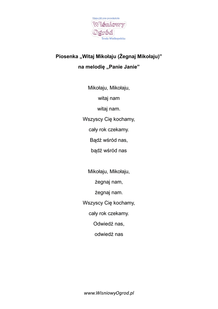 Piosenka „Witaj Mikołaju (Żegnaj Mikołaju)” na melodię „Panie Janie” Mikołaju, Mikołaju, witaj nam witaj nam. Wszyscy Cię kochamy, cały rok czekamy. Bądź wśród nas, bądź wśród nas Mikołaju, Mikołaju, żegnaj nam, żegnaj nam. Wszyscy Cię kochamy, cały rok czekamy. Odwiedź nas, odwiedź nas www.WisniowyOgrod.pl Piosenka „Jak upływa czas” Czas powoli płynie, kiedy jest mi smutno, kiedy wciąż narzekam i zły humor mam. Ref. Bądź zawsze wesoły, schowaj złe humory, szkoda każdej chwili i każdego dnia czas szybko ucieka, kiedy jest wesoło, kiedy mam kolegów i nie jestem sam www.WisniowyOgrod.pl Piosenka „Śniegowe gwiazdki” Śniegowe gwiazdki spadają, spadają. Dzieci je w dłonie chwytają, chwytają. Gwiazdki przez chwilę się mienią, się mienią zaraz się w wodę zamienią, zamienią Piosenka„Pani Zima” Patrzcie, patrzcie, zima biała wszystko śniegiem zasypała. Ref. Dzyń, dzyń, dzyń, buch, buch, buch Leci z nieba biały puch. Dzieci już witają zimę, każdy ma wesołą minę Ref.: Dzyń, dzyń,... Mknie na sankach z dziećmi zima, zaraz w zaspie się zatrzyma. www.WisniowyOgrod.pl Piosenka „Choinka” Przyjechała do nas choinka zielona, stoi w naszej sali pięknie przystrojona. Ref. La, la, la, choinka zielona, stoi w naszej sali pięknie przystrojona Wiszą na niej bombki, pierniki pachnące, duża złota gwiazda, ciasteczka chrupiące Ref. La, la, la... Święta się zbliżają, tańczą wszystkie dzieci, choinka lampkami jasno wszystkim świeci www.WisniowyOgrod.pl