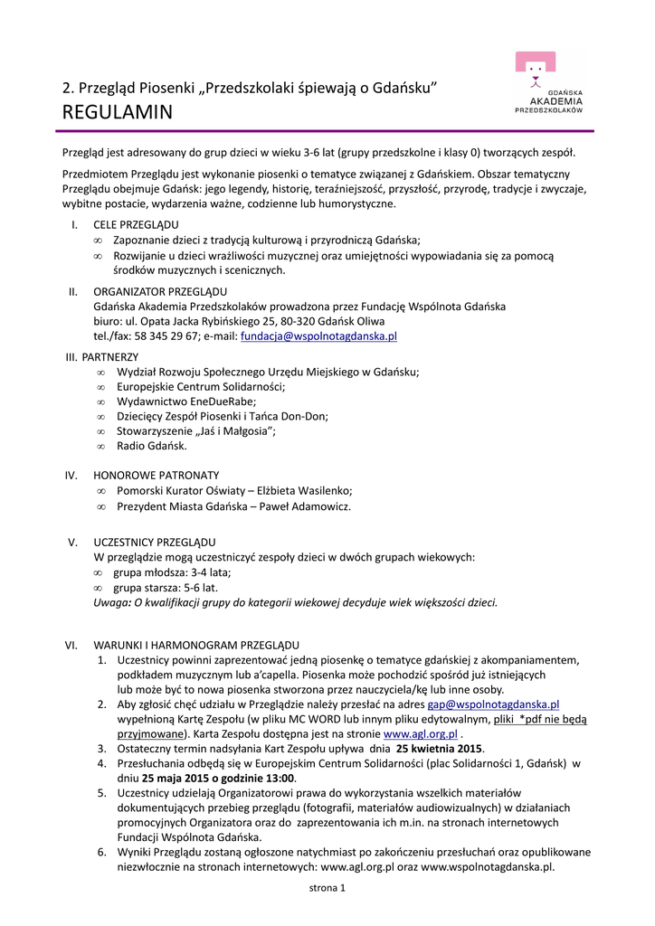 2. Przegląd Piosenki „Przedszkolaki śpiewają o Gdańsku” REGULAMIN Przegląd jest adresowany do grup dzieci w wieku 3-6 lat (grupy przedszkolne i klasy 0) tworzących zespół. Przedmiotem Przeglądu jest wykonanie piosenki o tematyce związanej z Gdańskiem. Obszar tematyczny Przeglądu obejmuje Gdańsk: jego legendy, historię, teraźniejszość, przyszłość, przyrodę, tradycje i zwyczaje, wybitne postacie, wydarzenia ważne, codzienne lub humorystyczne. I. CELE PRZEGLĄDU • Zapoznanie dzieci z tradycją kulturową i przyrodniczą Gdańska; • Rozwijanie u dzieci wrażliwości muzycznej oraz umiejętności wypowiadania się za pomocą środków muzycznych i scenicznych. II. ORGANIZATOR PRZEGLĄDU Gdańska Akademia Przedszkolaków prowadzona przez Fundację Wspólnota Gdańska biuro: ul. Opata Jacka Rybińskiego 25, 80-320 Gdańsk Oliwa tel./fax: 58 345 29 67; e-mail: [email protected] III. PARTNERZY • Wydział Rozwoju Społecznego Urzędu Miejskiego w Gdańsku; • Europejskie Centrum Solidarności; • Wydawnictwo EneDueRabe; • Dziecięcy Zespół Piosenki i Tańca Don-Don; • Stowarzyszenie „Jaś i Małgosia”; • Radio Gdańsk. IV. HONOROWE PATRONATY • Pomorski Kurator Oświaty – Elżbieta Wasilenko; • Prezydent Miasta Gdańska – Paweł Adamowicz. V. UCZESTNICY PRZEGLĄDU W przeglądzie mogą uczestniczyć zespoły dzieci w dwóch grupach wiekowych: • grupa młodsza: 3-4 lata; • grupa starsza: 5-6 lat. Uwaga: O kwalifikacji grupy do kategorii wiekowej decyduje wiek większości dzieci. VI. WARUNKI I HARMONOGRAM PRZEGLĄDU 1. Uczestnicy powinni zaprezentować jedną piosenkę o tematyce gdańskiej z akompaniamentem, podkładem muzycznym lub a’capella. Piosenka może pochodzić spośród już istniejących lub może być to nowa piosenka stworzona przez nauczyciela/kę lub inne osoby. 2. Aby zgłosić chęć udziału w Przeglądzie należy przesłać na adres [email protected] wypełnioną Kartę Zespołu (w pliku MC WORD lub innym pliku edytowalnym, pliki *pdf nie będą przyjmowane). Karta Zespołu dostępna jest na stronie www.agl.org.pl . 3. Ostateczny termin nadsyłania Kart Zespołu upływa dnia 25 kwietnia 2015. 4. Przesłuchania odbędą się w Europejskim Centrum Solidarności (plac Solidarności 1, Gdańsk) w dniu 25 maja 2015 o godzinie 13:00. 5. Uczestnicy udzielają Organizatorowi prawa do wykorzystania wszelkich materiałów dokumentujących przebieg przeglądu (fotografii, materiałów audiowizualnych) w działaniach promocyjnych Organizatora oraz do zaprezentowania ich m.in. na stronach internetowych Fundacji Wspólnota Gdańska. 6. Wyniki Przeglądu zostaną ogłoszone natychmiast po zakończeniu przesłuchań oraz opublikowane niezwłocznie na stronach internetowych: www.agl.org.pl oraz www.wspolnotagdanska.pl. strona 1 2. Przegląd Piosenki „Przedszkolaki śpiewają o Gdańsku” REGULAMIN 7. Dodatkowych informacji udziela Tamara Jaworowska, tel. 517 599 027, e-mail: [email protected] VII. VIII. KRYTERIA OCENY • interpretacja piosenki; • osobowość sceniczna zespołu; • jakość muzyki i tekstu. NAGRODY 1. Nagrody za I, II i III miejsce zostaną przyznane w każdej z grup wiekowych. 2. Zespoły, które zdobędą 2. pierwsze nagrody zostaną zaproszone do występu na scenie w Koncercie Finałowym Akademii Gdańskich Lwiątek w hali Ergo Arena. 3. Wszystkie zespoły uczestniczące w przeglądzie zostaną zaproszone do wysłuchania i obejrzenia Koncertu Finałowego Akademii Gdańskich Lwiątek w hali Ergo Arena. 4. Wszyscy nauczyciele prowadzący zespoły uczestniczące w Przeglądzie otrzymają dyplomy od Fundacji Wspólnota Gdańska oraz zaświadczenia z Wydziału Rozwoju Społecznego Urzędu Miejskiego w Gdańsku. 5. Decyzja Jury jest niepodważalna i ostateczna. - koniec – strona 2