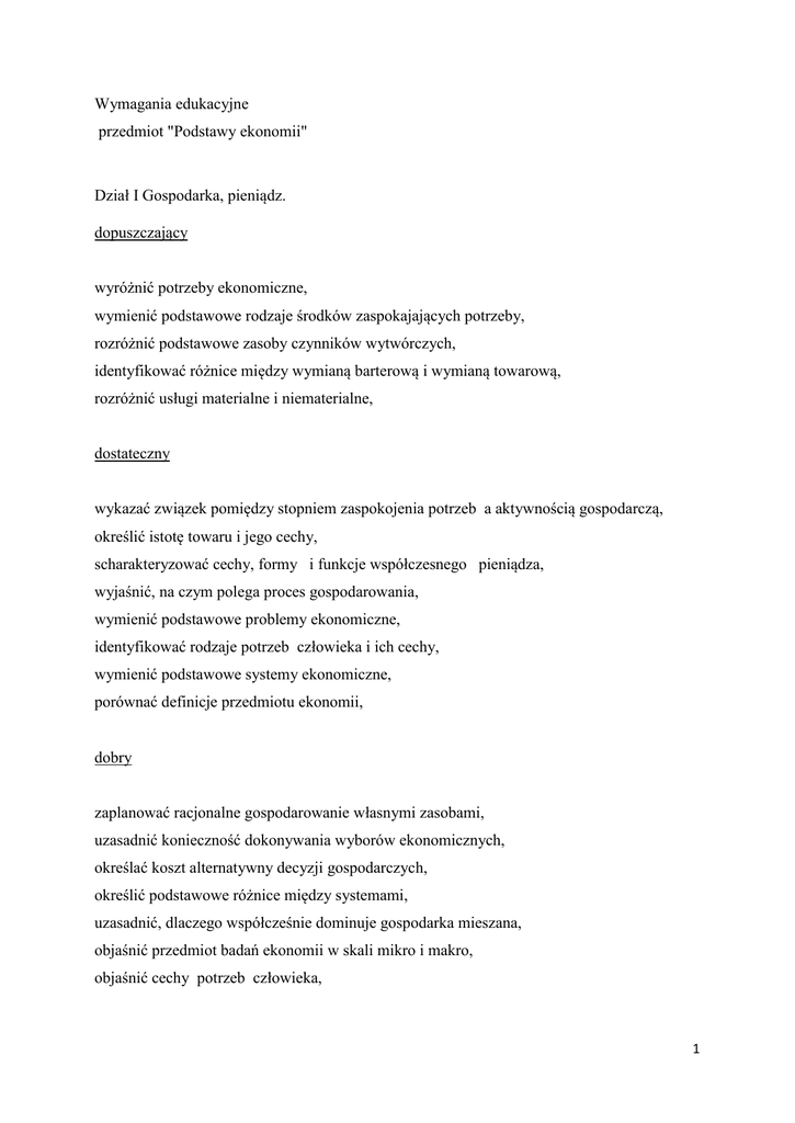 Wymagania edukacyjne przedmiot "Podstawy ekonomii" Dział I