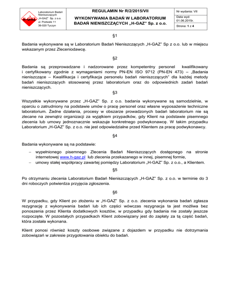 REGULAMIN Nr R/2/2015/VII WYKONYWANIA BADAŃ W - H-GAZ