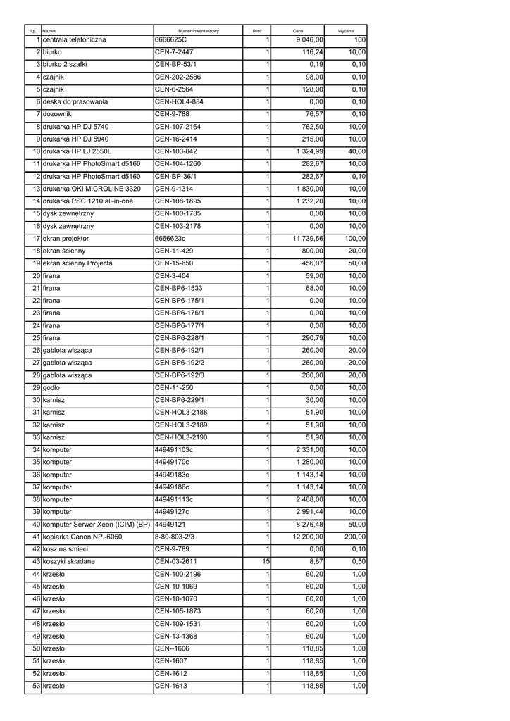 Lp. Nazwa Numer inwentarzowy Ilość Cena Wycena 1 centrala telefoniczna 6666625C 1 9 046,00 100 2 biurko CEN-7-2447 1 116,24 10,00 3 biurko 2 szafki CEN-BP-53/1 1 0,19 0,10 4 czajnik CEN-202-2586 1 98,00 0,10 5 czajnik CEN-6-2564 1 128,00 0,10 6 deska do prasowania CEN-HOL4-884 1 0,00 0,10 7 dozownik CEN-9-788 1 76,57 0,10 8 drukarka HP DJ 5740 CEN-107-2164 1 762,50 10,00 9 drukarka HP DJ 5940 CEN-16-2414 1 215,00 10,00 10 drukarka HP LJ 2550L CEN-103-842 1 1 324,99 40,00 11 drukarka HP PhotoSmart d5160 CEN-104-1260 1 282,67 10,00 12 drukarka HP PhotoSmart d5160 CEN-BP-36/1 1 282,67 0,10 13 drukarka OKI MICROLINE 3320 CEN-9-1314 1 1 830,00 10,00 14 drukarka PSC 1210 all-in-one CEN-108-1895 1 1 232,20 10,00 15 dysk zewnętrzny CEN-100-1785 1 0,00 10,00 16 dysk zewnętrzny CEN-103-2178 1 0,00 10,00 17 ekran projektor 6666623c 1 11 739,56 100,00 18 ekran ścienny CEN-11-429 1 800,00 20,00 19 ekran ścienny Projecta CEN-15-650 1 456,07 50,00 20 firana CEN-3-404 1 59,00 10,00 21 firana CEN-BP6-1533 1 68,00 10,00 22 firana CEN-BP6-175/1 1 0,00 10,00 23 firana CEN-BP6-176/1 1 0,00 10,00 24 firana CEN-BP6-177/1 1 0,00 10,00 25 firana CEN-BP6-228/1 1 290,79 10,00 26 gablota wisząca CEN-BP6-192/1 1 260,00 20,00 27 gablota wisząca CEN-BP6-192/2 1 260,00 20,00 28 gablota wisząca CEN-BP6-192/3 1 260,00 20,00 29 godło CEN-11-250 1 0,00 10,00 30 karnisz CEN-BP6-229/1 1 30,00 10,00 31 karnisz CEN-HOL3-2188 1 51,90 10,00 32 karnisz CEN-HOL3-2189 1 51,90 10,00 33 karnisz CEN-HOL3-2190 1 51,90 10,00 34 komputer 449491103c 1 2 331,00 10,00 35 komputer 44949170c 1 1 280,00 10,00 36 komputer 44949183c 1 1 143,14 10,00 37 komputer 44949186c 1 1 143,14 10,00 38 komputer 449491113c 1 2 468,00 10,00 39 komputer 44949127c 1 2 991,44 10,00 40 komputer Serwer Xeon (ICIM) (BP) 44949121 1 8 276,48 50,00 41 kopiarka Canon NP.-6050 1 12 200,00 200,00 8-80-803-2/3 42 kosz na smieci CEN-9-789 1 0,00 0,10 43 koszyki składane CEN-03-2611 15 8,87 0,50 44 krzesło CEN-100-2196 1 60,20 1,00 45 krzesło CEN-10-1069 1 60,20 1,00 46 krzesło CEN-10-1070 1 60,20 1,00 47 krzesło CEN-105-1873 1 60,20 1,00 48 krzesło CEN-109-1531 1 60,20 1,00 49 krzesło CEN-13-1368 1 60,20 1,00 50 krzesło CEN--1606 1 118,85 1,00 51 krzesło CEN-1607 1 118,85 1,00 52 krzesło CEN-1612 1 118,85 1,00 53 krzesło CEN-1613 1 118,85 1,00 54 krzesło CEN-1614 1 118,85 1,00 55 krzesło CEN-1615 1 118,85 1,00 56 krzesło CEN-1616 1 118,85 1,00 57 krzesło CEN-1617 1 118,85 1,00 58 krzesło CEN-1618 1 118,85 1,00 59 krzesło CEN-17-1339 1 118,85 1,00 60 krzesło CEN-17-1342 1 118,85 1,00 61 krzesło CEN-1815 1 60,20 1,00 62 krzesło CEN-1816 1 118,85 1,00 63 krzesło CEN-1820 1 118,85 1,00 64 krzesło CEN-1821 1 70,00 1,00 65 krzesło CEN-1822 1 70,00 1,00 66 krzesło CEN-207-89 1 60,20 1,00 67 krzesło CEN-9-426 1 150,00 10,00 68 krzesło CEN-HOL3-2191 1 60,20 1,00 69 krzesło CEN-HOL3-2192 1 60,20 1,00 70 krzesło CEN-4-895 1 200,00 10,00 71 krzesło CEN-5A-2268 1 200,00 10,00 72 krzesło obrotowe CEN-1-863 1 200,00 10,00 73 krzesło obrotowe CEN-107-1554 1 190,00 10,00 74 krzesło obrotowe CEN-7-2235 1 150,00 10,00 75 krzesło obrotowe CEN-BP-1515/1 1 180,00 10,00 76 krzesło obrotowe CEN-BP-234/1 1 180,00 10,00 77 krzesło obrotowe CEN-103-897 1 150,00 10,00 78 krzesło obrotowe CEN-106-1484 1 180,00 10,00 79 lampa oświetleniowa SVL 1100 Blaupunkt 80 licencja GOV 1Y GD CEN-200-1447 1 180,00 10,00 O1 1 3 700,00 0,00 81 magnetowid Philips CEN-15-655 1 696,73 20,00 82 maszyn do pisania Consul CEN-BP-1/1 1 0,25 0,10 83 maszyna do pisania Łucznik CEN-BP-4/1 1 12,00 0,10 84 mikrofon MEG-P-1 CEN-11-532 1 368,85 50,00 85 mikrofon MEG-P-1 CEN-11-533 1 368,85 50,00 86 mikrofon MEG-P-1 CEN-11-534 1 368,85 50,00 87 mikrofon MEG-P-1 CEN-11-535 1 368,85 50,00 88 nawigacja samochodowa CEN-GARAŻ2-1668 1 229,00 10,00 89 niszczarka OPUS VS CEN-BP-1486/1 1 326,01 10,00 90 notebook 44949171c 1 5 063,69 20,00 91 notebook 44949172c 1 5 063,69 20,00 92 obraz CEN-10-1788 1 0,00 0,10 93 obraz CEN-HOL3-1253 1 0,00 0,10 94 obraz CEN-HOL3-1254 1 0,00 0,10 95 popielnica CEN-02-615 1 0,00 10,00 96 półka pod drukarkę CEN-104-839 1 123,36 15,00 97 półka pod drukarkę CEN-104-840 1 123,36 15,00 98 prezenter bezprzewodowy CEN-101-2156 1 210,00 10,00 99 prezenter Logitech CEN-107-2537 1 250,00 10,00 100 regał CEN-10-2153 1 370,00 10,00 101 regał CEN-108-1592 1 120,40 10,00 102 regał CEN--1465 1 160,95 10,00 103 regał CEN--1749 1 95,00 10,00 104 regał CEN-7-266 1 238,95 10,00 105 stolik CEN--1755 1 0,00 10,00 106 stolik pod drukarkę CEN-104-258 1 198,57 10,00 107 stolik pod tv CEN-17-1746 1 198,57 10,00 108 stolik szkolny CEN-SZATNIA-1026 1 116,00 10,00 109 suszarka - podgrzewacz wody CEN-BP-1367/1 1 159,00 0,10 110 tablica CEN-13-1662 1 0,00 10,00 111 tablica CEN-13-243 1 0,00 10,00 112 tablica CEN-13-251 1 0,00 10,00 113 tablica CEN-13-966 1 0,00 10,00 114 telefon Panasonic CEN-4-1648 1 170,80 10,00 115 telefon Simens CEN-105-866 1 139,00 10,00 116 telewizor Bgko Pm 1121 CEN-6-372 1 579,00 10,00 117 telewizor Dawoo CEN--387 1 616,93 10,00 118 uchwyt CEN-17-2547 1 109,47 10,00 119 werticale CEN-BP6-212/1 1 228,14 20,00 120 werticale CEN-BP6-213/1 1 108,58 20,00 121 werticale CEN-BP6-214/1 1 204,96 20,00 122 werticale CEN-BP6-215/1 1 210,45 20,00 123 werticale CEN-BP6-216/1 1 187,88 20,00 124 werticale CEN-101-830 1 0,00 10,00 125 werticale CEN-103-1770 1 51,35 10,00 126 werticale CEN-1A-282 1 839,05 10,00 127 wideoprojektor 6666621c 1 17 266,29 100,00 128 wideoprojektor 6666629C 1 4 623,80 50,00 129 wieszak CEN-BP-1145/1 1 110,00 10,00 130 wykładzina - chodnik 1,5 CEN-BP6-1539 1 75,00 8,00 131 wykładzina - chodnik 2,95 CEN-BP6-1540 1 199,00 8,00 132 wykładzina - chodnik 4,15 CEN-BP6-230/1 1 119,84 8,00 133 wykładzina - chodnik 4,7 CEN-BP6-226/1 1 108,09 8,00 134 wykładzina /8 kawałków/ CEN-BP6-225/1 1 664,18 8,00 135 zasilacz UPS CEN-13-2245 1 1 340,00 20,00 136 zastawki do książek 200 szt. CEN-BP6-178/1 1 0,00 0,10 137 zegar ścienny CEN-KOTŁOWNIA-1754 1 0