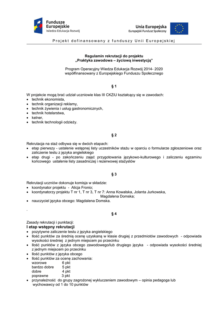 Projekt dofinansowany z funduszy Unii Europejskiej Regulamin rekrutacji do projektu „Praktyka zawodowa – życiową inwestycją” Program Operacyjny Wiedza Edukacja Rozwój 2014- 2020 współfinansowany z Europejskiego Funduszu Społecznego §1 W projekcie mogą brać udział uczniowie klas III CKZiU kształcący się w zawodach: technik ekonomista, technik organizacji reklamy, technik żywienia i usług gastronomicznych, technik hotelarstwa, kelner, technik technologii odzieży. §2 Rekrutacja na staż odbywa się w dwóch etapach: etap pierwszy - ustalenie wstępnej listy uczestników stażu w oparciu o formularze zgłoszeniowe oraz zaliczenie testu z języka angielskiego etap drugi - po zakończeniu zajęć przygotowania językowo-kulturowego i zaliczeniu egzaminu końcowego ustalenie listy zasadniczej i rezerwowej stażystów §3 Rekrutacji uczniów dokonuje komisja w składzie: koordynator projektu - Alicja Fronio; koordynatorzy projektu T nr 1, T nr 3, T nr 7: Anna Kowalska, Jolanta Jurkowska, Magdalena Domska; nauczyciel języka obcego: Magdalena Domska. . §4 Zasady rekrutacji i punktacji: I etap wstępny rekrutacji pozytywne zaliczenie testu z języka angielskiego Ilość punktów za średnią ocenę uzyskaną w klasie drugiej z przedmiotów zawodowych - odpowiada wysokości średniej z jednym miejscem po przecinku Ilość punktów z języka obcego zawodowego/lub drugiego języka - odpowiada wysokości średniej z jednym miejscem po przecinku Ilość punktów z języka obcego Ilość punktów za ocenę zachowania: wzorowe 6 pkt bardzo dobre 5 pkt dobre 4 pkt poprawne 3 pkt przynależność do grupy zagrożonej wykluczeniem zawodowym – opinia pedagoga lub wychowawcy od 1 do 10 punktów II etap rekrutacji - zakwalifikowani uczestnicy stażu W przypadku równorzędnych wyników będzie przeprowadzony test kompetencji zawodowych. Na staż zostaną zakwalifikowani uczniowie , którzy uzyskają po dwóch etapach najwyższą ilość punktów. §5 1. Na podstawie sumy uzyskanych punktów Komisja sporządzi dwie listy uczniów, którzy zostaną objęci programem praktyk zagranicznych: listę główną i listę rezerwową. W przypadku zdarzenia losowego lub niezdyscyplinowanego zachowania się ucznia przed wyjazdem w szkole, na lekcjach, nieobecności na kursach, spotkaniach informacyjnych przez ucznia umieszczonego na liście głównej, zostanie on wykluczony z wyjazdu na zagraniczny staż, a prawo do tego wyjazdu uzyska osoba z listy rezerwowej z zachowaniem ustalonej na niej kolejności. §6 Kandydaci zobowiązani są: zapoznania się z regulaminem stażu, obowiązkowego udziału w spotkaniach z koordynatorem projektu i opiekunem stażu, do aktywnego udziału w przygotowaniu językowo-kulturowym, prowadzenia tablicy informacyjnej związanej z tematyką projektu, wypełniania wszystkich obowiązków uczestnika stażu, wykonywanie zadań powierzanych przez koordynatora stażu i opiekuna stażu. Opracowanie: Komisja rekrutacyjna