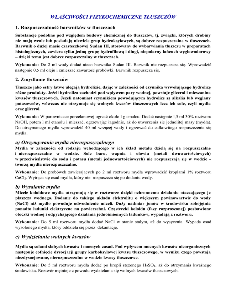 WŁAŚCIWOŚCI FIZYKOCHEMICZNE TŁUSZCZÓW 1. Rozpuszczalność barwników w tłuszczach Substancje podobne pod względem budowy chemicznej do tłuszczów, tj. związki, których drobiny nie mają wcale lub posiadają niewiele grup hydroksylowych, są dobrze rozpuszczalne w tłuszczach. Barwnik o dużej masie cząsteczkowej Sudan III, stosowany do wybarwiania tłuszczu w preparatach histologicznych, zawiera tylko jedną grupę hydrofilową i długi, niepolarny łańcuch węglowodorowy – dzięki temu jest dobrze rozpuszczalny w tłuszczach. Wykonanie: Do 2 ml wody dodać nieco barwnika Sudan III. Barwnik nie rozpuszcza się. Wprowadzić następnie 0,5 ml oleju i zmieszać zawartość probówki. Barwnik rozpuszcza się. 2. Zmydlanie tłuszczów Tłuszcze jako estry łatwo ulegają hydrolizie, dając w zależności od czynnika wywołującego hydrolizę różne produkty. Jeżeli hydroliza zachodzi pod wpływem pary wodnej, powstaje glicerol i mieszanina kwasów tłuszczowych. Jeżeli natomiast czynnikiem powodującym hydrolizę są alkalia lub węglany potasowców, wówczas nie otrzymuje się wolnych kwasów tłuszczowych lecz ich sole, czyli mydła oraz glicerol. Wykonanie: W parowniczce porcelanowej ogrzać około l g smalcu. Dodać następnie l,5 ml 30% roztworu NaOH, potem l ml etanolu i mieszać, ogrzewając łagodnie, aż do utworzenia się jednolitej masy (mydła). Do otrzymanego mydła wprowadzić 40 ml wrzącej wody i ogrzewać do całkowitego rozpuszczenia się mydła. a) Otrzymywanie mydła nierozpuszczalnego Mydła w zależności od rodzaju wchodzącego w ich skład metalu dzielą się na rozpuszczalne i nierozpuszczalne w wodzie. Sole baru, wapnia i ołowiu (metali dwuwartościowych) w przeciwieństwie do sodu i potasu (metali jednowartościowych) nie rozpuszczają się w wodzie tworzą mydła nierozpuszczalne. Wykonanie: Do probówek zawierających po 2 ml roztworu mydła wprowadzić kroplami 1% roztworu CaCl2. Wytrąca się osad mydła, który nie rozpuszcza się po dodaniu wody. b) Wysalanie mydła Micele koloidowe mydła utrzymują się w roztworze dzięki ochronnemu działaniu otaczającego je płaszcza wodnego. Dodanie do takiego układu elektrolitu o większym powinowactwie do wody (NaCl) niż mydło powoduje odwodnienie miceli. Duży nadmiar jonów w środowisku zobojętnia ponadto ładunki elektryczne na powierzchni. Cząsteczki koloidu (fazy rozproszonej) pozbawione otoczki wodnej i odpychającego działania jednoimiennych ładunków, wypadają z roztworu. Wykonanie: Do 5 ml roztworu mydła dodać NaCl w stanie stałym, aż do wysycenia. Wypada osad wysolonego mydła, który oddziela się przez dekantację. c) Wydzielanie wolnych kwasów Mydła są solami słabych kwasów i mocnych zasad. Pod wpływem mocnych kwasów nieorganicznych następuje cofnięcie dysocjacji grupy karboksylowej kwasu tłuszczowego, w wyniku czego powstają niezdysocjowane, nierozpuszczalne w wodzie kwasy tłuszczowe. Wykonanie: Do 5 ml roztworu mydła dodać po kropli stężonego H2SO4, aż do otrzymania kwaśnego środowiska. Roztwór mętnieje z powodu wydzielania się wolnych kwasów tłuszczowych. 3. Odróżnianie kwasów tłuszczowych od tłuszczów obojętnych Wykonanie: a) Do roztworu z ćw. 2c dodać 3 ml eteru. Następnie do probówki zawierającej l ml 0,002M NaOH, zabarwiony fenoloftaleiną na różowo, dodać kroplami eterowy roztwór kwasów tłuszczowych. Zawartość probówki odbarwia się. b) Ogrzewać kwasy tłuszczowe z krystalicznym KHSO4. Nie wydziela się charakterystyczny zapach akroleiny, powstający z tłuszczów w przypadku ogrzewania z KHSO 4. 4. Wykazanie obecności kwasów nienasyconych w tłuszczach Pod wpływem substancji utleniających, np. KMnO4 dochodzi do rozerwania łańcucha węglowego w miejscu podwójnych wiązań, z równoczesnym utlenieniem atomów węgla do grup karboksylowych. Analizując produkty rozpadu, można określić położenie wiązania podwójnego w cząsteczce kwasu. Równocześnie z utlenieniem kwasu nienasyconego zachodzi redukcja utleniacza. W środowisku obojętnym mangan redukuje się ze stopnia utlenienia +7 na +4. Wykonanie: Do probówki zawierającej 2 krople oleju dodać 5 ml IM Na2CO3. Zawartość probówki lekko ogrzać i wytrząsając dodawać po kropli 0,01M roztworu KMnO4, aż do trwającego około 2 minuty różowego zabarwienia. 5. Wykrywanie tłuszczów za pomocą reakcji akroleinowej Tłuszcze zawierające glicerol, ogrzewane z KHSO4 dają dodatnią reakcję akroleinową. Podczas ogrzewania glicerolu w obecności krystalicznego KHSO4 dochodzi do odciągnięcia dwóch cząsteczek wody z glicerolu. Powstaje aldehyd nienasycony tzw. akroleina, której pary mają ostry duszący zapach przypominający zapach formaliny. Akroleinę można wykryć również reakcją lustra srebrnego, gdyż jako aldehyd ma ona właściwości redukujące. Wykonanie: Do kropli oleju jadalnego w suchej probówce dodać szczyptę KHSO4. Zawartość probówki ogrzewać przez kilka minut. Wydziela się przykry, drażniący zapach akroleiny. 6. Rozpuszczalność tłuszczów Tłuszcze rozpuszczają się dobrze w niepolarnych rozpuszczalnikach organicznych, takich jak benzen, chloroform, aceton, toluen i eter, a w mniejszym stopniu także w etanolu i metanolu. Wykonanie: Do probówek zawierających po 1 ml rozpuszczalników organicznych (etanol, chloroform, aceton) dodać odrobinę tłuszczu. Zaobserwować różnicę w stopniu rozpuszczalności tłuszczu w poszczególnych rozpuszczalnikach organicznych. 7. Tworzenie emulsji tłuszczu w obecności emulgatora Tłuszcz nie rozpuszczają się w wodzie. W przypadku silnego wytrząsania z wodą rozbija się na drobne kropelki i po chwili wypływa ponownie na powierzchnię wody. Jeżeli do wody doda się emulgatora (środka zmniejszającego napięcie powierzchniowe na granicy faz tj. siłę, która przeciwstawia się zwiększeniu powierzchni granicznej między wodą i tłuszczem), po wytrząsaniu małe kropelki tł