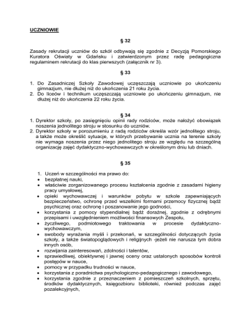 UCZNIOWIE § 32 Zasady rekrutacji uczniów do szkół odbywają się zgodnie z Decyzją Pomorskiego Kuratora Oświaty w Gdańsku i zatwierdzonym przez radę pedagogiczna regulaminem rekrutacji do klas pierwszych (załącznik nr 3). § 33 1. Do Zasadniczej Szkoły Zawodowej uczęszczają uczniowie po ukończeniu gimnazjum, nie dłużej niż do ukończenia 21 roku życia. 2. Do liceów i technikum uczęszczają uczniowie po ukończeniu gimnazjum, nie dłużej niż do ukończenia 22 roku życia. § 34 1. Dyrektor szkoły, po zasięgnięciu opinii rady rodziców, może nałożyć obowiązek noszenia jednolitego stroju w stosunku do uczniów. 2. Dyrektor szkoły w porozumieniu z radą rodziców określa wzór jednolitego stroju, a także może określić sytuacje, w których przebywanie ucznia na terenie szkoły nie wymaga noszenia przez niego jednolitego stroju ze względu na szczególną organizację zajęć dydaktyczno-wychowawczych w określonym dniu lub dniach. § 35 1. Uczeń w szczególności ma prawo do: bezpłatnej nauki, właściwie zorganizowanego procesu kształcenia zgodnie z zasadami higieny pracy umysłowej, opieki wychowawczej i warunków pobytu w szkole zapewniających bezpieczeństwo, ochronę przed wszelkimi formami przemocy fizycznej bądź psychicznej oraz ochronę i poszanowanie jego godności, korzystania z pomocy stypendialnej bądź doraźnej, zgodnie z odrębnymi przepisami i uwzględnieniem możliwości finansowych Zespołu, życzliwego, podmiotowego traktowania w procesie dydaktycznowychowawczym, swobody wyrażania myśli i przekonań, w szczególności dotyczących życia szkoły, a także światopoglądowych i religijnych -jeżeli nie narusza tym dobra innych osób, rozwijania zainteresowań, zdolności i talentów, sprawiedliwej, obiektywnej i jawnej oceny oraz ustalonych sposobów kontroli postępów w nauce, pomocy w przypadku trudności w nauce, korzystania z poradnictwa psychologiczno-pedagogicznego i zawodowego, korzystania zgodnie z przeznaczeniem z pomieszczeń szkolnych, sprzętu, środków dydaktycznych, księgozbioru biblioteki, również podczas zajęć pozalekcyjnych, wpływania na życie szkoły poprzez działalność samorządową oraz zrzeszanie się w organizacjach działających w szkole. 1.a. Uczennica w ciąży ma prawo do: nauczania indywidualnego w oparciu o opinię Poradni Psychologicznopedagogicznej, 6-miesięcznego urlopu na podstawie zwolnienia lekarskiego, W przypadku uczennic niepełnoletnich dyrektor może żądać od rodziców (opiekunów prawnych) oświadczenia o wzięciu przez nich odpowiedzialności za bezpieczeństwo uczennicy podczas pobytu w szkole oraz w drodze do i ze szkoły. 2. Uczeń (słuchacz) jest w szczególności zobowiązany do: systematycznego i aktywnego uczestniczenia w zajęciach lekcyjnych i w życiu szkoły, przygotowywania się do zajęć edukacyjnych ujętych w tygodniowym planie lekcji, do zajęć edukacyjnych w zastępstwie ujętych w planie zastępstw co najmniej dzień wcześniej, do zajęć pozalekcyjnych – jeżeli jest taka potrzeba oraz do odrabiania zadań domowych w terminie wyznaczonym przez nauczyciela prowadzącego dane zajęcia edukacyjne, właściwego zachowywania się na zajęciach edukacyjnych i przerwach, tak by nie zakłócać ich przebiegu, przestrzegania zasad kultury współżycia w odniesieniu do kolegów, nauczycieli, pracowników szkoły i innych osób, dbania o zdrowie i życie własne i innych, dbałości o mienie, wspólne dobro, ład i porządek w szkole, systematycznego usprawiedliwiania nieobecności najpóźniej w terminie jednego tygodnia po powrocie do szkoły; nieobecności mogą być usprawiedliwiane na podstawie zaświadczenia lekarskiego, oświadczenia rodziców (opiekunów prawnych lub wychowawców internatu), oświadczenia pełnoletniego ucznia - jednak nie częściej niż trzy razy w semestrze. W przypadku nieobecności na wszelkiego typu egzaminach podstawą usprawiedliwienia jest zwolnienie lekarskie. noszenia odpowiedniego i kompletnego stroju oraz dbania o schludny wygląd. Nie dopuszcza się w szczególności: a) nie przestrzegania zasad higieny osobistej, b) noszenia spódnic, sukienek i spodni krótszych niż do połowy uda, c) noszenia bluzek, koszulek, swetrów krótszych niż do bioder, z odkrytymi ramionami, z dużymi dekoltami, d) noszenia odzieży wykonanej z przezroczystych tkanin, e) stosowania wyzywającego makijażu, f) ekstrawaganckich fryzur, g) widocznego tatuażu i percingu noszenia stroju galowego na uroczystościach szkolnych, egzaminach, imprezach i spotkaniach, na których reprezentuje szkołę: a) uczennica – ciemny kostium lub ciemna spódnica (spodnie) i biała bluzka, b) uczeń – ciemny garnitur lub ciemne spodnie i biała koszula przestrzegania zakazu korzystania w czasie zajęć edukacyjnych z telefonu komórkowego oraz innych urządzeń elektronicznych, multimedialnych i telekomunikacyjnych, a) w przypadku naruszenia tego zakazu wyłączony telefon lub urządzenie zostaje przekazane w depozyt do sekretariatu szkoły i może być oddane uczniowi po zakończeniu zajęć dydaktycznych w danym dniu. W przypadku powtórzenia niniejszego przewinienia dyrektor może zażądać zgłoszenia się rodziców lub opiekunów prawnych do odbioru urządzenia. b) zabrania się nagrywania i robienia zdjęć innym uczniom i pracownikom szkoły bez ich zgody, przestrzegania zakazu palenia tytoniu, picia alkoholu i zażywania narkotyków ponoszenia odpowiedzialności materialnej za zniszczenie mienia Zespołu § 36 1. W przypadku naruszenia praw ucznia (słuchacza) zawartych w § 35 ust. 1 uczeń (słuchacz), jego rodzice lub opiekun prawny może złożyć skargę do dyrektora Zespołu. 2. Skarga w formie pisemnej powinna wpłynąć w terminie 7 dni od chwili naruszenia praw ucznia. 3. Dyrektor powołuje zespół złożony z dyrektora lub wicedyrektora i dwóch nauczycieli. Do zespołu nie może być powołana osoba, która jest posądzona o naruszenie 