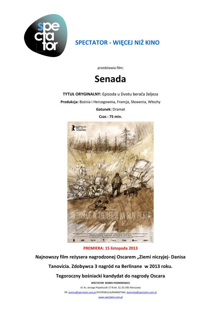 SPECTATOR - WIĘCEJ NIŻ KINO przedstawia film: Senada TYTUŁ ORYGINALNY: Epizoda u životu berača željeza Produkcja: Bośnia i Hercegowina, Francja, Słowenia, Włochy Gatunek: Dramat Czas : 75 min. PREMIERA: 15 listopada 2013 Najnowszy film reżysera nagrodzonej Oscarem „Ziemi niczyjej- Danisa Tanovicia. Zdobywca 3 nagród na Berlinane w 2013 roku. Tegoroczny bośniacki kandydat do nagrody Oscara SPECTATOR MAREK POZNEROWICZ Ul. Ks. Jerzego Popiełuszki 17 B lok. 22, 01-595 Warszawa PR: [email protected] DYSTRYBUCJA/MARKETING: [email protected] www.spectator.com.pl TWÓRCY Scenariusz i reżyseria: Danis Tanovič Producent: Amra Bakšič Čamo, Čedomir Kolar Montaż: Timur Makarevič Zdjęcia: Erol Zubcevic OBSADA Senada: Senada Alimanovič Nazif: Nazif Mujič Sandra : Sandra Mujič Šemsa: Šemsa Mujič Festiwale: 2013 - Berlin International Film Festival: Nagroda : Jury Grand Prix Srebrny Niedźwiedź: Danis Tanovic 2013 - Berlin International Film Festival: Nagroda: Srebrny Niedźwiedź dla Najleszego Aktora: Nazif Mujic 2013 - Berlin International Film Festival: Nagroda Jury Ekumenicznego: Danis Tanovic 2013 - Berlin International Film Festival: Nominacja: Złoty Niedźwiedź: Danis Tanovic O filmie: Nazif, który chcąc pomóc swojej rodzinie, zajmuje się zbieraniem złomu, z trudem wiąże koniec z końcem. Dni upływają mu za poszukiwaniu żelastwa, w tym czasie jego partnerka Senada zajmuje się domem i dwiema małymi córeczkami. Niedługo urodzi trzecie dziecko. Po powrocie do domu po pracowitym dniu Nazif znajduje dziewczynę chorą, leżącą w łóżku. Następnego dnia pożycza samochód i zawozi ją do najbliższego szpitala. Okazuje się, że SPECTATOR MAREK POZNEROWICZ Ul. Ks. Jerzego Popiełuszki 17 B lok. 22, 01-595 Warszawa PR: [email protected] DYSTRYBUCJA/MARKETING: [email protected] www.spectator.com.pl dziecko, które Senada nosi w sobie, nie żyje. W jej brzuchu znajduje się pięciomiesięczny martwy płód. Sytuacja jest krytyczna – kobieta musi natychmiast zostać przetransportowana do odległego szpitala. Senada nie ma jednak dokumentu potwierdzającego ubezpieczenie i szpital żąda od niej zapłaty w wysokości 980 bośniackich marek. Dla zbieracza złomu to prawdziwa fortuna. Pomimo błagań Nazifa szpital odmawia przeprowadzenia koniecznej operacji. Bohaterowie wracają więc do swojego miejsca zamieszkania w centralnej Bośni i Hercegowinie. Przez następnych dziesięć dni Nazif będzie robił wszystko, co w jego mocy, żeby ocalić życie Senady. Będzie zbierał złom, ale też szukał pomocy w instytucjach państwowych... W tym czasie doświadczą na własnej skórze, jak bezduszne jest współczesne społeczeństwo. RECENZJE 1. „Tanović uporczywie podąża za bohaterami swojego filmu, zawsze ma ze sobą podręczną kamerę. Nie oszczędza widzom ani drobnych irytacji, ani nieodwracalnych tragedii. Jego portret biednych ludzi, którzy nie potrafią przeciwstawić się rzeczywistości, jest smutny, ale prawdziwy. Senada i Nazif nawet nie myślą o proteście, oni po prostu żyją z dnia na dzień. Naturalistyczne, zimowe zdjęcia uświadamiają, że oboje zaakceptowali swoją nędzę, uznali ją na coś normalnego. Tymczasem społeczeństwo woli patrzyć w inną stronę.” (http://www.screendaily.com/reviews/the-latest/an-episode-in-the-life-of-an-ironpicker/5052007.article) SPECTATOR MAREK POZNEROWICZ Ul. Ks. Jerzego Popiełuszki 17 B lok. 22, 01-595 Warszawa PR: [email protected] DYSTRYBUCJA/MARKETING: [email protected] www.spectator.com.pl 2. „Film nakręcono „z ręki”, dzięki czemu osiągnięto efekt intymności, który dobrze wyraża surowość założonej estetyki i współgra z szorstkością tematu. Wydarzenia toczące się w szpitalu zostały umieszczone w ramie, którą tworzy codzienność Nazifa: poszukiwanie złomu na zaśnieżonych wysypiskach i przydrożnych ugorach. Jego życie jest wypełnione desperacją, reżyser podkreśla też to, że bohater nie ma poczucia bezpieczeństwa. W kluczowym momencie stary samochód Nazifa i Senady odmawia posłuszeństwa, a elektrownia pozbawia ich dostawy prądu. Na zewnątrz panują wówczas mrozy. Na ekranie oglądamy niemal bośniacką wersją filmu Do szpiku kości.” (http://www.hollywoodreporter.com/review/an-episode-life-an-iron-421159) 3. „Film Tanovića jest wyrazem jego wściekłości na to, w jaki sposób sytuacja jego kraju wpływa na przeciętnego człowieka. Naturalizm opowieści sprawia, że możemy niemal dotknąć tego, co widzimy na ekranie. Jego opowieść nie jest jednak społecznie zaangażowana, bliższy jest mu humanitaryzm, pokazanie, jak wiele człowiek jest w stanie zrobić dla swojej rodziny. Sprawna reżyseria sprawiła, że ta uniwersalna historia jest na wskroś prawdziwa, każdy z widzów mógłby być przecież Nazifem. Tanović w swoim filmie eksploruje osiągnięcia tzw. Jugosławiańskiej Czarnej Fali, w ramach której filmy tworzyli Želimir Žilnik, Dušan Makavejev i Živojin Pavlović – ich dzieła zdobywały nagrody na festiwalu w Berlinie. Iron picker, podobnie jak tamte filmy, używa pewnych środków do ukazania palących problemów społecznych. Tanović nie jest jedynie naśladowcą dawnych mistrzów, on po prostu ze świadomością do nich nawiązuje. Senada to najlepszy z dotychczasowych filmów Tanovića – pozostawia on w cieniu zarówno nagrodzoną Oscarem Ziemię niczyją, jak i Piekło, nakręcone na podstawie scenariusza Kieślowskiego i Piesiewicza.” (http://www.cineuropa.org/nw.aspx? t=newsdetail&l=en&did=233276) SPECTATOR MAREK POZNEROWICZ Ul. Ks. Jerzego Popiełuszki 17 B lok. 22, 01-595 Warszawa PR: [email protected] DYSTRYBUCJA/MARKETING: [email protected] www.spectator.com.pl KOMENTARZ DANISA TANOVIČA WYKLUCZENI ZE SPOŁECZEŃSTWA Film rekonstruuje wydarzenia, które naprawdę się zdarzyły. Moim celem było pokazanie, z jaką dyskryminacją spotykają się mniejszości, w szczególności Cyganie, w Bośni i Her