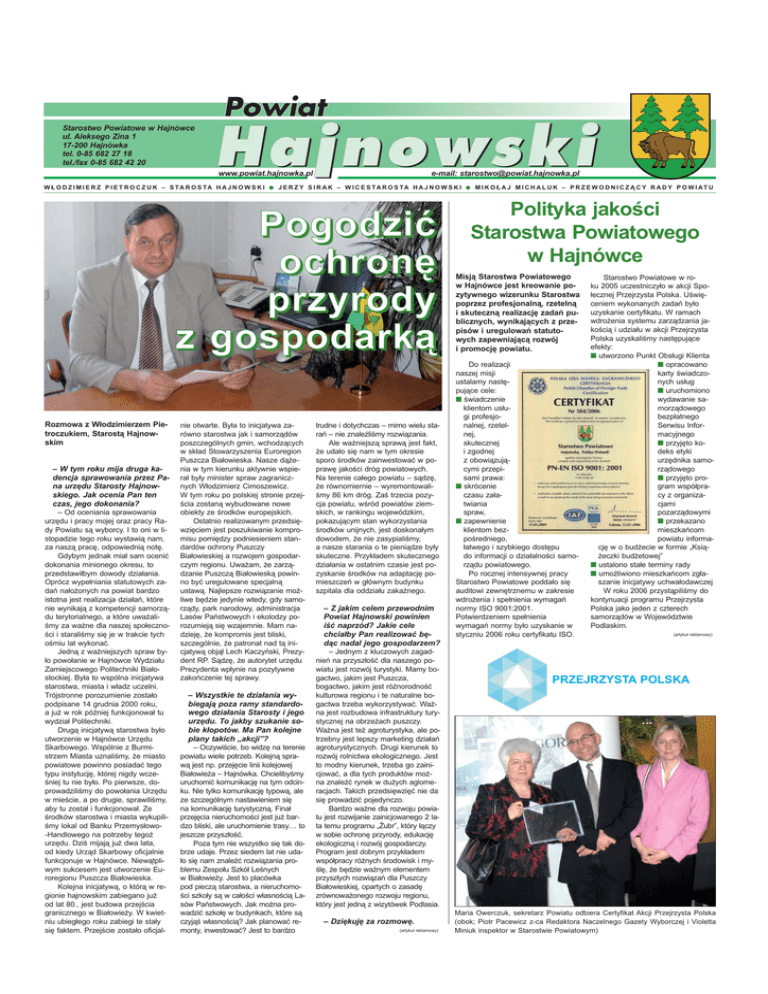 Starostwo Powiatowe w Hajnówce ul. Aleksego Zina 1 17-200 Hajnówka tel. 0-85 682 27 18 tel./fax 0-85 682 42 20 www.powiat.hajnowka.pl e-mail: [email protected] W Ł O D Z I M I E R Z P I E T R O C Z U K – S TA R O S TA H A J N O W S K I l J E R Z Y S I R A K – W I C E S TA R O S TA H A J N O W S K I l M I K O Ł A J M I C H A L U K – P R Z E W O D N I C Z Ą C Y R A D Y P O W I AT U Pogodzić ochronę przyrody z gospodarką Rozmowa z Włodzimierzem Pietroczukiem, Starostą Hajnowskim – W tym roku mija druga kadencja sprawowania przez Pana urzędu Starosty Hajnowskiego. Jak ocenia Pan ten czas, jego dokonania? – Od oceniania sprawowania urzędu i pracy mojej oraz pracy Rady Powiatu są wyborcy. I to oni w listopadzie tego roku wystawią nam, za naszą pracę, odpowiednią notę. Gdybym jednak miał sam ocenić dokonania minionego okresu, to przedstawiłbym dowody działania. Oprócz wypełniania statutowych zadań nałożonych na powiat bardzo istotna jest realizacja działań, które nie wynikają z kompetencji samorządu terytorialnego, a które uważaliśmy za ważne dla naszej społeczności i staraliśmy się je w trakcie tych ośmiu lat wykonać. Jedną z ważniejszych spraw było powołanie w Hajnówce Wydziału Zamiejscowego Politechniki Białostockiej. Była to wspólna inicjatywa starostwa, miasta i władz uczelni. Trójstronne porozumienie zostało podpisane 14 grudnia 2000 roku, a już w rok później funkcjonował tu wydział Politechniki. Drugą inicjatywą starostwa było utworzenie w Hajnówce Urzędu Skarbowego. Wspólnie z Burmistrzem Miasta uznaliśmy, że miasto powiatowe powinno posiadać tego typu instytucję, której nigdy wcześniej tu nie było. Po pierwsze, doprowadziliśmy do powołania Urzędu w mieście, a po drugie, sprawiliśmy, aby tu został i funkcjonował. Ze środków starostwa i miasta wykupiliśmy lokal od Banku Przemysłowo-Handlowego na potrzeby tegoż urzędu. Dziś mijają już dwa lata, od kiedy Urząd Skarbowy oficjalnie funkcjonuje w Hajnówce. Niewątpliwym sukcesem jest utworzenie Euroregionu Puszcza Białowieska. Kolejna inicjatywą, o którą w regionie hajnowskim zabiegano już od lat 80., jest budowa przejścia granicznego w Białowieży. W kwietniu ubiegłego roku zabiegi te stały się faktem. Przejście zostało oficjal- nie otwarte. Była to inicjatywa zarówno starostwa jak i samorządów poszczególnych gmin, wchodzących w skład Stowarzyszenia Euroregion Puszcza Białowieska. Nasze dążenia w tym kierunku aktywnie wspierał były minister spraw zagranicznych Włodzimierz Cimoszewicz. W tym roku po polskiej stronie przejścia zostaną wybudowane nowe obiekty ze środków europejskich. Ostatnio realizowanym przedsięwzięciem jest poszukiwanie kompromisu pomiędzy podniesieniem standardów ochrony Puszczy Białowieskiej a rozwojem gospodarczym regionu. Uważam, że zarządzanie Puszczą Białowieską powinno być uregulowane specjalną ustawą. Najlepsze rozwiązanie możliwe będzie jedynie wtedy, gdy samorządy, park narodowy, administracja Lasów Państwowych i ekolodzy porozumieją się wzajemnie. Mam nadzieję, że kompromis jest bliski, szczególnie, że patronat nad tą inicjatywą objął Lech Kaczyński, Prezydent RP. Sądzę, że autorytet urzędu Prezydenta wpłynie na pozytywne zakończenie tej sprawy. – Wszystkie te działania wybiegają poza ramy standardowego działania Starosty i jego urzędu. To jakby szukanie sobie kłopotów. Ma Pan kolejne plany takich „akcji”? – Oczywiście, bo widzę na terenie powiatu wiele potrzeb. Kolejną sprawą jest np. przejęcie linii kolejowej Białowieża – Hajnówka. Chcielibyśmy uruchomić komunikację na tym odcinku. Nie tylko komunikację typową, ale ze szczególnym nastawieniem się na komunikację turystyczną. Finał przejęcia nieruchomości jest już bardzo bliski, ale uruchomienie trasy… to jeszcze przyszłość. Poza tym nie wszystko się tak dobrze udaje. Przez siedem lat nie udało się nam znaleźć rozwiązania problemu Zespołu Szkół Leśnych w Białowieży. Jest to placówka pod pieczą starostwa, a nieruchomości szkoły są w całości własnością Lasów Państwowych. Jak można prowadzić szkołę w budynkach, które są czyjąś własnością? Jak planować remonty, inwestować? Jest to bardzo trudne i dotychczas – mimo wielu starań – nie znaleźliśmy rozwiązania. Ale ważniejszą sprawą jest fakt, że udało się nam w tym okresie sporo środków zainwestować w poprawę jakości dróg powiatowych. Na terenie całego powiatu – sądzę, że równomiernie – wyremontowaliśmy 86 km dróg. Zaś trzecia pozycja powiatu, wśród powiatów ziemskich, w rankingu wojewódzkim, pokazującym stan wykorzystania środków unijnych, jest doskonałym dowodem, że nie zasypialiśmy, a nasze starania o te pieniądze były skuteczne. Przykładem skutecznego działania w ostatnim czasie jest pozyskanie środków na adaptację pomieszczeń w głównym budynku szpitala dla oddziału zakaźnego. – Z jakim celem przewodnim Powiat Hajnowski powinien iść naprzód? Jakie cele chciałby Pan realizować będąc nadal jego gospodarzem? – Jednym z kluczowych zagadnień na przyszłość dla naszego powiatu jest rozwój turystyki. Mamy bogactwo, jakim jest Puszcza, bogactwo, jakim jest różnorodność kulturowa regionu i te naturalne bogactwa trzeba wykorzystywać. Ważna jest rozbudowa infrastruktury turystycznej na obrzeżach puszczy. Ważna jest też agroturystyka, ale potrzebny jest lepszy marketing działań agroturystycznych. Drugi kierunek to rozwój rolnictwa ekologicznego. Jest to modny kierunek, trzeba go zainicjować, a dla tych produktów można znaleźć rynek w dużych aglomeracjach. Takich przedsięwzięć nie da się prowadzić pojedynczo. Bardzo ważne dla rozwoju powiatu jest rozwijanie zainicjowanego 2 lata temu programu „Żubr”, który łączy w sobie ochronę przyrody, edukację ekologiczną i rozwój gospodarczy. Progra