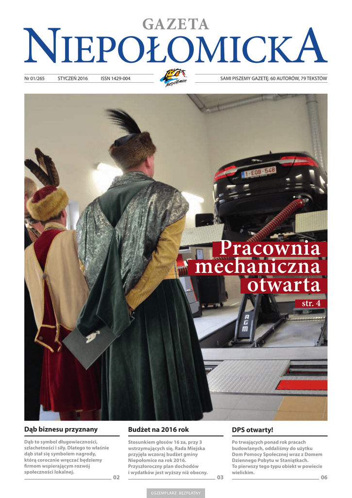 Nr 01/265 STYCZEŃ 2016 ISSN 1429-004 SAMI PISZEMY GAZETĘ: 60 AUTORÓW, 79 TEKSTÓW Pracownia mechaniczna otwarta str. 4 Dąb biznesu przyznany Budżet na 2016 rok DPS otwarty! Dąb to symbol długowieczności, szlachetności i siły. Dlatego to właśnie dąb stał się symbolem nagrody, którą corocznie wręczać będziemy firmom wspierającym rozwój społeczności lokalnej. Stosunkiem głosów 16 za, przy 3 wstrzymujących się, Rada Miejska przyjęła wczoraj budżet gminy Niepołomice na rok 2016. Przyszłoroczny plan dochodów i wydatków jest wyższy niż obecny. Po trwających ponad rok pracach budowlanych, oddaliśmy do użytku Dom Pomocy Społecznej wraz z Domem Dziennego Pobytu w Staniątkach. To pierwszy tego typu obiekt w powiecie wielickim. 02 03 06 Na początek W NUMERZE: Tematy miesiąca 2 3 4 4 Dąb biznesu przyznany Budżet na 2016 rok Pracownia mechaniczna otwarta Nowa szkoła TWÓJ URZĄD 5 5 5 6 6 7 7 7 Niepołomiczanie zadowoleni z jakości życia Remonty drogowe w gminie Kozie Górki - pomnik wyremontowany DPS otwarty! Mikołaj odwiedził Niepołomice Zmiana na stanowisku dyrektora Jeżdżę z głową Książki naszych marzeń Gospodarka odpadami 8 Wywóz odpadów Ekologia 12 Innowacyjny projekt potrwa dłużej Bogaty w wydarzenia Styczniowy numer już tradycyjnie wychodzi z lekkim poślizgiem, zaczynamy bowiem od wprowadzania zmian graficznych. Nie będą one w tym roku zbyt duże, jednak istotne jest, także w przypadku gazety, by wciąż się rozwijać. Ale grafika to tylko dodatek do zawartości, a ta jak zwykle bogata i ciekawa, bo i na przełomie roku działo się sporo. Otwarto nowe obiekty, które będą służyć naszej społeczności: Dom Pomocy Społecznej w Staniątkach i pracownię kształcenia zawodowego w branży mechanicznej Centrum Kształcenia Zawodowego i Ustawicznego w Niepołomicach. Radni Miejscy przyjęli budżet na 2016 rok. Burmistrz podpisał umowę na budowę nowej szkoły podstawowej. A mieszkańcy i wolontariusze zaangażowali się po raz kolejny w Szlachetną Paczkę, niosąc i w tym roku mądrą pomoc. Mam nadzieję, że cały rok będzie równie pełny ciekawych i pozytywnych wydarzeń jak ten styczniowy numer Gazety Niepołomickiej. Życzę Państwu dobrego 2016 roku i, oczywiście, udanej lektury. Joanna Kocot redaktor naczelna Urząd skarbowy 13 Przedsiębiorco, nie ponoś dodatkowych kosztów! 13 Zmiana rachunków bankowych 13 Zmiana własciwości miejscowej vat Wolontariat 14 Szlachetna Paczka łączy już po raz piąty 15 Całoroczni Mikołaje 15 Wigilia dla potrzebujących Z parafii 16 Działo się… 17 Kolędnicy misyjni Edukacja 18 18 19 19 19 19 19 20 20 20 20 20 20 21 22 Tydzień przedsiębiorczości Młodzież w Woodwardzie Mikołajki w bocheńskiej kopalni Gość z Finlandii Mikołajkowy zawrót głowy Adwentowe tradycje Mikołajkowe prezenty od MANa 10 Barbórka na 10 rocznicę Kolejne laury klasy 6b Królowa Śniegu z Eko-Parku Wieczór Poezji Dziecięcej Dzień Patrona Szkoły Szkolny turniej pięknego czytania O religii w szkole Czas wyboru szkół Astronomia 24 Spojrzenie w niebo A.D. 2016 25 Spojrzenie w styczniowe niebo 26 Moje obserwacje spektroskopowe 31 Stoły świąteczne 2015 32 O panu Dulskim 32 Podłęże podwójnie wyróżnione Zdrowie i uroda 33 Bóle głowy u dzieci 34 Projekt nowa ja - wywracamy wszystko do góry nogami! 35 Otwórz się na zmiany i działaj! 36 Owoce aceroli, acai i goji 37 Żywieniowe duety zdrowotne Bezpieczeństwo 38 Nasze odblaskowe szkoły 38 Woodward wspomógł strażaków Sport 39 Grają w badmintona 15 rok 39 Mikołajkowy turniej piłki siatkowej 39 Nowe zajęcia w MCDiS 40KUNG-FU 40 Bądź następny 40 Rodzinny turniej mikołajkowy 41 V Mikołajkowy Turniej Piłki Nożnej 41 Niepołomice i Zagórze najlepsze 41 SFS podsumowało rok szkoleniowy 42 XI Mikołajkowy Turniej Karate 42 Zawodnicy Ju-Jutsu z medalami 42 Mikołajkowe strzelanie 43 Kyokushin w 2015 roku 43 Ostatnie podium w tym roku 44 Szachowa mozaika 44 Czas na plaski brzuch Domy Kultury 45 Domy Kultury 48 Kalendarium - styczeń 2016 07 14 Zmiana na stanowisku dyrektora Wydziału Edukacji Szlachetna paczka Na fali 27 Krótkofalarstwo w pytaniach i odpowiedziach - część 2: pierwsze nasłuchy Kultura 28 29 30 30 31 GAZETA NIEPOŁOMICKA Bogdana Loebla - Słuchanie serca Leopold Loeffler ulubieniec monarchii Sobota pełna atrakcji Zbój, Mruk i reszta… E-booki w niepołomickiej bibliotece STYCZEŃ 2016 | 1 Temat miesiąca dąb biznesu przyznany roman ptak burmistrz Niepołomic Dąb to symbol długowieczności, szlachetności i siły. Dlatego to właśnie dąb stał się symbolem nagrody, którą corocznie wręczać będziemy firmom wspierającym rozwój społeczności lokalnej. Tytuł podkreśla nasze uznanie dla wkładu przedsiębiorstw – zarówno małych, jak i dużych – w rozwój naszej małej ojczyzny. P rzyznanie honorowego tytułu Dąb Biznesu podkreśla naszą wdzięczność, że firmy pamiętają nie tylko o swoim otoczeniu biznesowym, ale również o środowisku społecznym i bezinteresownie wpływają na jego rozwój oraz kreują dobry obraz biznesu. Nagrodę wprowadziła Rada Miejska uchwałą z marca 2015 roku. Na jej podstawie powstała Kapituła Konkursowa, w skład której weszli Stanisław Kracik, Marek Sowa (Marszałek Województwa Małopolskiego, a obecnie Poseł na Sejm), Krzysztof Krzysztofiak z Krakowskich Parków Technologicznych, wiceprzewodniczący Rady Miejskiej Adam Suślik, wiceburmistrz Adam Twardowski oraz dyrektor Centrum Kształcenia Zawodowego i Ustawicznego, Bożena Kruk. Nagroda nie jest przyznawana za wyniki biznesowe. Głównym kryterium jest pomysłowość przedsiębiorców w czynieniu dobra. To wyraz najwyższego uznania dla przedsiębiorstw działających na terenie naszej gminy, z uwzględnieniem ich możliwości zarówno pod względem finansowym, jak i organizacyjnym. Kapituła, z sześciu kandydatur, wybrała trzy firmy do wyróżnienia podczas pierwszej edycji nagrody