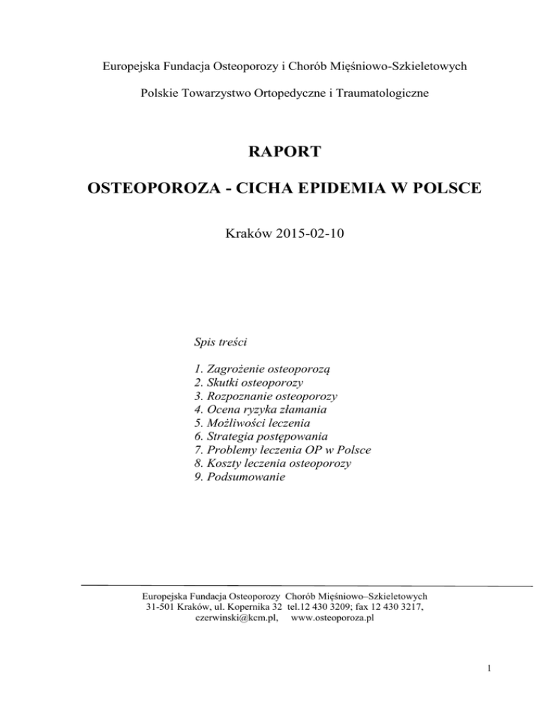 Europejska Fundacja Osteoporozy i Chorób Mięśniowo-Szkieletowych Polskie Towarzystwo Ortopedyczne i Traumatologiczne RAPORT OSTEOPOROZA - CICHA EPIDEMIA W POLSCE Kraków 2015-02-10 Spis treści 1. Zagrożenie osteoporozą 2. Skutki osteoporozy 3. Rozpoznanie osteoporozy 4. Ocena ryzyka złamania 5. Możliwości leczenia 6. Strategia postępowania 7. Problemy leczenia OP w Polsce 8. Koszty leczenia osteoporozy 9. Podsumowanie Europejska Fundacja Osteoporozy Chorób Mięśniowo–Szkieletowych 31-501 Kraków, ul. Kopernika 32 tel.12 430 3209; fax 12 430 3217, [email protected], www.osteoporoza.pl 1 1. ZAGROŻENIE OSTEOPOROZĄ Dane ogólne Osteoporoza należy do najczęstszych schorzeń współczesnego społeczeństwa. Z racji ogromnej liczby chorych, ale zwykle bez objawów, osteoporoza jest nazywana „Cichą epidemią”. Wynika to z faktu, że po 50 r.ż. złamanie występuje u 30% kobiet i 8% mężczyzn. Życiowe ryzyko złamania u kobiety 50-letniej wynosi 40%, a mężczyzny 13%. Złamania osteoporotyczne są przyczyną niesprawności, kalectwa, a nawet śmierci. Do najcięższych złamań należy złamanie bliższego końca kości udowej (bkk udowej). Dane liczbowe Świat 9 000 000 złamań osteoporotycznych na świecie w 2000 r. 1 600 000 złamań bkk udowej 6 260 000 złamań bkk udowej przewidywane w 2050 roku Europa 3 119 000 złamań w 2000r. w tym: 620 tys. kręgosłupa, szyjki kości udowej 490 tys., kości promieniowej 574 tys., w innych miejscach 369 tys. Co 30 sekund następuje jedno złamanie. Polska Liczba osób ze złamaniem osteoporotycznym w 2010r. kobiety 2 247 000 mężczyźni 463 000 razem 2 710 000 Przewidywany wzrost liczby złamań skutkiem starzeniem się społeczeństwa (tab.1). 2025 r. 3 239 564 2035 r. 4 098 878 Małopolska: Populacja po 50 r.ż. kobiety 589 910 mężczyźni 458 261 Szacunkowa liczba osób ze złamaniem osteoporotycznym (30% kobiet, 8% mężczyzn) kobiety 176 973 mężczyźni 36 661 Razem: 213 633 2. SKUTKI OSTEOPOROZY Złamania bliższego końca kości udowej (bkk udowej) Należą do najbardziej niebezpiecznych złamań. Skutkiem powikłań w ciągu roku umiera co 5. kobieta i co 4. mężczyzna. Z osób, które przeżyją, 50% staje się niepełnosprawnymi. Złamania szyjki kości udowej z reguły leczy się operacyjnie, niezależnie od wieku chorego. Najczęściej dokonuje się zespolenia kości, a czasem wszczepienia endoprotezy. Ryzyko 2 złamania bkku jest wyższe niż wystąpienie raka sutka, macicy i jajników razem wziętych, natomiast częstość zgonów z tego powodu jest większa niż z powodu raka piersi. Stanowią one główny koszt leczenia osteoporozy. Złamania kości promieniowej Występują skutkiem upadku. Leczone są najczęściej unieruchomieniem w opatrunku gipsowym. U 40% pacjentów występują powikłania, takie jak: nieprawidłowy zrost, zespoły bólowe, w tym kompleksowy zespół bólu regionalnego (choroba Sudecka). Złamania kręgosłupa Występują u co czwartej kobiety po 50. roku życia i u co drugiej po 85. r.ż. Złamania te są najczęściej bezobjawowe (70%). O przebytym złamaniu może świadczyć obniżenie wzrostu. Przy obniżeniu o 4 cm prawdopodobieństwo złamania jest bardzo wysokie. Złamanie kręgosłupa powoduje pogłębienie kyfozy kręgosłupa piersiowego - tzw. „wdowi garb”. Po złamaniach mogą pojawiać się dolegliwości bólowe. Powstające deformacje sylwetki prowadzą do zmniejszenia pojemności oddechowej płuc, pogorszenia wydolności układu krążeniowo-oddechowego i skłonności do zaparć. W grupie osób ze złamaniami kręgów zauważono zwiększenie śmiertelności w okresie 5 lat o 15-20%. 3. ROZPOZNANIE OSTEOPOROZY Obniżona gęstość mineralna kości jest jednym z najsilniejszych czynników ryzyka złamania. Według zaleceń WHO badanie gęstości mineralnej kości (badanie densytometryczne) powinno być wykonane w szyjce kości udowej lub kręgosłupie, metodą DXA. Pomiary densytometryczne w innych odcinkach szkieletu nie upoważniają do rozpoznania ani kontroli wyników leczenia. Wg WHO wartość wskaźnika T do -1 uznaje się za normę, -1 do -2,4 jest stanem poprzedzającym osteoporozę, natomiast przy poziomie -2,5 i mniej, rozpoznajemy osteoporozę. Prawidłowy wynik badania densytometrycznego nie wyklucza ryzyka złamania, bowiem większość złamań (aż 75%) występuje w grupie chorych z nierozpoznaną osteoporozą (podobnie jak prawidłowe EKG nie wyklucza ryzyka zawału). Stwierdzona na podstawie badania DXA obniżona gęstość mineralna kości (BMD) wymaga diagnostyki różnicowej dla ustalenia czy jest to osteoporoza wynikająca z menopauzy, czy też jest skutkiem innych schorzeń. W tym celu wykonujemy badania krwi i moczu. W badaniu krwi oznaczamy: OB, morfologię, poziom wapnia, fosforu, fosfatazy alkalicznej, kreatyniny, wit. D i innych w zależności od wskazań. W moczu dobowym oznaczamy poziom wapnia, fosforu i kreatyniny, niezależnie od badania ogólnego. 4. OCENA RYZYKA ZŁAMANIA Obniżenie gęstości mineralnej kości jest najsilniejszym czynnikiem ryzyka złamania ale nie jedynym. Powoduje to, że 75% złamań osteoporotycznych – niskoenergetycznych dokonuje się u osób, które nie spełniają kryterium diagnostyczne WHO T-score -2,5. W 2008 roku WHO wprowadziło metodę FRAX do oceny ryzyka złamania. Metoda pozwala na obliczenie ryzyka online nawet bez badania densytometrycznego, program oblicza ryzyko na podstawie występujących czynników ryzyka takich jak: Przebyte złamanie, złamanie bkk udowej u rodziców, palenie przez rodziców, stosowanie glikokortykosterydów, RZS, osteoporozy wtórne, alkoholizm. Program dostępny jest m.in. www.osteoproza.pl. W Polsce wprowadziliśmy ręczny kalkulator FRAX, który umożliwia obliczenie ryzyka złamania osobom nie mającym dostępu do internetu. 3 5. MOŻLIWOŚCI LECZENIA Celem leczenia osteoporozy jest uniknięcie złamania i poprawa jakości życia. Na leczenie składa się: a) Uzupełnie