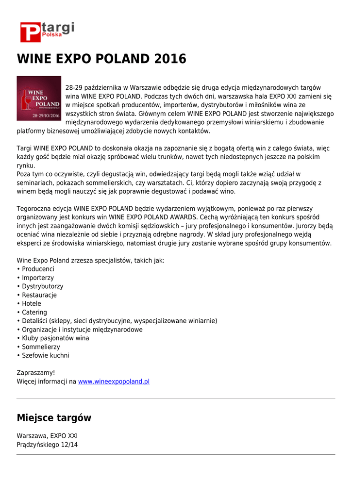 WINE EXPO POLAND 2016 28-29 października w Warszawie odbędzie się druga edycja międzynarodowych targów wina WINE EXPO POLAND. Podczas tych dwóch dni, warszawska hala EXPO XXI zamieni się w miejsce spotkań producentów, importerów, dystrybutorów i miłośników wina ze wszystkich stron świata. Głównym celem WINE EXPO POLAND jest stworzenie największego międzynarodowego wydarzenia dedykowanego przemysłowi winiarskiemu i zbudowanie platformy biznesowej umożliwiającej zdobycie nowych kontaktów. Targi WINE EXPO POLAND to doskonała okazja na zapoznanie się z bogatą ofertą win z całego świata, więc każdy gość będzie miał okazję spróbować wielu trunków, nawet tych niedostępnych jeszcze na polskim rynku. Poza tym co oczywiste, czyli degustacją win, odwiedzający targi będą mogli także wziąć udział w seminariach, pokazach sommelierskich, czy warsztatach. Ci, którzy dopiero zaczynają swoją przygodę z winem będą mogli nauczyć się jak poprawnie degustować i podawać wino. Tegoroczna edycja WINE EXPO POLAND będzie wydarzeniem wyjątkowym, ponieważ po raz pierwszy organizowany jest konkurs win WINE EXPO POLAND AWARDS. Cechą wyróżniającą ten konkurs spośród innych jest zaangażowanie dwóch komisji sędziowskich – jury profesjonalnego i konsumentów. Jurorzy będą oceniać wina niezależnie od siebie i przyznają odrębne nagrody. W skład jury profesjonalnego wejdą eksperci ze środowiska winiarskiego, natomiast drugie jury zostanie wybrane spośród grupy konsumentów. Wine Expo Poland zrzesza specjalistów, takich jak: • Producenci • Importerzy • Dystrybutorzy • Restauracje • Hotele • Catering • Detaliści (sklepy, sieci dystrybucyjne, wyspecjalizowane winiarnie) • Organizacje i instytucje międzynarodowe • Kluby pasjonatów wina • Sommelierzy • Szefowie kuchni Zapraszamy! Więcej informacji na www.wineexpopoland.pl Miejsce targów Warszawa, EXPO XXI Prądzyńskiego 12/14 Organizator WINE EXPO POLAND Warszawa Grójecka 22/24 22 66 88 66 9 [email protected]