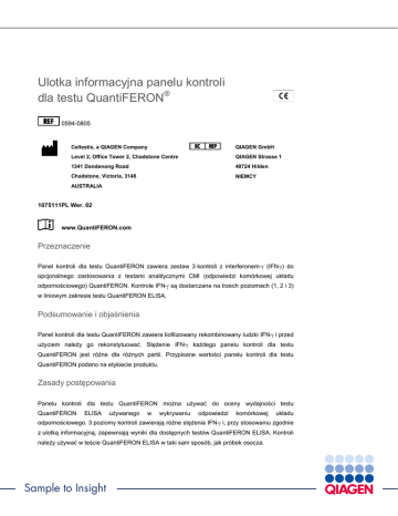 Ulotka informacyjna panelu kontroli dla testu QuantiFERON® 0594-0805 Cellestis, a QIAGEN Company QIAGEN GmbH Level 2, Office Tower 2, Chadstone Centre QIAGEN Strasse 1 1341 Dandenong Road 40724 Hilden Chadstone, Victoria, 3148 NIEMCY AUSTRALIA 1075111PL Wer. 02 www.QuantiFERON.com Przeznaczenie Panel kontroli dla testu QuantiFERON zawiera zestaw 3 kontroli z interferonem-γ (IFN-γ) do opcjonalnego zastosowania z testami analitycznymi CMI (odpowiedzi komórkowej układu odpornościowego) QuantiFERON. Kontrole IFN-γ są dostarczane na trzech poziomach (1, 2 i 3) w liniowym zakresie testu QuantiFERON ELISA. Podsumowanie i objaśnienia Panel kontroli dla testu QuantiFERON zawiera liofilizowany rekombinowany ludzki IFN-γ i przed użyciem należy go rekonstytuować. Stężenie IFN-γ każdego panelu kontroli dla testu QuantiFERON jest różne dla różnych partii. Przypisane wartości panelu kontroli dla testu QuantiFERON podano na etykiecie produktu. Zasady postępowania Panelu kontroli dla testu QuantiFERON można używać do oceny wydajności testu QuantiFERON ELISA używanego w wykrywaniu odpowiedzi komórkowej układu odpornościowego. 3 poziomy kontroli zawierają różne stężenia IFN-γ i, przy stosowaniu zgodnie z ulotką informacyjną, zapewniają wyniki dla dostępnych testów QuantiFERON ELISA. Kontroli należy używać w teście QuantiFERON ELISA w taki sam sposób, jak próbek osocza. Sample to Insight__ Odczynniki i przechowywanie Panel kontroli dla testu QuantiFERON (nr kat. 0594-0805) Ilość Kontrola QuantiFERON IFN-γ — poziom 1 3 fiolki Kontrola QuantiFERON IFN-γ — poziom 2 3 fiolki Kontrola QuantiFERON IFN-γ — poziom 3 3 fiolki Ulotka informacyjna 1 Liofilizowane kontrole dla testu QuantiFERON należy przechowywać w temperaturze od 2°C do 8°C. Produkt należy zużyć przed wskazaną datą ważności. Rekonstytuowane kontrole dla testu QuantiFERON należy przechowywać w temperaturze od 2°C do 8°C i wykorzystać w ciągu 28 dni od rekonstytuowania. Ostrzeżenia i środki ostrożności Do celów diagnostyki in vitro W czasie pracy ze środkami chemicznymi należy zawsze używać odpowiedniego fartucha laboratoryjnego, rękawiczek jednorazowych i okularów ochronnych. W celu uzyskania dodatkowych informacji należy zapoznać się z kartami charakterystyki (ang. Safety Data Sheet, SDS). Są one dostępne w Internecie w wygodnym formacie PDF pod adresem www.qiagen.com/safety. Na tej stronie można wyszukiwać, wyświetlać i drukować karty charakterystyki dla wszystkich zestawów i składników zestawów. Poziom 1 panelu kontroli dla testu QuantiFERON Zawiera: ProClin 300. Ostrzeżenie! Może powodować reakcję alergiczną ® skóry. Nosić rękawice ochronne/odzież ochronną/okulary ochronne/osłonę twarzy. Poziom 2 panelu kontroli dla testu QuantiFERON Zawiera: ProClin 300. Ostrzeżenie! Może powodować reakcję alergiczną skóry. Nosić rękawice ochronne/odzież ochronną/okulary ochronne/osłonę twarzy. Poziom 3 panelu kontroli dla testu QuantiFERON Zawiera: ProClin 300. Ostrzeżenie! Może powodować reakcję alergiczną skóry. Nosić rękawice ochronne/odzież ochronną/okulary ochronne/osłonę twarzy. Ulotka informacyjna panelu kontroli dla testu QuantiFERON 08/2015 2 Wskazówki dotyczące stosowania 1. Ogrzać zestaw 3 kontroli (poziomy 1, 2 i 3) do temperatury pokojowej (od 17°C do 27°C). 2. Rekonstytuować zawartość każdej fiolki przy użyciu 0,25 ml wody destylowanej lub dejonizowanej o temperaturze pokojowej (od 17°C do 27°C), upewniając się, że doszło do pełnego ponownego zawieszenia. Wymieszać kilkukrotnie delikatnie odwracając, aby zminimalizować spienienie. 3. Przed dodaniem kontroli lub próbki dodać 50 µl świeżo przygotowanego koniugatu w stężeniu roboczym do odpowiednich studzienek testu ELISA. 4. Dodać 50 µl każdego zrekonstytuowanego poziomu kontroli do odpowiednich studzienek testu ELISA. 5. Po dodaniu próbki i kontroli dodać 50 µl standardów do odpowiednich studzienek testu ELISA, w miarę możliwości ograniczając do minimum opóźnienia pomiędzy kolejnymi dodaniami. 6. Po użyciu zestaw 3 zrekonstytuowanych kontroli należy natychmiast umieścić w temperaturze od 2°C do 8°C. 7. Przetestować 3 zrekonstytuowane kontrole w taki sam sposób, jakby były próbkami osocza zgodnie z ulotką informacyjną do opakowania wykonywanego testu QuantiFERON ELISA (gdzie kontrola poziomu 1 zastępuje zerową próbkę osocza, kontrola poziomu 2 zastępuje antygenową próbkę osocza, a kontrola poziomu 3 zastępuje mitogenową próbkę osocza). Wyliczenia dla próbki Instrukcje dotyczące wyliczania wyników dla próbki zawarto na ulotkach informacyjnych odpowiedniego testu QuantiFERON ELISA. Do wyliczania wartości panelu kontroli dla testu QuantiFERON można używać oprogramowania analitycznego QuantiFERON. Przy korzystaniu z tego oprogramowania należy przypisać każdy poziom panelu kontroli dla testu QuantiFERON jako próbkę. Wartości ostateczne można uzyskać z raportu oprogramowania. Ulotka informacyjna panelu kontroli dla testu QuantiFERON 08/2015 3 Interpretacja wyników Wszystkie partie panelu kontroli dla testu QuantiFERON poddano testom kontroli jakości przy użyciu wielu partii zestawu testu ELISA w celu określenia przypisanego zakresu stężeń IFN-γ. Średnie stężenie nadrukowano na etykiecie każdej fiolki, a zakresy wartości średnich i oczekiwanych podano na etykiecie z danymi technicznymi przyklejonej po wewnętrznej stronie opakowania każdego zestawu. Wskazany zakres wartości średnich i oczekiwanych to wyłącznie wytyczne do oceniania działania testu QuantiFERON w poszczególnych laboratoriach. Należy określić ważność testu QuantiFERON ELISA w sposób opisany na ulotce informacyjnej testu ELISA. Może występować zmienność związana z tymi typowymi wynikami w zależności od różnic w stosowanej w laboratorium technice, urządzeniach, partiach odczynników oraz inny