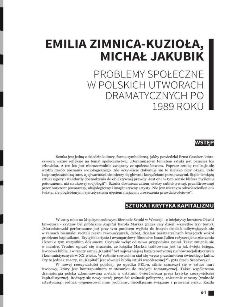EMILIA ZIMNICA-KUZIOŁA, MICHAŁ JAKUBIK PROBLEMY SPOŁECZNE W POLSKICH UTWORACH DRAMATYCZNYCH PO 1989 ROKU WSTĘP Sztuka jest jedną z dziedzin kultury, formą symboliczną, jakby powiedział Ernst Cassirer, która zawiera ważne refleksje na temat społeczeństwa: „Dominującym tematem sztuki jest przecież los człowieka. A ten los jest nierozerwalnie związany ze społeczeństwem. Poprzez sztukę realizuje się istotny zasób poznania socjologicznego. Ale oczywiście dokonuje się to niejako przy okazji. Cele i aspiracje sztuki są inne, a jej wartości nie mierzy się głównie korzyściami poznawczymi. Stąd nie wiążą sztuki rygory i standardy dochodzenia do obiektywnej prawdy. Jest ona w tym sensie bliższa myśleniu potocznemu niż naukowej socjologii”1. Sztuka dostarcza zatem wiedzy subiektywnej, przefiltrowanej przez horyzont poznawczy, aksjologiczny i imaginatywny artysty. Nie jest wiernym odzwierciedleniem świata, ale pogłębionym, syntetycznym ujęciem mającym „roszczenia prawdziwościowe”. SZTUKA I KRYTYKA KAPITALIZMU W 2015 roku na Międzynarodowym Biennale Sztuki w Wenecji - z inicjatywy kuratora Okwui Enwezora - czytany był publicznie Kapitał Karola Marksa (przez cały dzień, wszystkie trzy tomy). „Marksistowski performance jest przy tym punktem wyjścia do innych działań odbywających się w ramach biennale: recitali pieśni rewolucyjnych, debat, działań parateatralnych krążących wokół problemu kapitalizmu. Brytyjski artysta i awangardowy filmowiec Isaac Julien reżyseruje te zdarzenia i kręci o tym wszystkim dokument. Czytanie wciąż od nowa przypomina rytuał. Tekst zmienia się w mantrę. Trudno oprzeć się wrażeniu, że książka Marksa traktowana jest tu jak święta księga, lewicowa biblia. I w rzeczy samej „Kapitał” był najważniejszą bazą teoretyczną ruchów socjalistycznych i komunistycznych w XX wieku. W reżimie sowieckim stał się wręcz przedmiotem świeckiego kultu. Czy to jednak znaczy, że „Kapitał” jest również biblią sztuki współczesnej?”- pyta Stach Szabłowski2. W nowej rzeczywistości polskiej, po upadku PRL-u, silnie zaznaczył się w sztuce nurt lewicowy, który jest kontrapunktem w stosunku do tradycji romantycznej. Także współczesna dramaturgia polska zdominowana została w ostatnim ćwierćwieczu przez krytykę rzeczywistości kapitalistycznej. Rodzący się nowy ustrój przyniósł wolność polityczną, zniesienie cenzury (wolność artystyczną), jednak wygenerował inne problemy, nieodłącznie związane z prawami rynku. Każda 61 transformacja przynosi zmiany o „bilansie ambiwalentnym”, nie mogło być inaczej w przypadku przeobrażeń politycznych, ekonomicznych i kulturowych w Polsce. Socjologowie piszą o dualizmie wartości, o dezorganizacji, dezorientacji kulturowej, a nawet o zbiorowej traumie, czyli o wstrząsie spowodowanym zmianą społeczną. „Była to zmiana szybka, obejmująca wszystkie dziedziny życia społecznego, dotykająca samych fundamentów aksjologicznych systemu społecznego, dla większości ludzi - zaskakująca i niespodziewana. Nie trzeba dodawać, że przez większość przyjmowana była z entuzjazmem i nadzieją”3. Wiele spośród dramatów, które zostały napisane po 1989 roku (nie wszystkie były wystawiane na polskich scenach teatralnych), w warstwie fabularnej realizuje dyskurs traumy, dotyczy kondycji polskiego społeczeństwa w stanie anomii i stanowi subiektywny komentarz do problemów współczesności. Nie sposób nie zauważyć, że autorzy dramatów zdają się nie dostrzegać pozytywnych stron przemiany i akcentują, by nie powiedzieć hiperbolizują, negatywne skutki zmian. W 2003 roku ukazała się głośna antologia Romana Pawłowskiego Pokolenie Porno i inne niesmaczne utwory teatralne (Wydawnictwo Zielona Sowa, Kraków)4, w 2006 roku ten sam autor przygotował do druku następny zbiór dramatów Made in Poland (Korporacja Ha! art & Horyzonty, Kraków)5. Kolejną antologię, wydano w dwóch tomach (w 2012 i 2013 roku), Trans/formacja. Dramat polski po 1989 roku - wyboru tekstów dokonał Jacek Kopciński (Wydawnictwo Instytutu Badań Literackich PAN, Warszawa)6. Było jeszcze kilka zbiorowych wydań polskich utworów dramatycznych, jednak wyżej wymienione są z pewnością najciekawsze. Polska dramaturgia współczesna (teatralna, filmowa, radiowa i telewizyjna) publikowana jest systematycznie w miesięczniku Dialog. Czy można znaleźć wspólny mianownik kilkudziesięciu utworów dramatycznych zebranych w wielu tomach? Nie jest to łatwe zadanie, ale warto podjąć próbę ich omówienia z perspektywy odniesień do rzeczywistości polskiej. Warto dodać, że cztery wymienione antologie nie są w pełni reprezentatywne dla polskiej dramaturgii – nie zawierają wszystkich tekstów ważnych, ale wyłączonych z publikacji choćby ze względu na brak zgody ich autorów (Tadeusz Różewicz, Tadeusz Słobodzianek, Paweł Demirski). Na podstawie lektury polskich utworów dramatycznych ostatniego ćwierćwiecza, chcę wypunktować zjawiska społeczne w Polsce przełomu wieków, w skali mikro, mezzo i makro, podlegające nasilonej krytyce. Większość problemów jest efektem przemian ustrojowych, ale są też problemy związane z ekspansją technologiczną, z dominującą kulturą internetu: - kontrasty ekonomiczne, pauperyzacja znacznej części społeczeństwa, nierówności społeczne, wykluczenie, reprodukcja biedy, - bezrobocie, obawa utraty pracy, brak perspektyw dla młodych ludzi, emigracja zarobkowa, - konsumpcjonizm, szybkie tempo życia, „wyścig szczurów”, nastawienie na sukces materialny, - pojawienie się wielu zagrożeń, brutalizacja rzeczywistości - przemoc, społeczne patologie, - samotność, niezaspokojona tęsknota za miłością, eksponowanie jej cielesnego, biologicznego wymiaru, - zanik więzi sąsiedzkich, lokalnych, - toksyczne relacje rodzinne, marginalizowanie osób starszych, banalizacja śmierci, - 