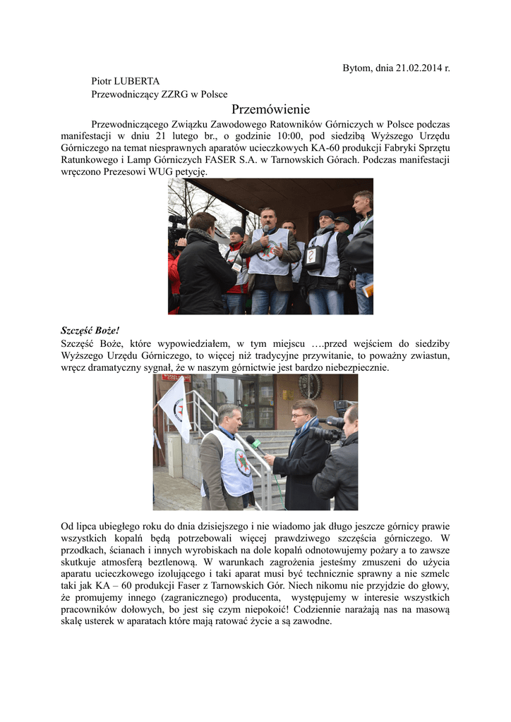 Bytom, dnia 21.02.2014 r. Piotr LUBERTA Przewodniczący ZZRG w Polsce Przemówienie Przewodniczącego Związku Zawodowego Ratowników Górniczych w Polsce podczas manifestacji w dniu 21 lutego br., o godzinie 10:00, pod siedzibą Wyższego Urzędu Górniczego na temat niesprawnych aparatów ucieczkowych KA-60 produkcji Fabryki Sprzętu Ratunkowego i Lamp Górniczych FASER S.A. w Tarnowskich Górach. Podczas manifestacji wręczono Prezesowi WUG petycję. Szczęść Boże! Szczęść Boże, które wypowiedziałem, w tym miejscu ….przed wejściem do siedziby Wyższego Urzędu Górniczego, to więcej niż tradycyjne przywitanie, to poważny zwiastun, wręcz dramatyczny sygnał, że w naszym górnictwie jest bardzo niebezpiecznie. Od lipca ubiegłego roku do dnia dzisiejszego i nie wiadomo jak długo jeszcze górnicy prawie wszystkich kopalń będą potrzebowali więcej prawdziwego szczęścia górniczego. W przodkach, ścianach i innych wyrobiskach na dole kopalń odnotowujemy pożary a to zawsze skutkuje atmosferą beztlenową. W warunkach zagrożenia jesteśmy zmuszeni do użycia aparatu ucieczkowego izolującego i taki aparat musi być technicznie sprawny a nie szmelc taki jak KA – 60 produkcji Faser z Tarnowskich Gór. Niech nikomu nie przyjdzie do głowy, że promujemy innego (zagranicznego) producenta, występujemy w interesie wszystkich pracowników dołowych, bo jest się czym niepokoić! Codziennie narażają nas na masową skalę usterek w aparatach które mają ratować życie a są zawodne. Brak podstaw do twierdzenia, że ZZRG w Polsce promuje obcego wytwórcę, to by było obrzydliwe pomówienie, skandaliczna wręcz prowokacja, więc dopowiem, że ta sprawa tak długo się ciągnie właśnie dlatego, że robiliśmy wszystko aby chronić polskiego wytwórcę, naszego wytwórcę, miejsca pracy polskiego robotnika. Aktualnie ryzyko już jest nietolerowane. Twierdzenie. że masowe awarie aparatów są powodem złego użytkowania jest idiotycznym wymysłem producenta. Aparat nie przejdzie żadnych pomyślnych wyników po testach wstrząsowo wibracyjnych symulujących pracę aparatu po kilku latach użytkowania. Zagraniczne laboratorium to potwierdzi, mamy takie badania wykonane w akredytowanym laboratorium zagranicznym, niech sobie WUG wydaje pieniądze. Usterki są stwierdzone podczas szkoleń i wyrywkowych kontroli. Prawie wszystkie kopalnie w latach 2009 – 2013 zakupiły w firmie Faser 80 000 sztuk aparatów KA -60 wydając ponad 80 000 000 zł. Przedsiębiorcy spełnili swój obowiązek wynikający z przepisów górniczych, ale czy do końca! Po pierwszych złych opiniach pokontrolnych od lipca 2013 r. do dziś skontrolowano u producenta w jego laboratorium wyposażone w specjalistyczne oprzyrządowanie, 23 109 aparatów z lat produkcji 2009 – 2010 a pozostało z tych lat do przebadania jeszcze 12 220 szt. Stwierdza się, że jest do 30 % usterek i nieprawidłowości, które podlegały naprawie – to wynika z analizy protokółów i oficjalnych dokumentów z kopalń i u producenta. Trzeba w trybie od natychmiast wycofać z ruchu 12 220 sztuk aparatów bo ich użytkowanie na dole jest śmiertelnie niebezpieczne a resztę aparatów z produkcji z lat 2011 do 2014 poddać badaniom wyrywkowym (losowym) i w zależności od uzyskanych wyników podjąć kolegialne decyzje. Takim badaniom losowym trzeba też poddawać aparaty naprawione i z lat od 2009. Pomimo pięcioletniego okresu użytkowania aparatu od czasu wprowadzenia do użytkowania aż 30 % aparatów jest niesprawnych. W dzień w dzień górnicy użytkują prawie 50 000 aparatów ucieczkowych niezbadanych a w nich czyhają usterki. Co trzeci górnik może zginąć podczas ewakuacji ze strefy zagrożonej, bo może mieć pecha i użyć niesprawny aparat. Tu i teraz pytam…kiedy w końcu: • przebadają lub wymienią pozostałe aparaty ucieczkowe KA – 60 i zdejmą z nas obawy o życie? • dlaczego musimy pytać o tak ważne sprawy na ulicy? • dlaczego nie wsłuchano się w nasz głos podczas prac w Komisji Bezpieczeństwa? Tymi zatrważającymi informacjami wymieniają się w korespondencji od lipca przedsiębiorcy, producent Faser, Wyższy i okręgowe organa nadzoru górniczego, PIP, CIOP. Ileż można pisać, wprawdzie wykonano dodatkową kontrole produkcji, audit w firmie i wyrywkowe badania aparatów i na tym koniec – jakie wnioski, jakie decyzje, gdzie bezpieczeństwo pracy przecież wciąż użytkujemy w masowych ilościach niesprawne aparaty, aparaty z ukrytymi wewnątrz wadami. Manifestanci, podam te główne ujawnione wady, a oto one: nieszczelność aparatów i pochłaniaczy, która skutkuje reakcją chemiczną masy tlenotwórczej, dziurawych lub posklejanych worków oddechowych, zwietrzałej masy tlenotwórczej rozpylonej w przestrzeni aparatu, zawieszających się zaworów upustowych, skruszonych uszczelek i węży oddechowych, wadliwie działających zacisków nosowych. To jest dyskwalifikacja aparatów, przecież te wady nie pozwalają na bezpieczna ewakuację zagrożonych górników. Aparat nie odizoluje nas od atmosfery niezdatnej do oddychania w zagrożonym rejonie kopalni. Wystarczy jedna z wymienionych usterek i mamy wykonany wyrok śmierci. „Górnicy nie przestępcy nam też znieście kare śmierci” Kilka ważnych faktów: W lipcu ubiegłego roku po opiniach wskazujących na awaryjność aparatów ucieczkowych KA – 60, zauważonych w trakcie ćwiczeń, przedsiębiorcy górniczy i producent Faser doszli do wniosku o konieczności przeprowadzenia wyrywkowych badań sprawdzających. Z analizy otrzymanych danych wynikało, że usterki są przede wszystkim usterkami technicznymi. WUG i CIOP w ramach swoich kompetencji przeprowadzili kontrolę cyklu produkcyjnego aparatów KA – 60 z rezultatem znanym, to też efekty mamy ich działalności do dziś. Po ich przeglądach u producenta, dowiedzieli się za jakiś czas, co z praktyki użytkowania aparatów wynika….masowe usterki techniczne. „N